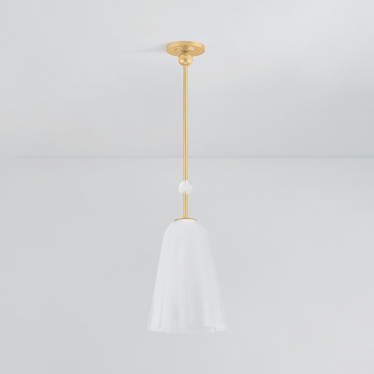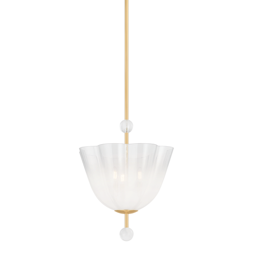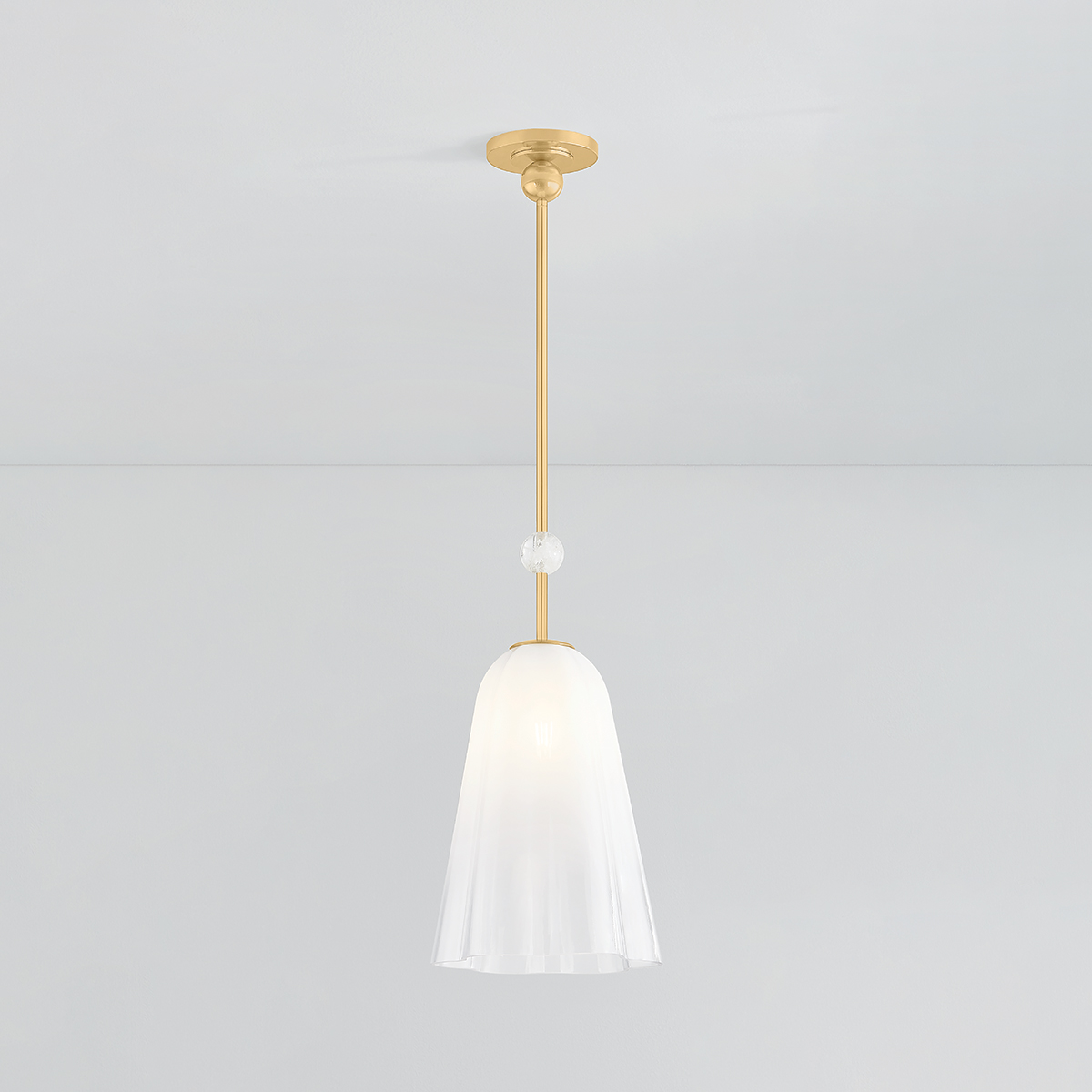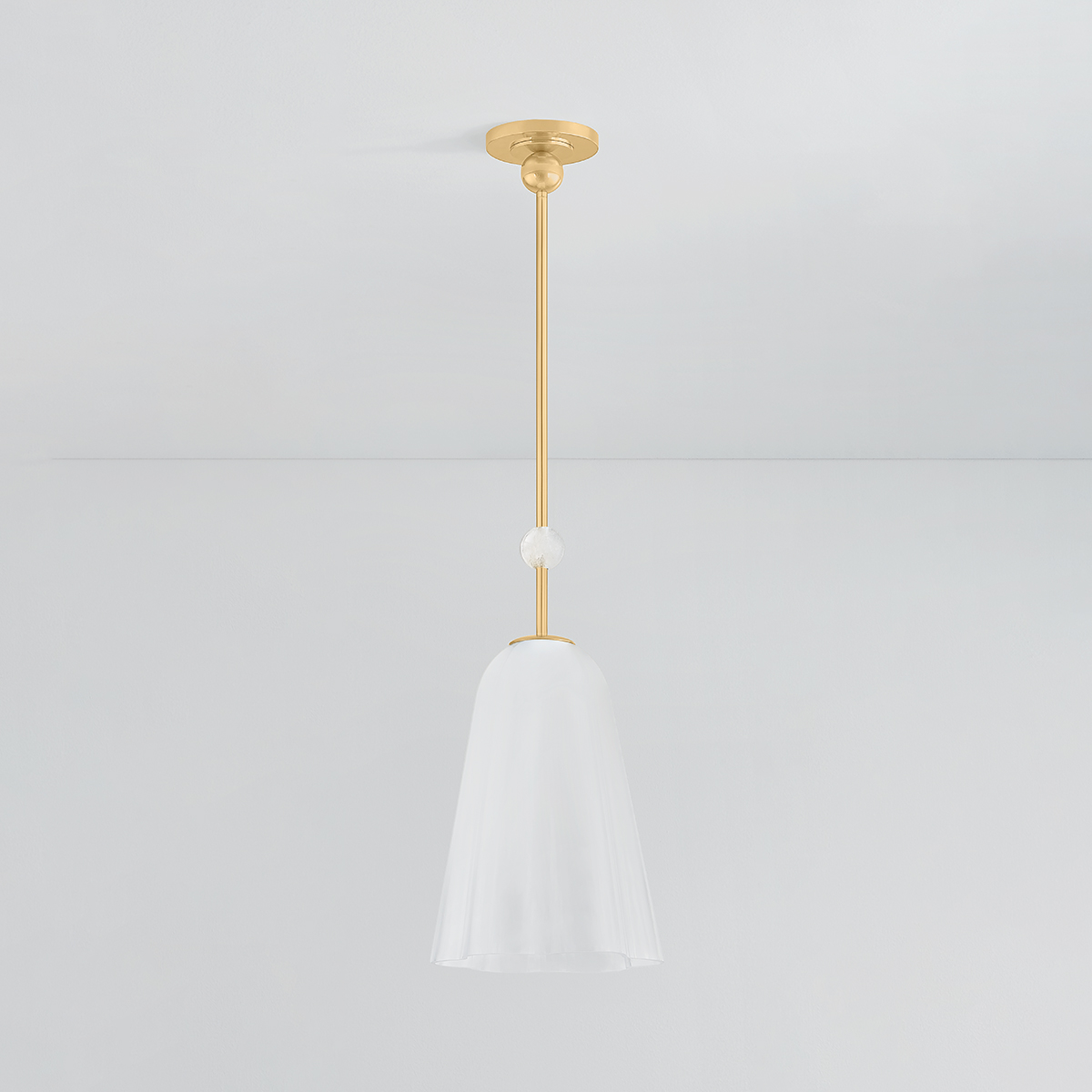 Soft and airy in form, Cambria Heights brings nature-inspired drama to a ceiling. A misty Sfumato glass shade with gently scalloped edges appears to float mid-air in both the pendant and lantern. Adding to the decorative nature of the specialty glass is a gem-like rock crystal ornament. Finished in Aged Brass, the central rod provides sleek support for this ethereal fixture.