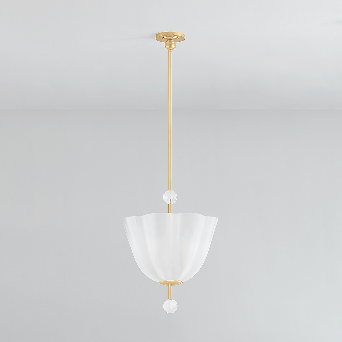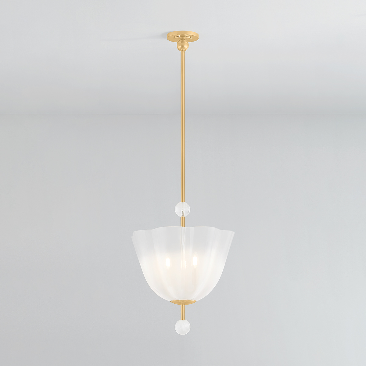 Soft and airy in form, Cambria Heights brings nature-inspired drama to a ceiling. A misty Sfumato glass shade with gently scalloped edges appears to float mid-air in both the pendant and lantern. Adding to the decorative nature of the specialty glass is a gem-like rock crystal ornament. Finished in Aged Brass, the central rod provides sleek support for this ethereal fixture.