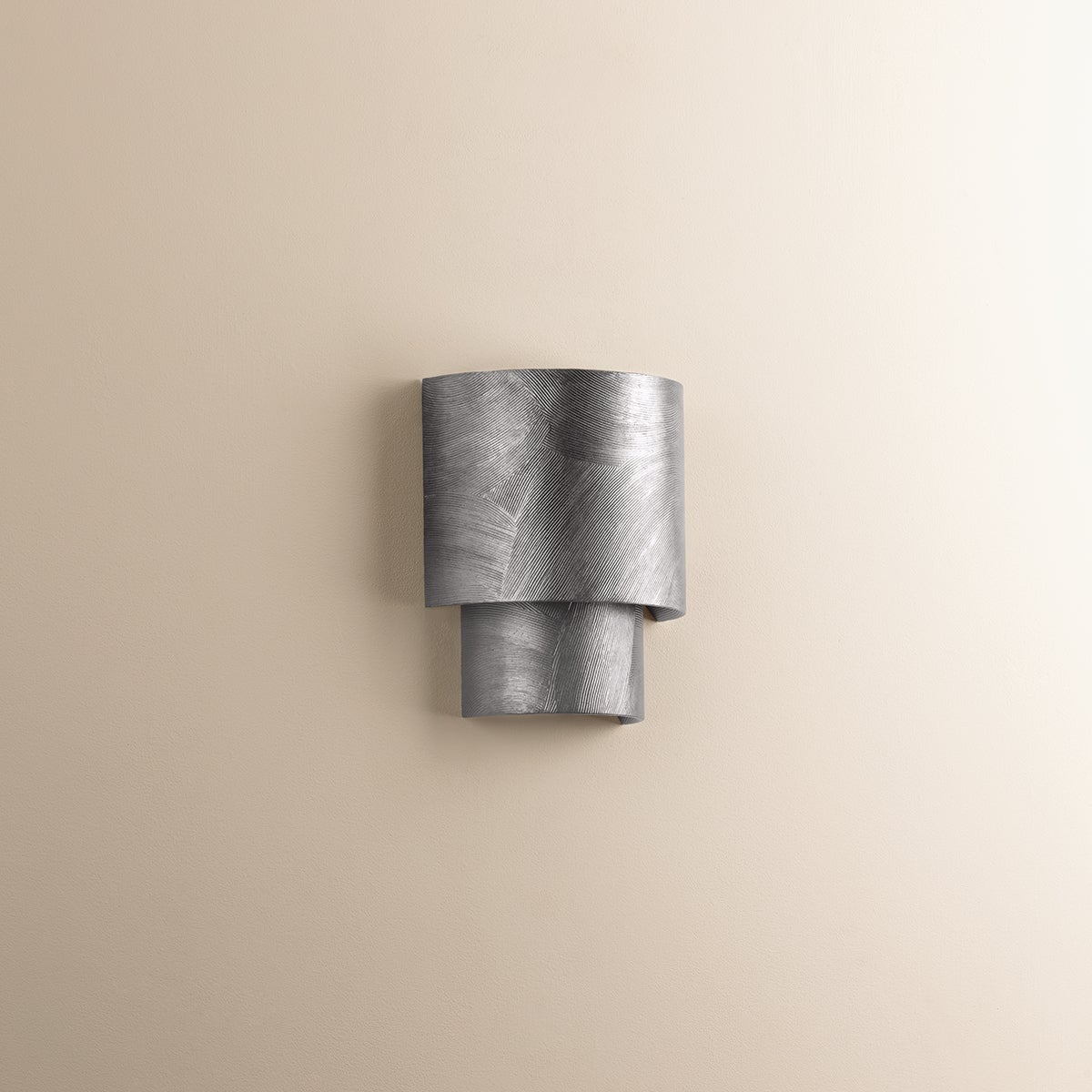 The architectural Moray sconce features a two-layered design with a unique texture. Two metal panels curve away from the wall to form the slightly nested, minimalist shade shape. Available in a troweled Vintage Gold Leaf or Black Silver Leaf, the painterly finishes of Moray are artistic and tactile. This versatile sconce can be used in pairs to frame a doorway or line a hallway.