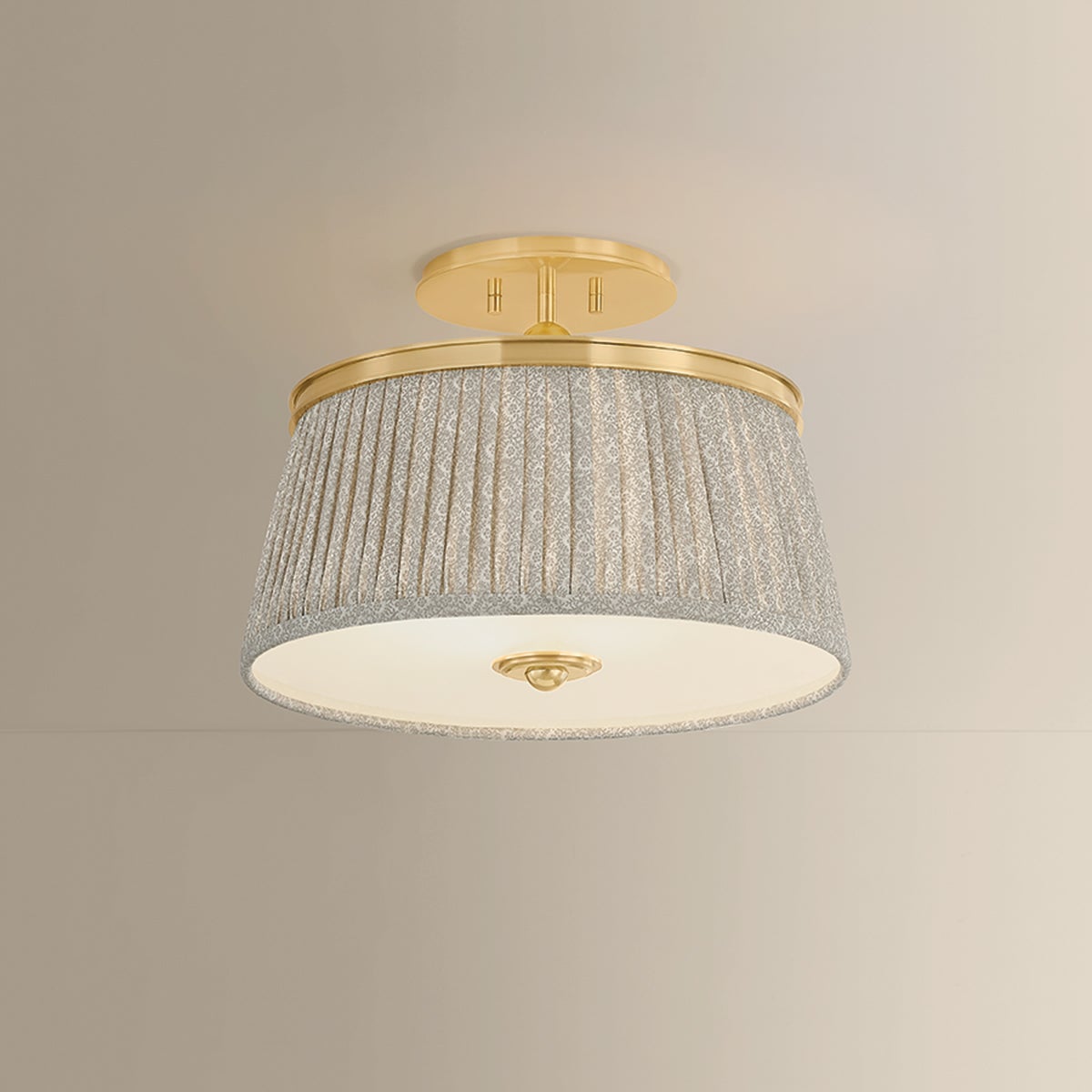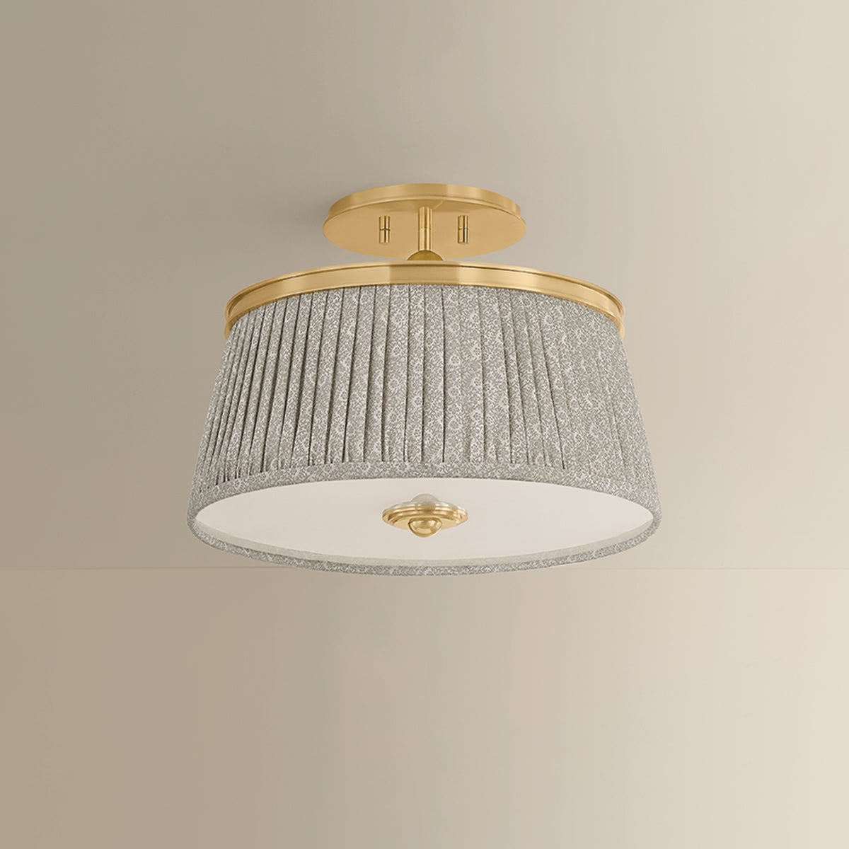 Recalling the design aesthetics of Adolf Loos, the Valeria family updates modern silhouettes with a hint of countryside charm. Softly gathered linen shades are printed with a gray-and-white botanical pattern, infusing the design with warmth and whimsy. A clear etched glass diffuser at the base softens the light into an inviting glow. Finished in Aged Brass, the metalwork is accented by decorative bauble detailing. Valeria is available as a 1- or 3-light pendant, a 2-light semi flush mount, and a 3-light linear.