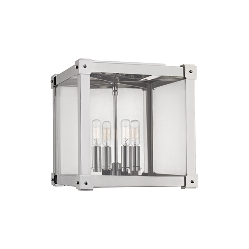 Suspended in a glass cube, exposed-filament bulbs huddle round a central rod on a simple candle tree of nickel, brass, or bronze. Machined edges and pinned corner-sleeves add handsome details to the piece. Its metal frame allows for a dramatic splash of shadow.