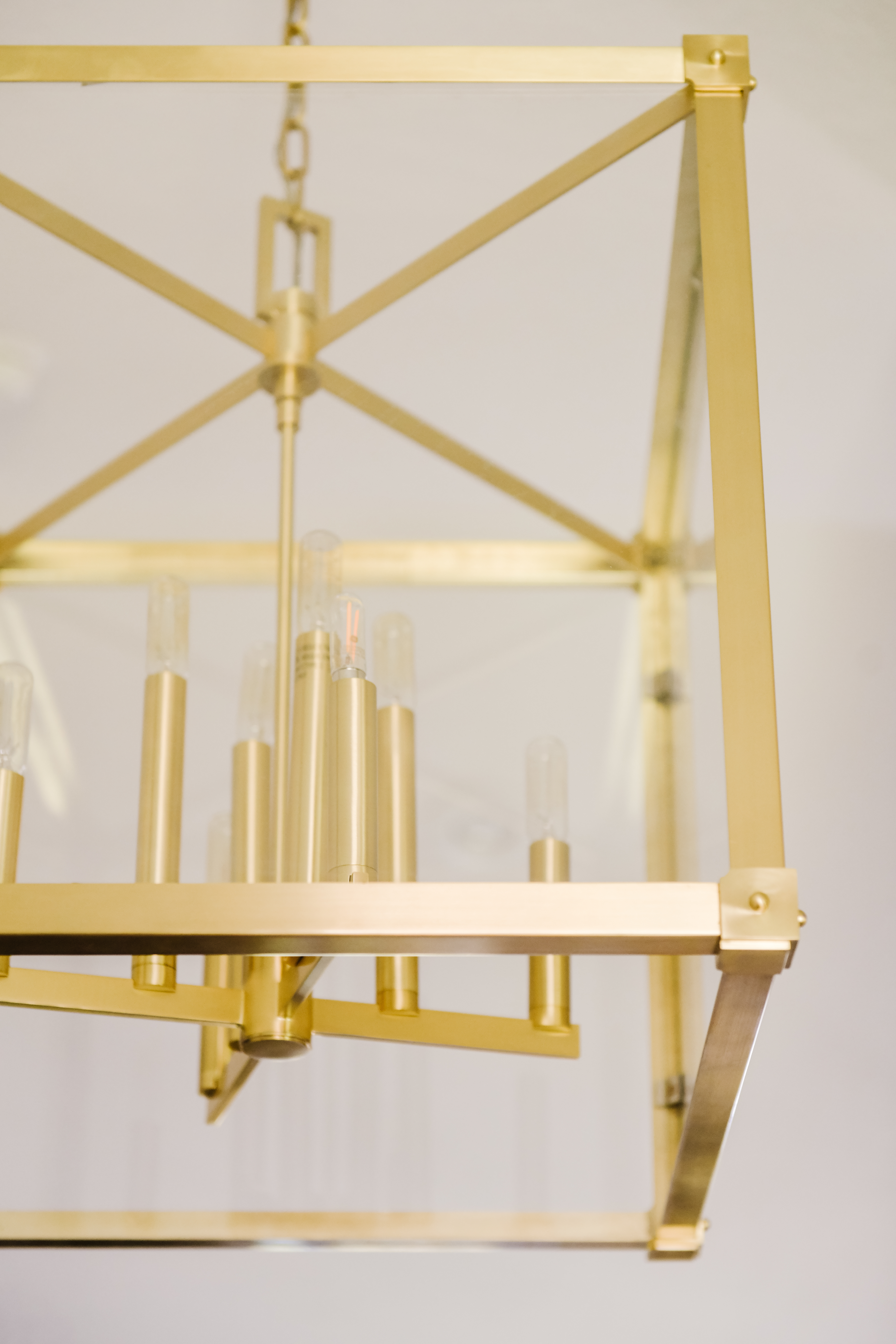 Suspended in a glass cube, exposed-filament bulbs huddle round a central rod on a simple candle tree of nickel, brass, or bronze. Machined edges and pinned corner-sleeves add handsome details to the piece. Its metal frame allows for a dramatic splash of shadow.