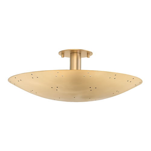 The streamlined, disc-shaped form of Bern gives this flush mount a distinctly futuristic feel. The shade’s minimalist design is enhanced by perforated details that draw the eye. As light filters through the perforations, it creates a starry effect that is particularly striking against the deep finishes. Available in two sizes with a Vintage Brass finish or a Vintage Brass and Bronze combination.