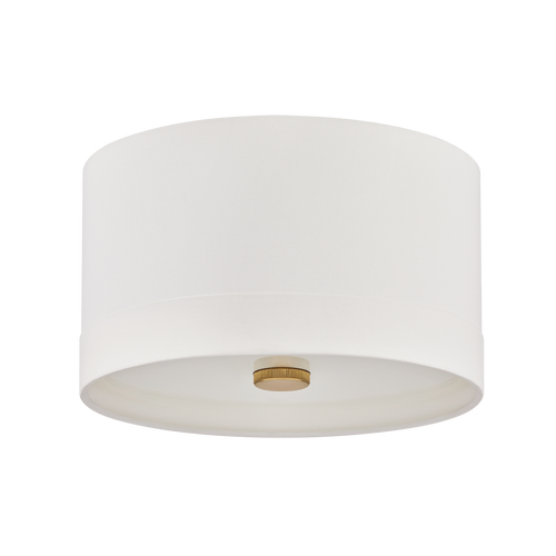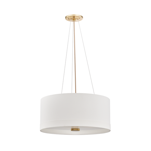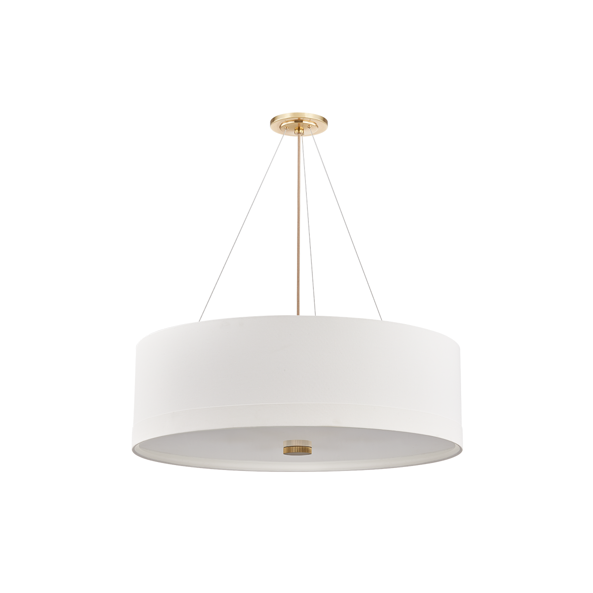 The Ashland family reimagines a modern drum silhouette with oversized proportions and polished details. A white linen shade is complemented by an Aged Brass-finished canopy and finial. Fitted into the shade, an etched glass diffuser provides a soft, even glow around a large space. With two sizes of flush mount and two pendant options, Ashland is a crisp, timeless solution for an entryway, dining area, or living room.