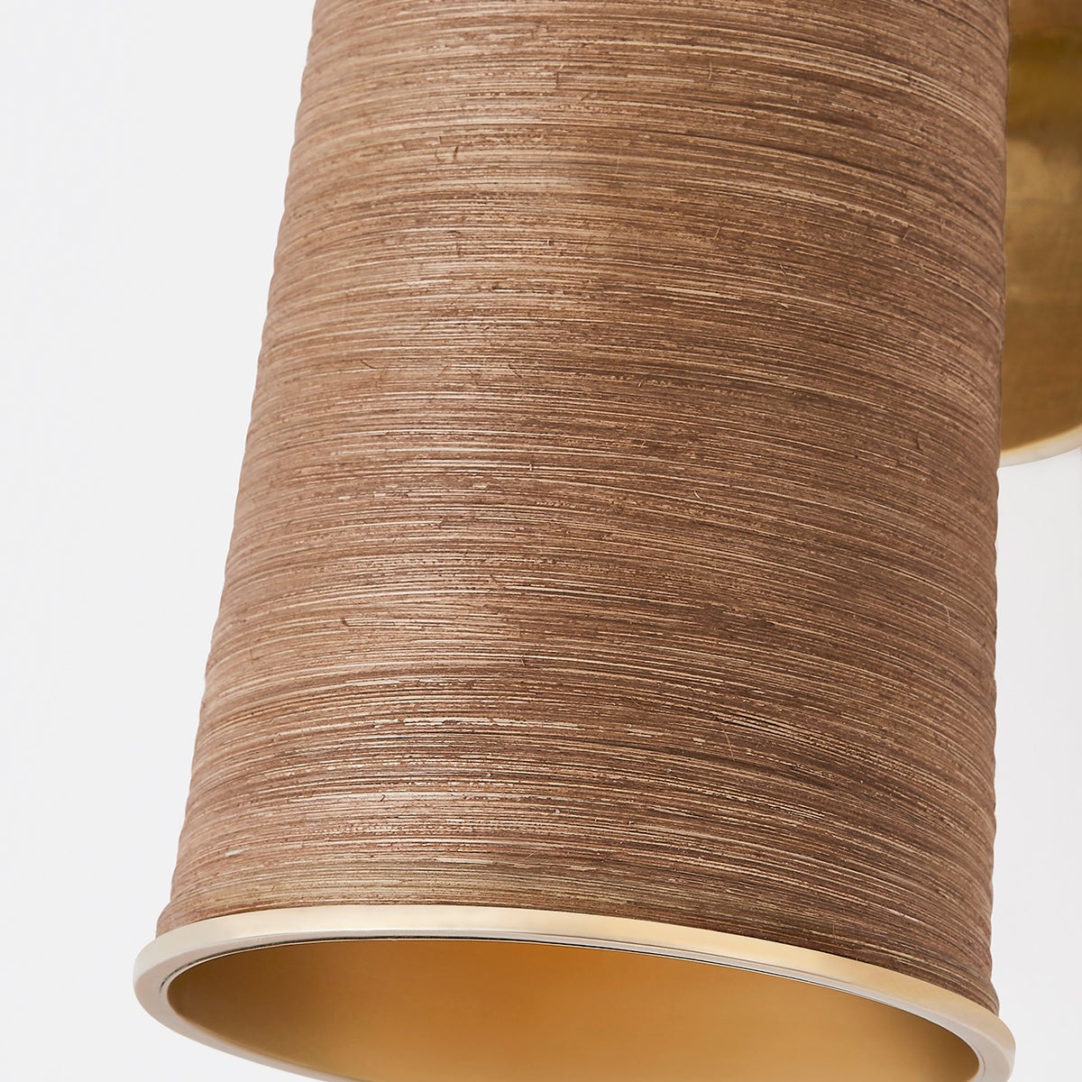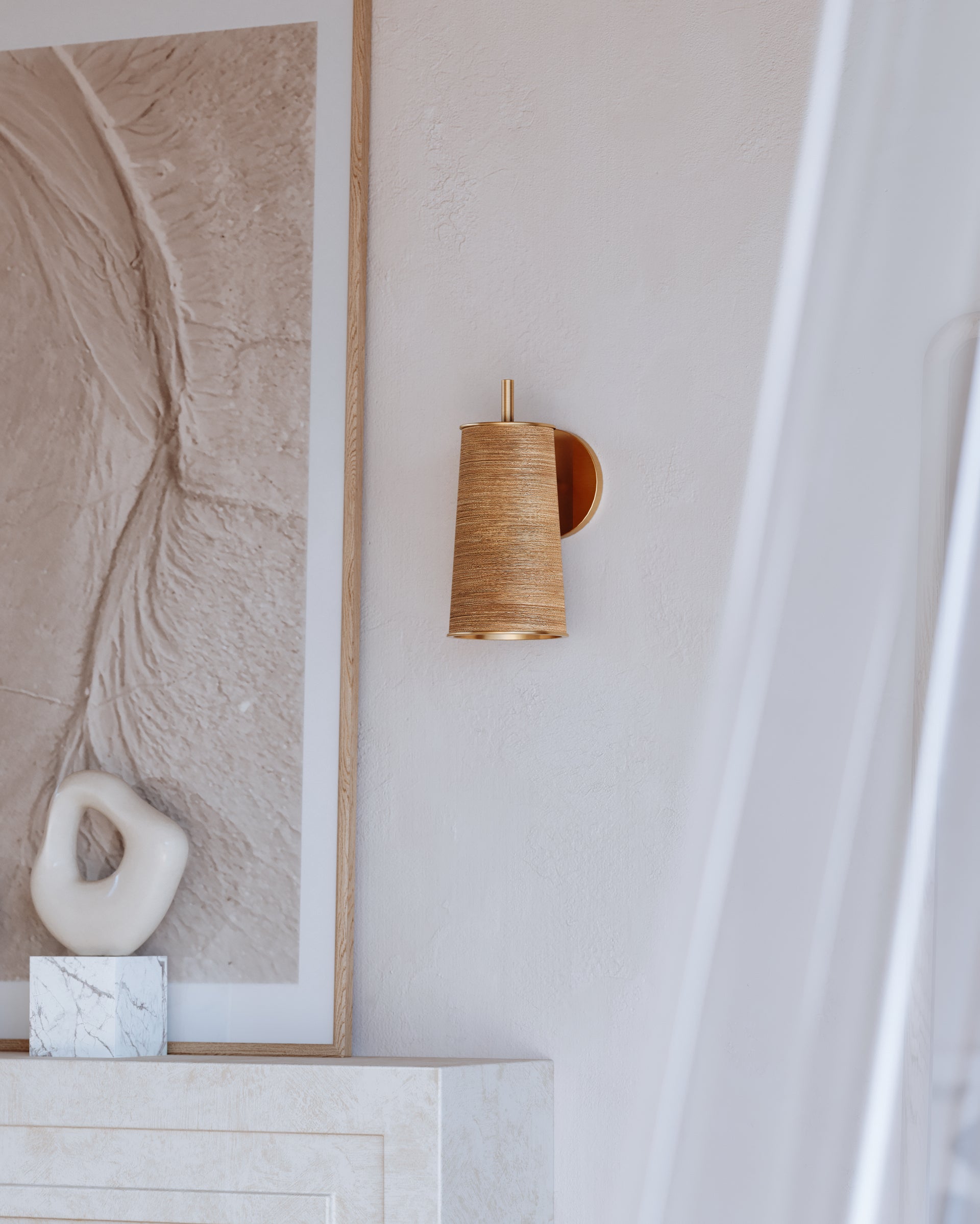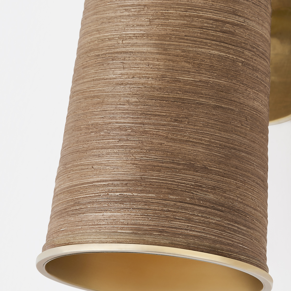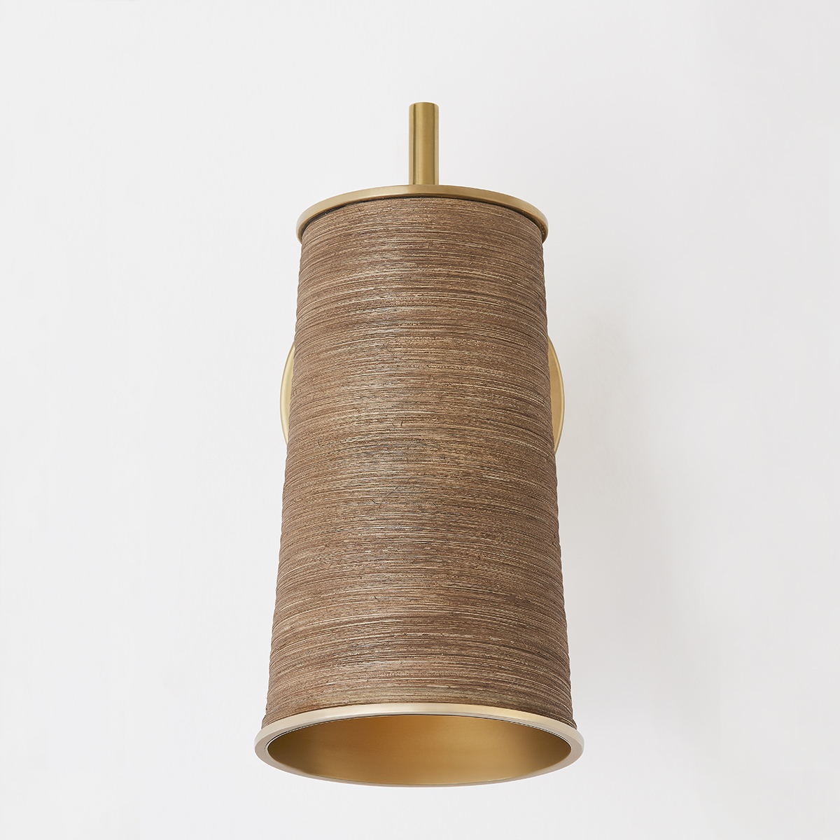 Combining the strength of metal with the organic beauty of rattan, Delran features an Aged Brass shade in a familiar, cylindrical sconce silhouette continuously wrapped from top to bottom in rattan. Aged Brass accents at the backplate, edging and interior of the shade bring even more warmth to this refined, natural design.