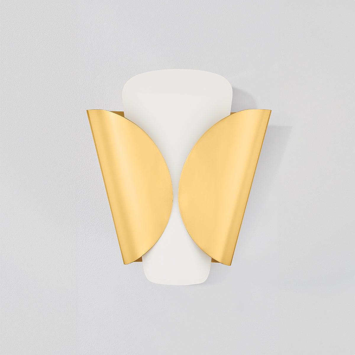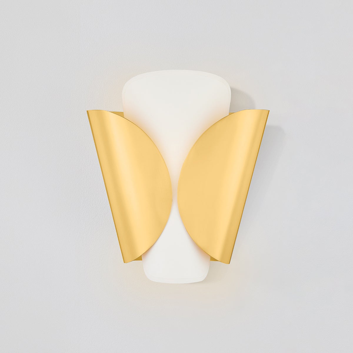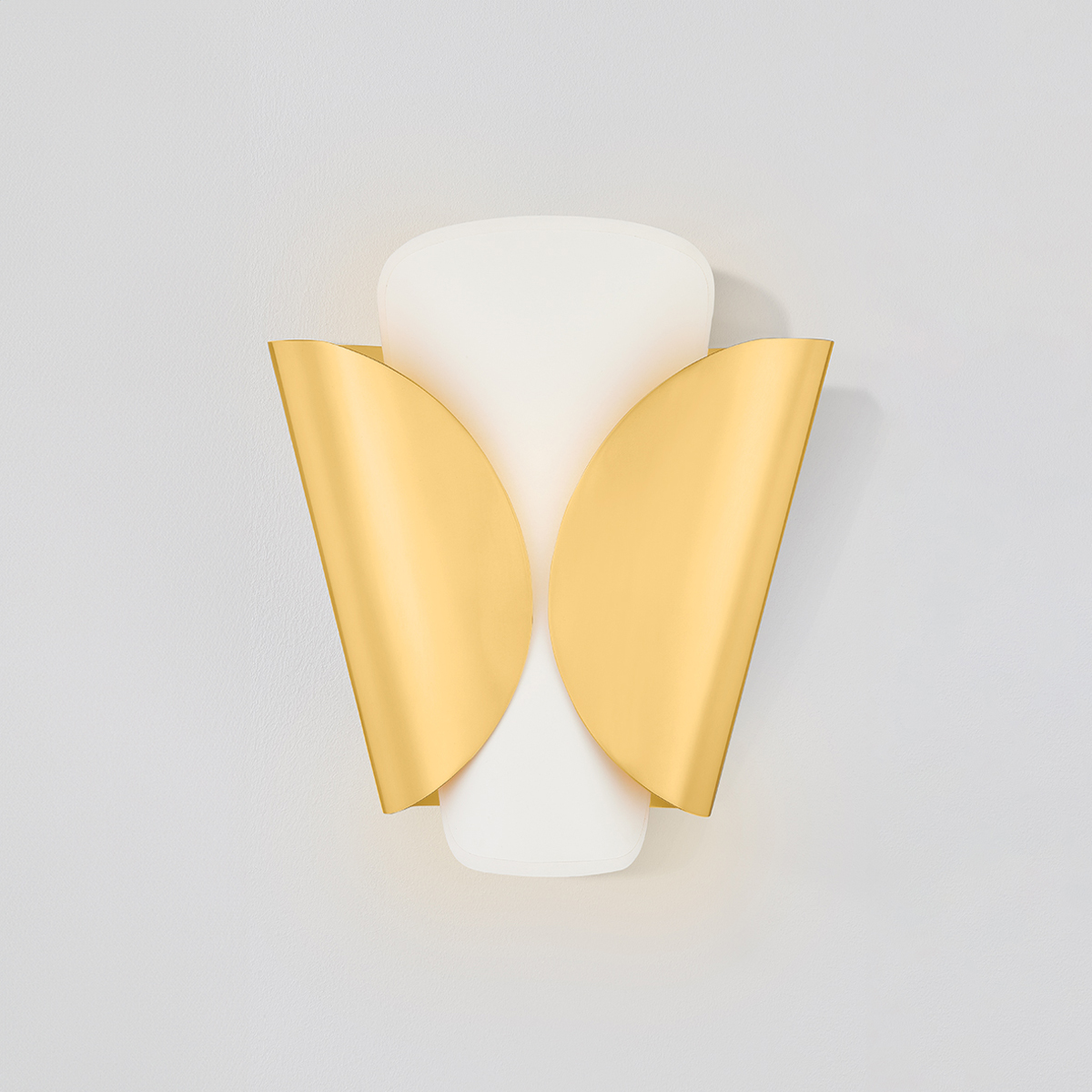 Inspired by the wings of a butterfly, this modern sconce features a layered shade wrapping an E12 base. As the outer shade folds inwards, it leaves a small gap that creates an intriguing play between the two layers. Choose from either an Aged Brass outer shade and parchment inner shade or an all-parchment fixture.