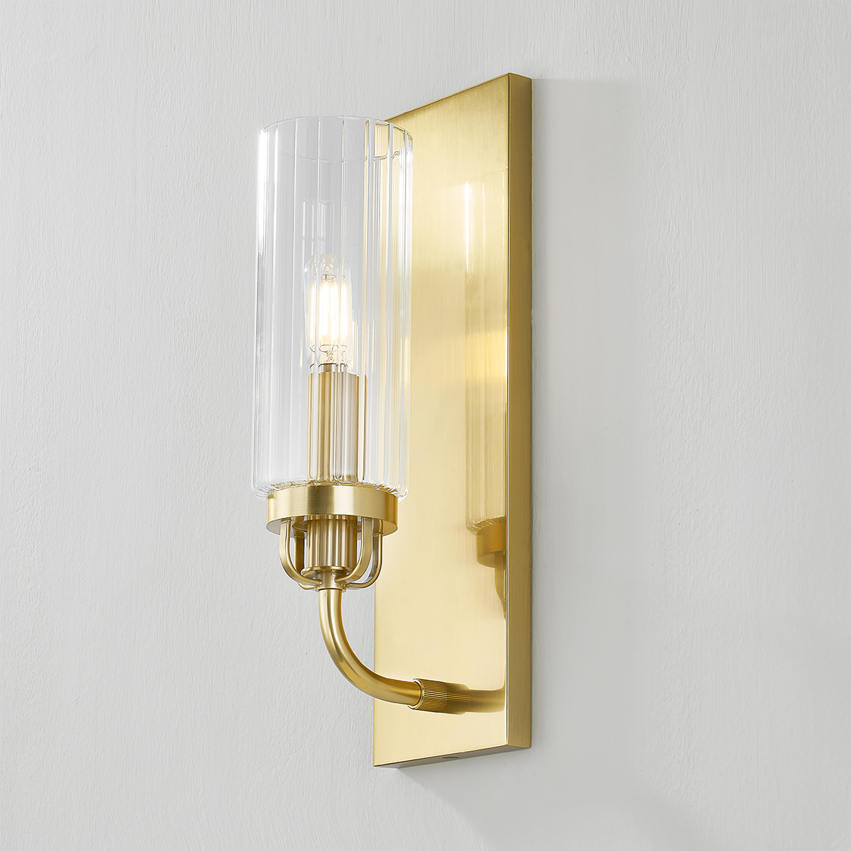 Inspired by the Art Deco movement, the long sweeping arms of Halifax curve upwards at the ends to support clear ribbed glass hurricane lamp shades. The Aged Brass framework evokes a sense of timelessness, while the slender silhouette of the fixture feels fresh and modern. As either a sconce or chandelier, Halifax marries functionality with enduring grace.