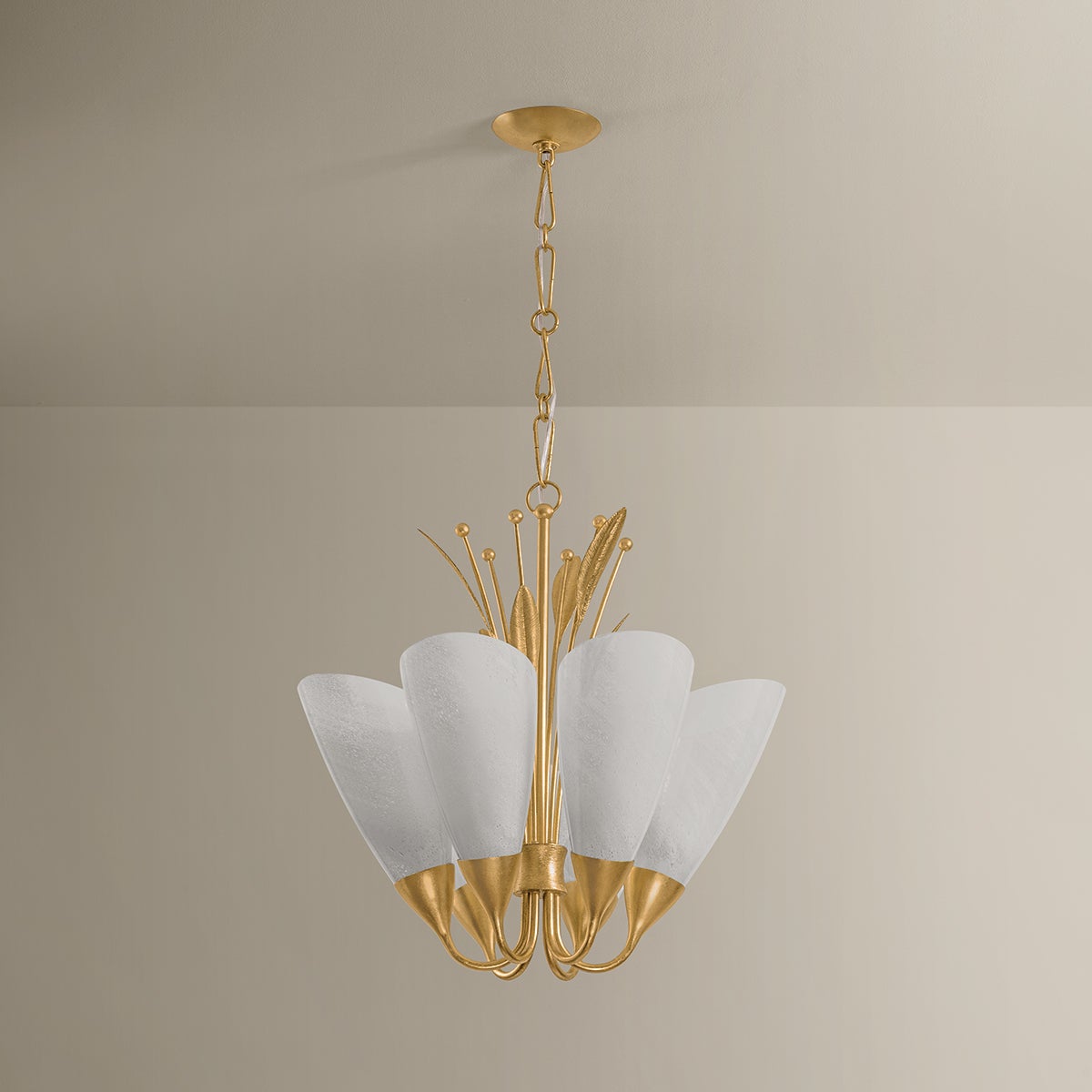 Cloud seedy glass shades bloom around a bouquet of decorative ‘leaves’ in the poetic Forest Glen family. Finished in Vintage Gold Leaf, the frame is elevated by hand-etched details, creating organic veining that looks true to nature. Available as a wall sconce, 6-light chandelier, and 10-light chandelier, Forest Glen creates an inviting lighting experience wherever it is placed.