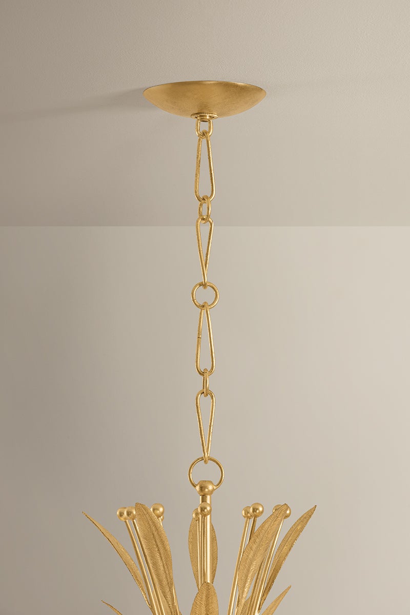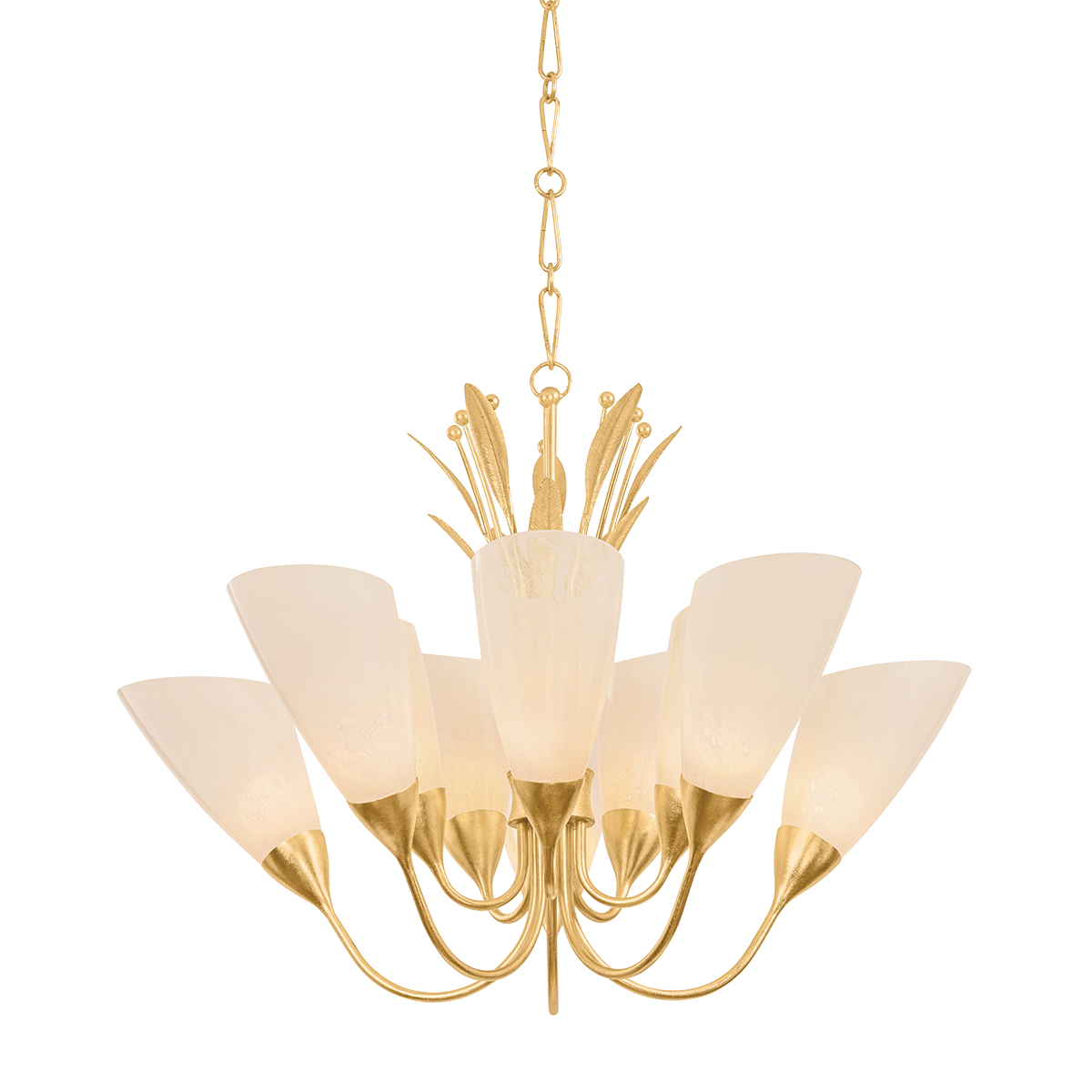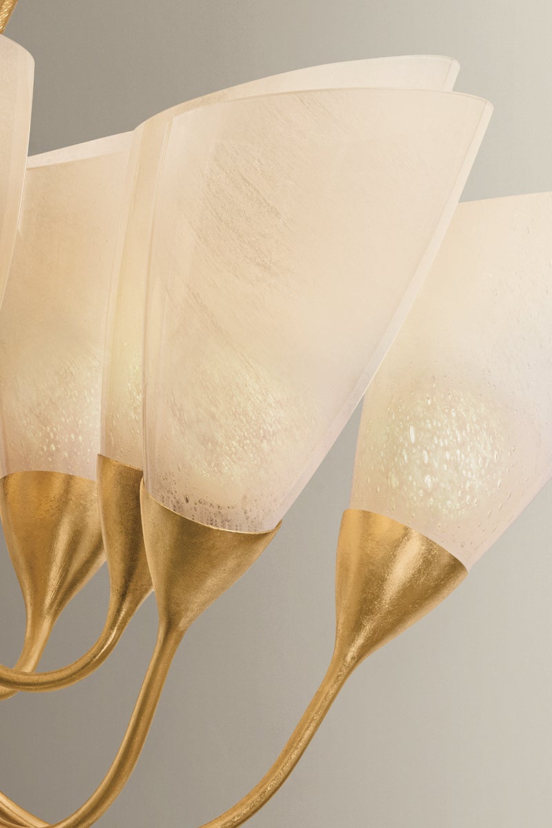 Cloud seedy glass shades bloom around a bouquet of decorative ‘leaves’ in the poetic Forest Glen family. Finished in Vintage Gold Leaf, the frame is elevated by hand-etched details, creating organic veining that looks true to nature. Available as a wall sconce, 6-light chandelier, and 10-light chandelier, Forest Glen creates an inviting lighting experience wherever it is placed.