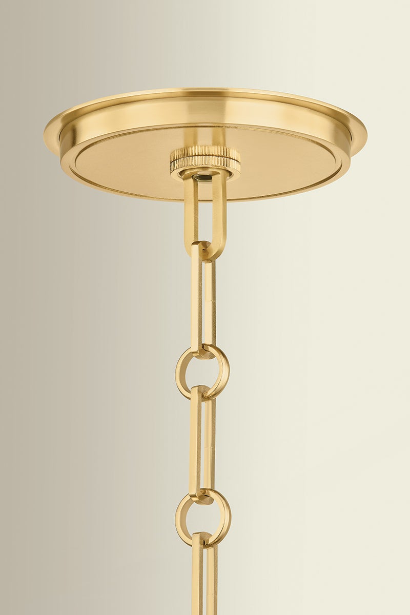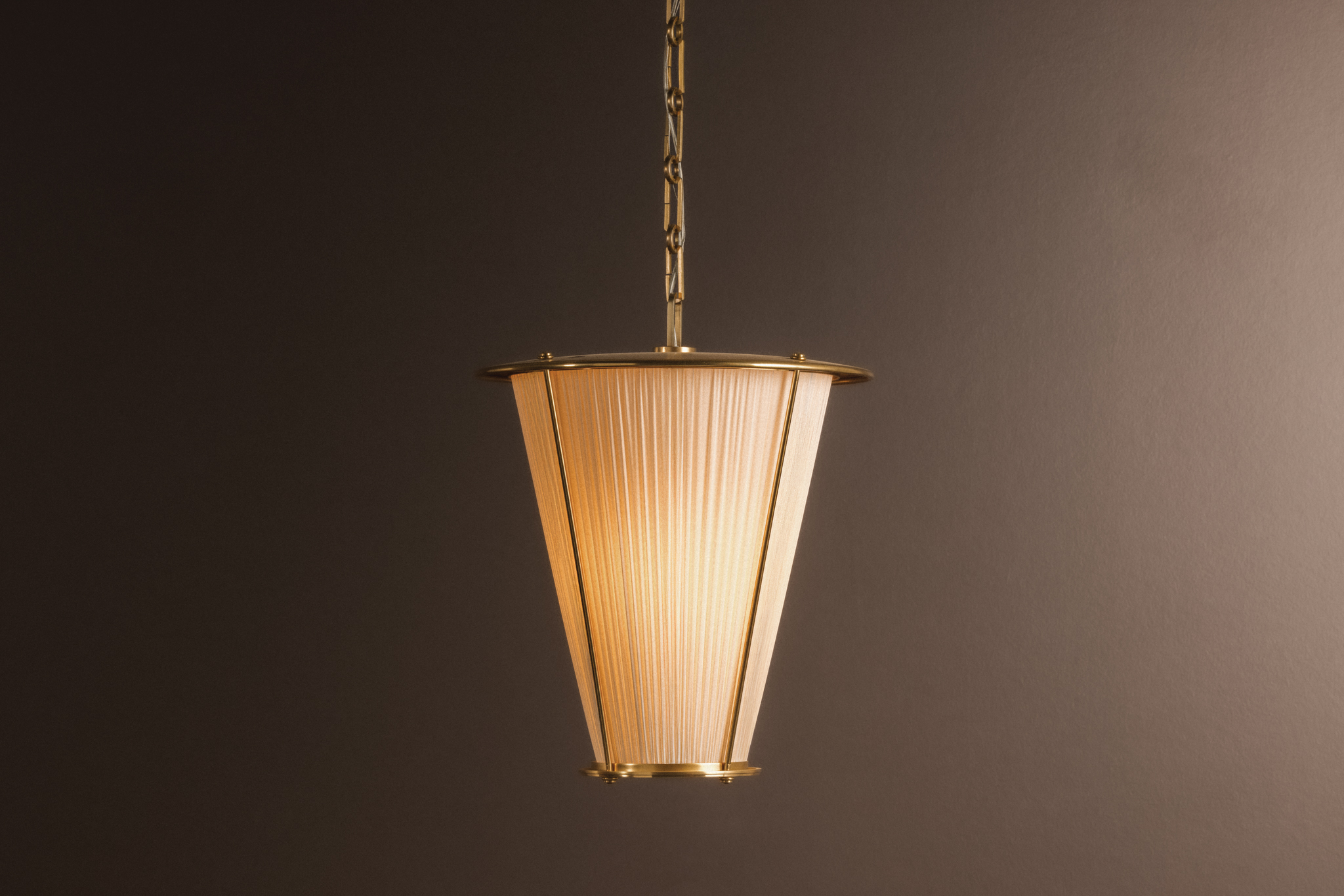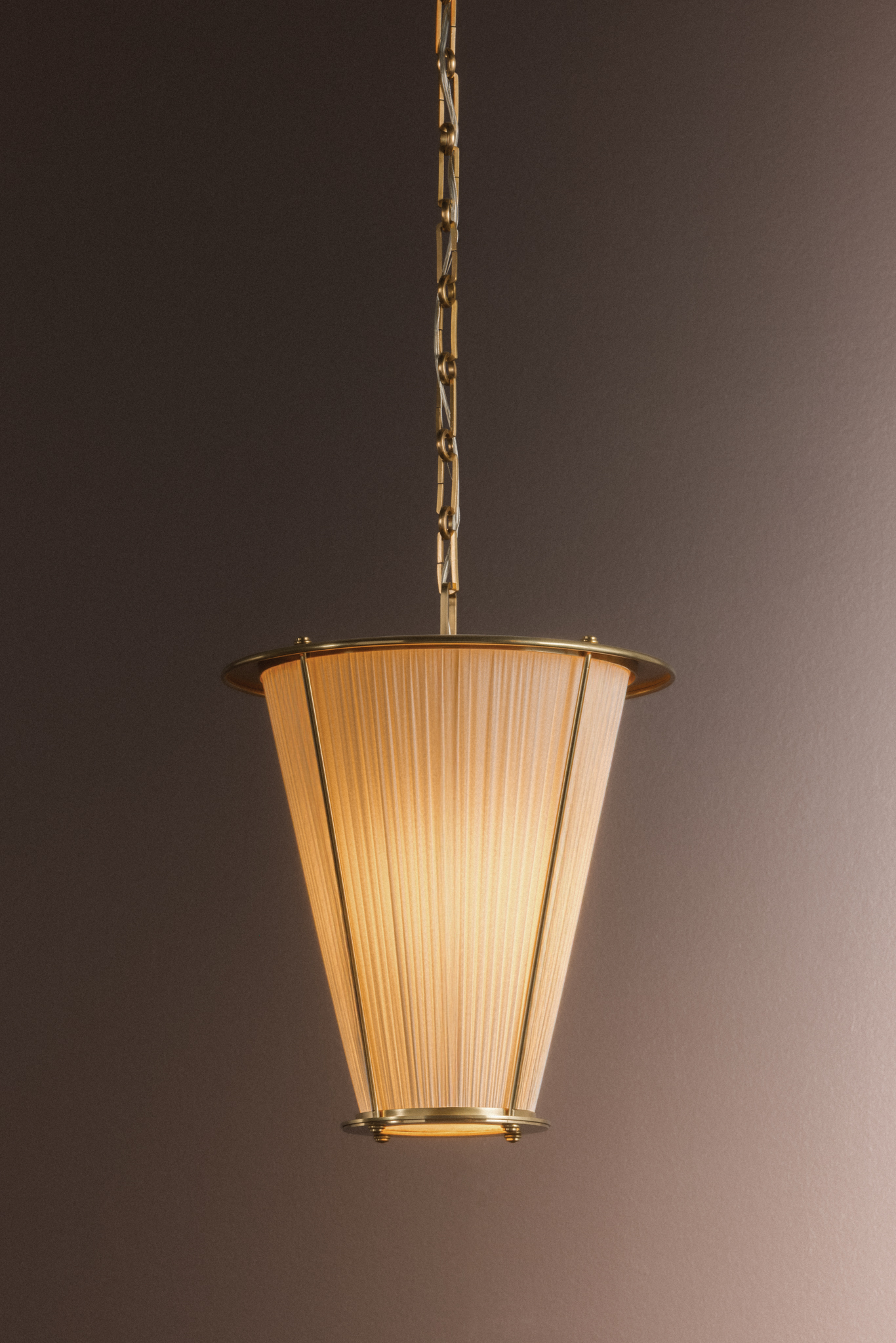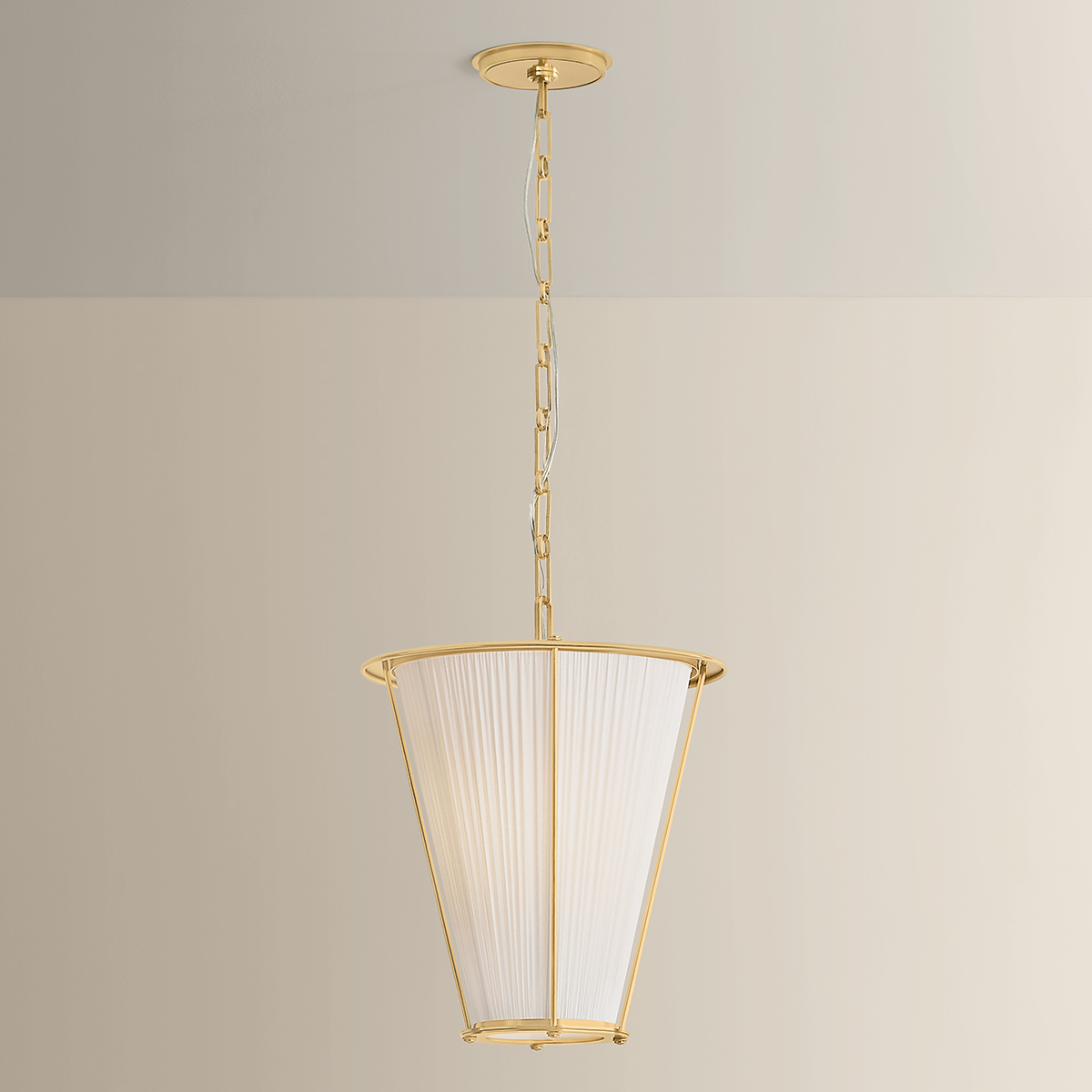 Drawing inspiration from a vintage lantern, Ellsworth presents a refined reinterpretation defined by material contrast and elevated scale. An elegantly pleated silk shade sits within a structured Aged Brass frame, striking a balance between softness and strength. Slender vertical rods, ornamental rivets, and a looped chain detail add tailored embellishment. Available in two sizes, Ellsworth brings a sense of clarity and sophistication to any space.