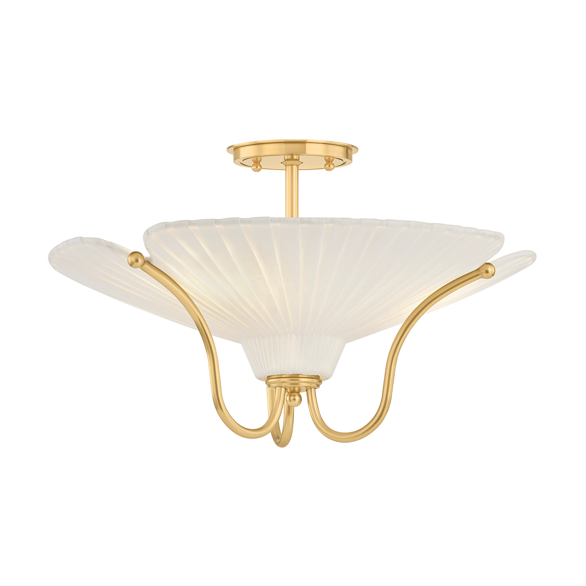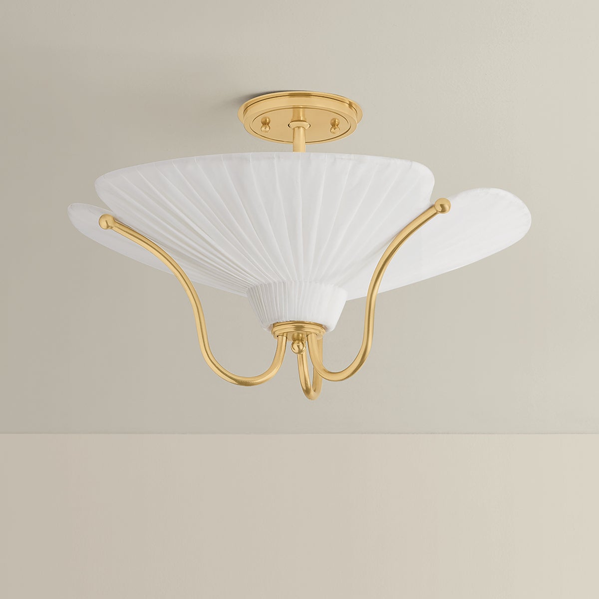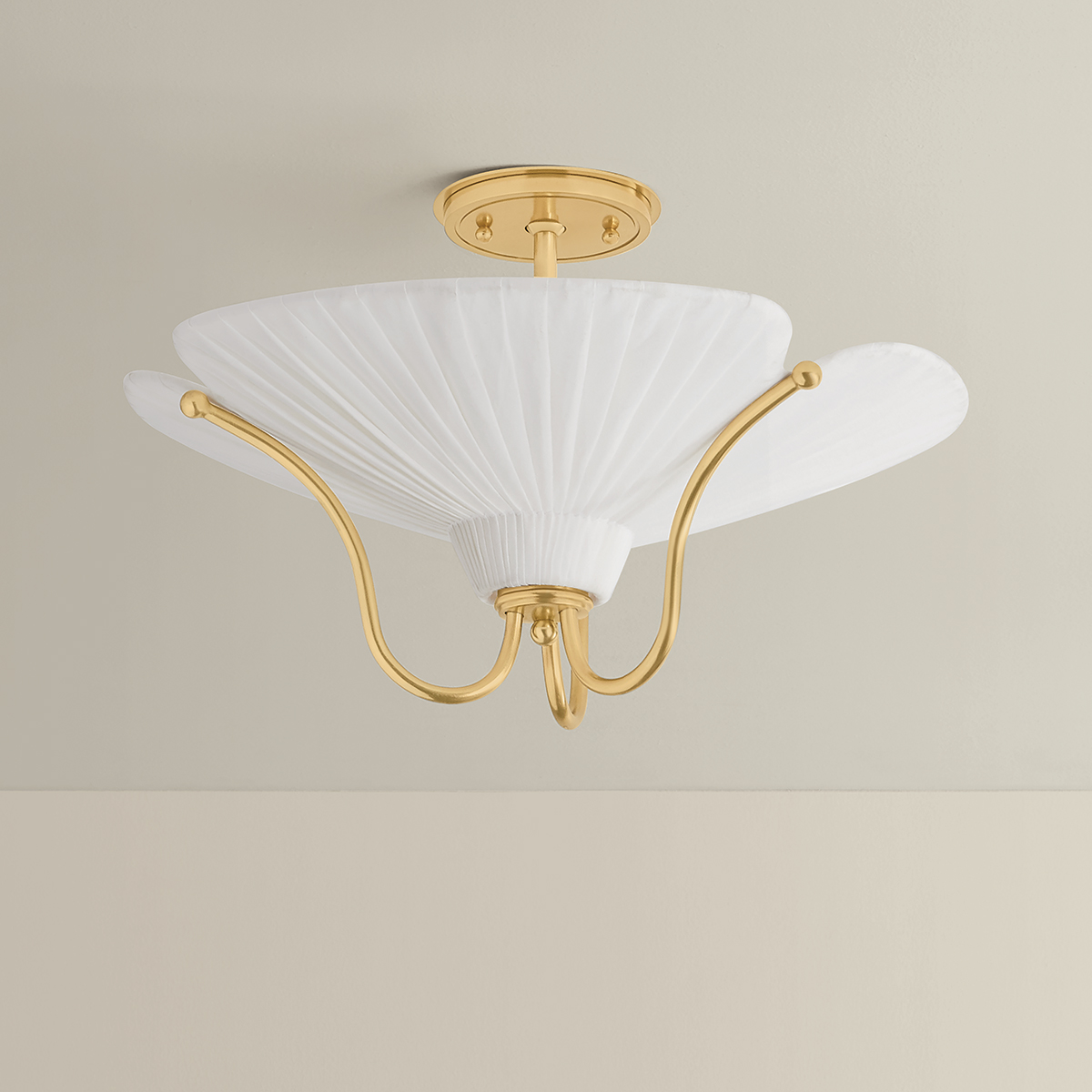 Drawing inspiration from the organic elegance of the Art Nouveau period, Gerhard reinterprets floral motifs with architectural clarity. Gracefully arched metalwork in a warm Aged Brass finish supports sheer ivory linen shades, crafted with a unique pleating technique that adds volume and dimension. Together, these elements form abstracted botanical shapes that feel both refined and expressive. Available as a semi flush mount and a 3 or 9-light pendant, this decorative up light serves as a captivating, sculptural focal point.