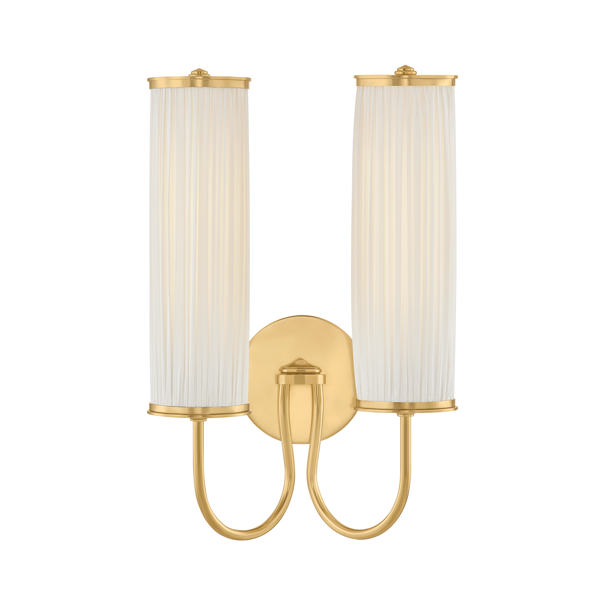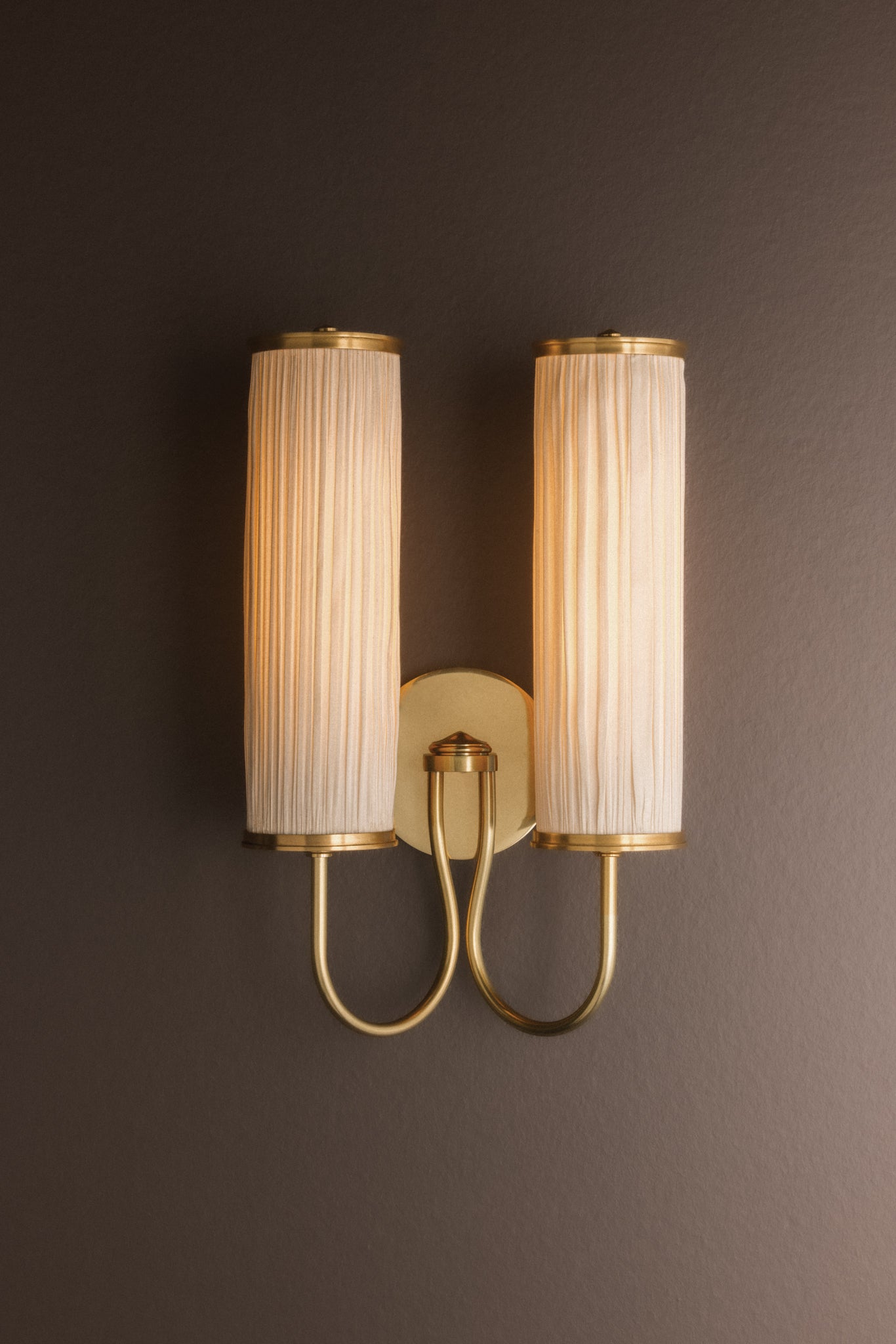 Elaine is a petite, elegant fixture that brings quiet sophistication to any setting. A gathered silk shade with even pleating diffuses light beautifully, while gently swooping Aged Brass metalwork introduces softness and sculptural fluidity. Whether used as a decorative accent or subtle task lighting, Elaine enhances moments of transition between spaces, offering a refined sense of continuity. Available as a 2-light vertical sconce or a 2-light picture light, this versatile form brings layered nuance to interiors.