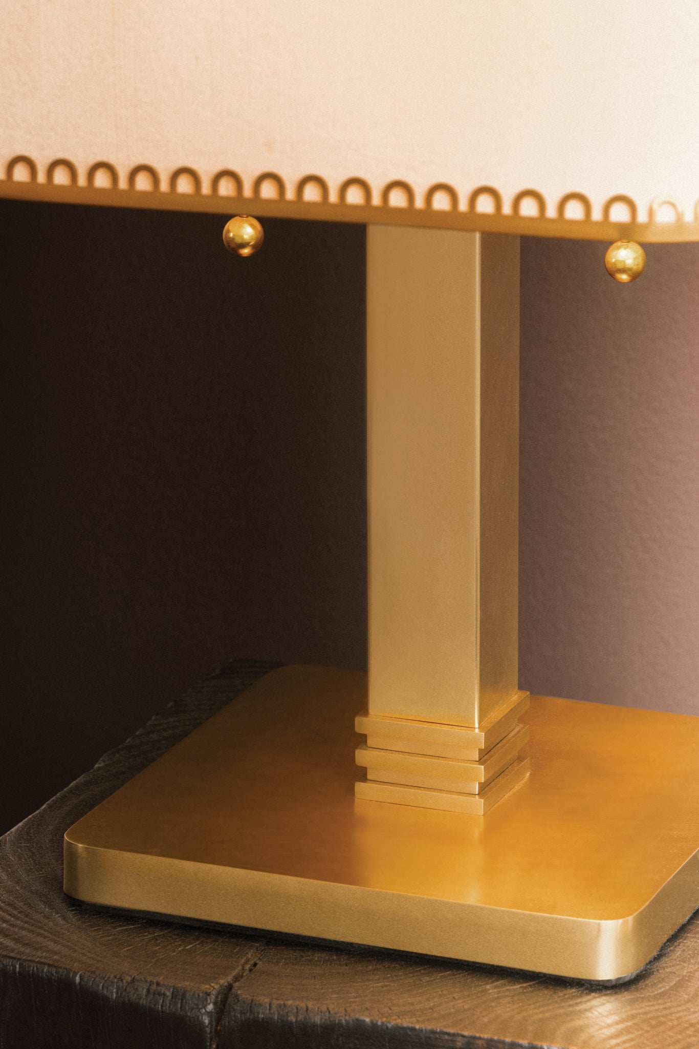Claude brings sculptural presence to a compact form, pairing a crisp, tailored silhouette with refined, vintage-inspired detailing. A square raw silk shade is delicately edged with lace-like metal perforations—an unexpected interplay of softness and structure. The Aged Brass finish, decorative pull chain, and twisted fabric cord evoke a sense of nostalgic charm with a modern sensibility.