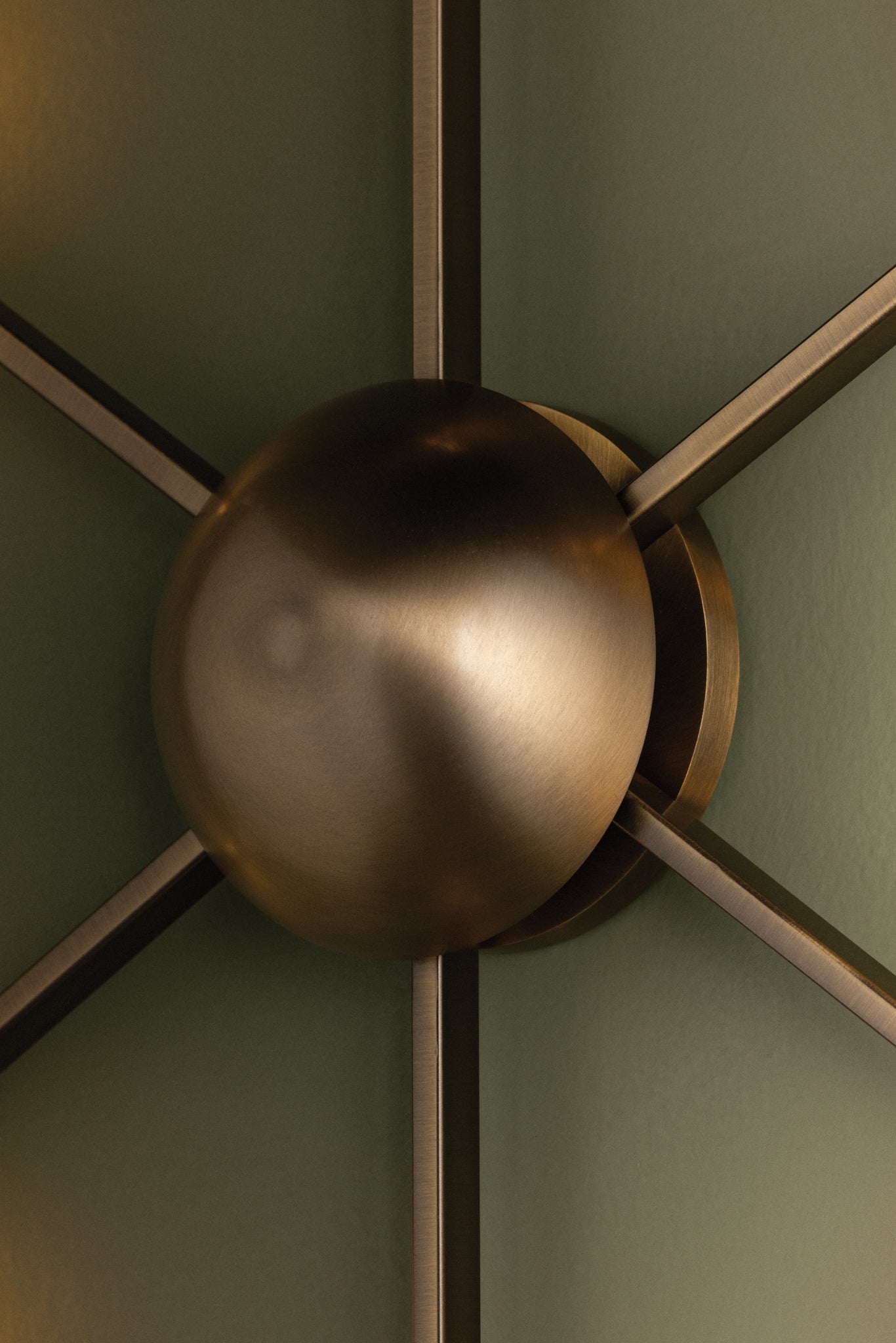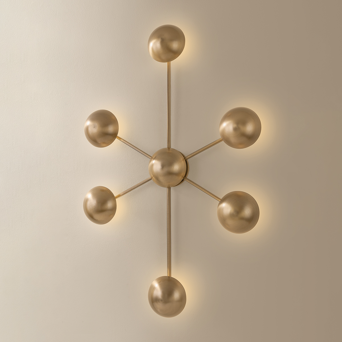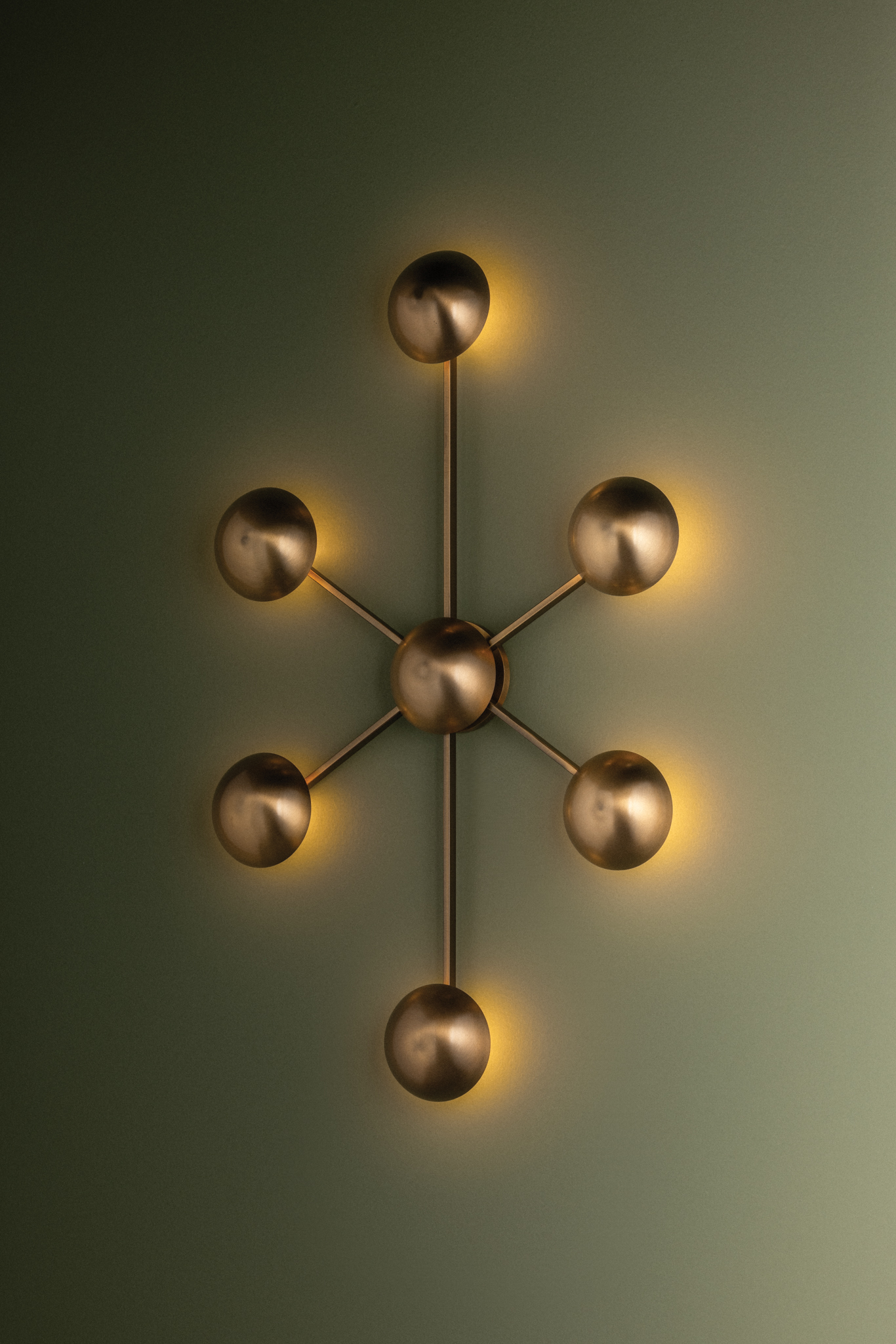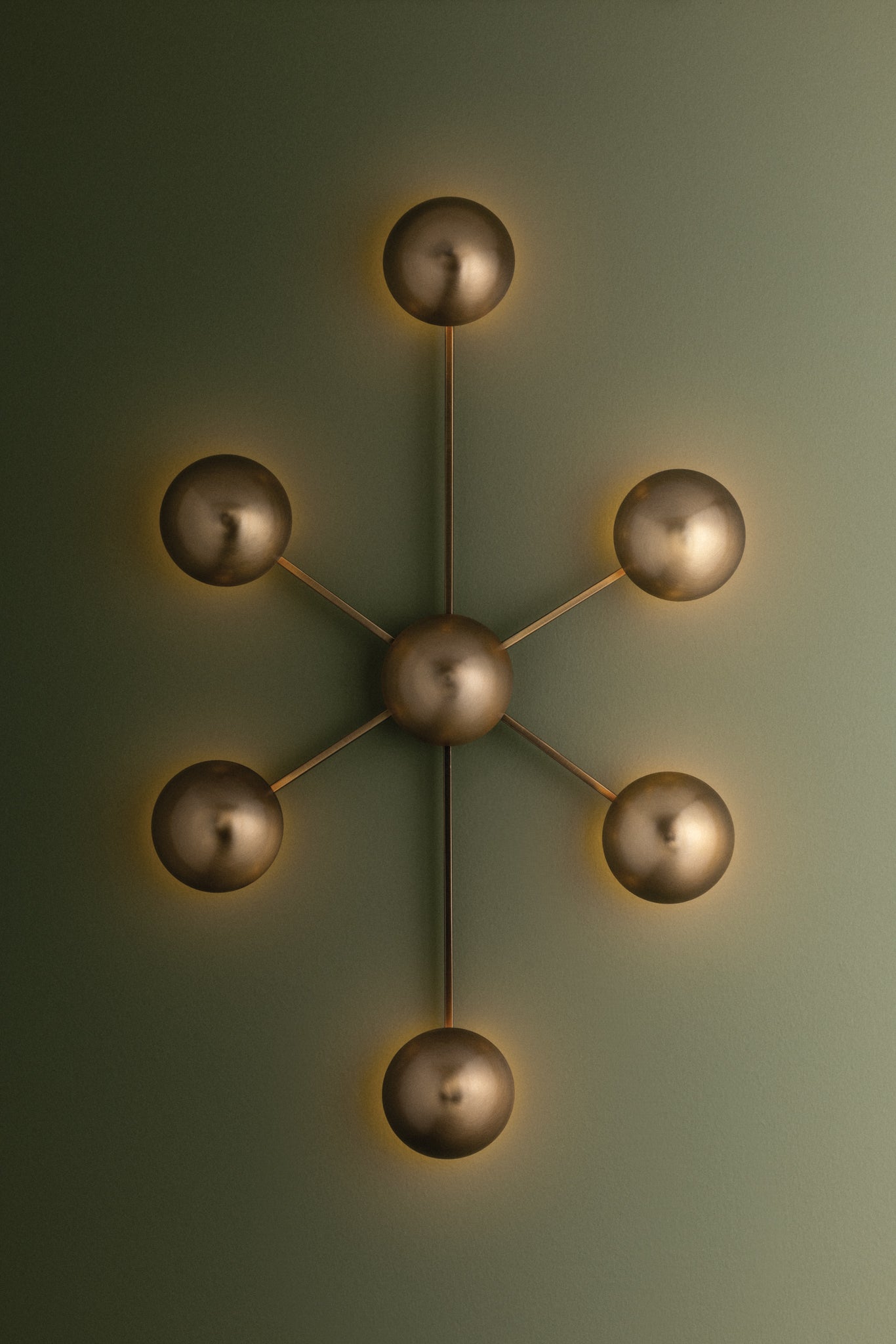 Conceived as a wall-mounted light sculpture, the Giovanni sconce features six dome heads radiating like spokes from a central hub. Fitted with LED, each dome projects a wash of indirect light onto the wall, illuminating the striking graphic form and creating a soft ambient effect. Finished in Patina Brass, Giovanni blends modernity with an air of permanence.