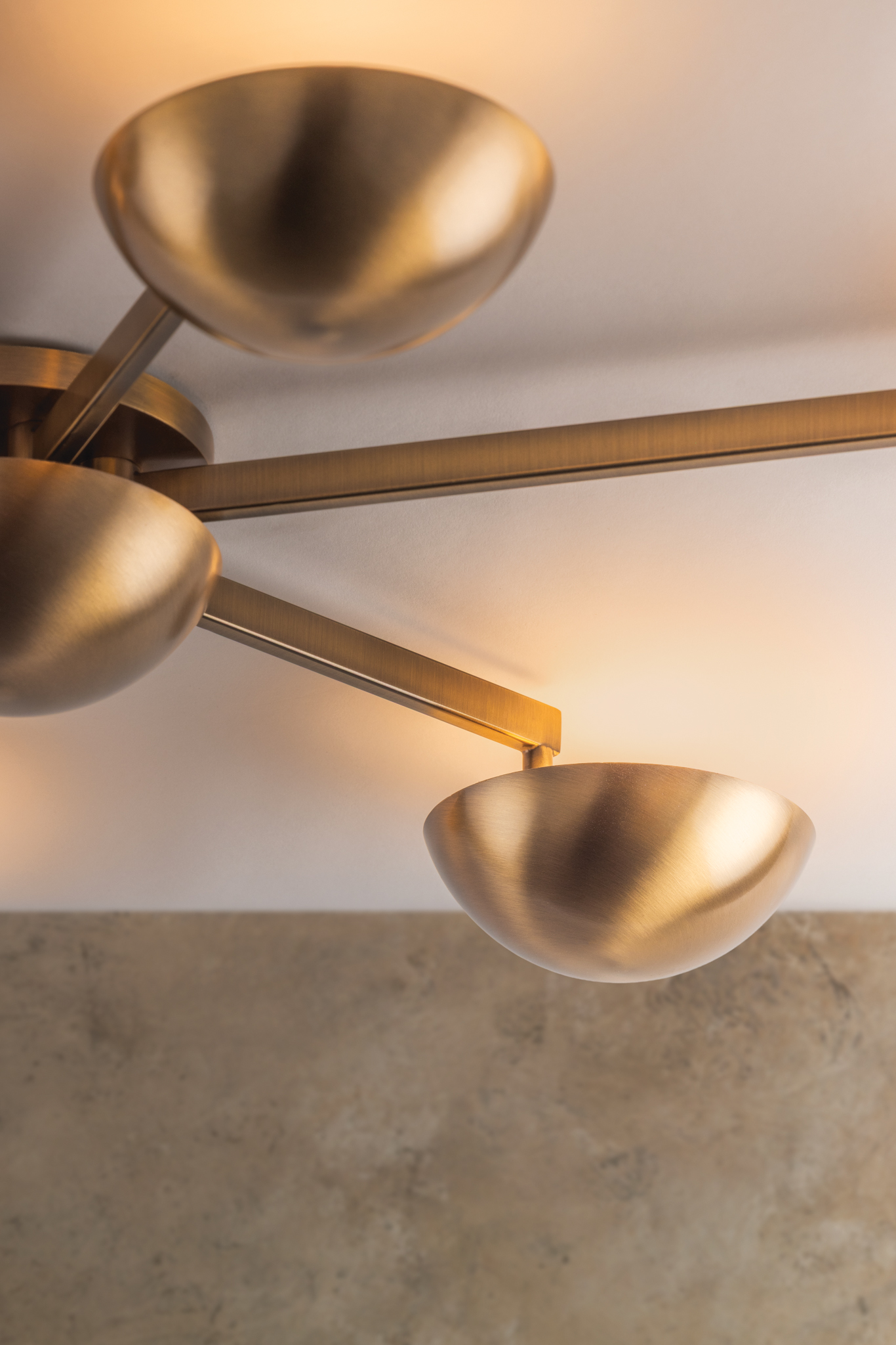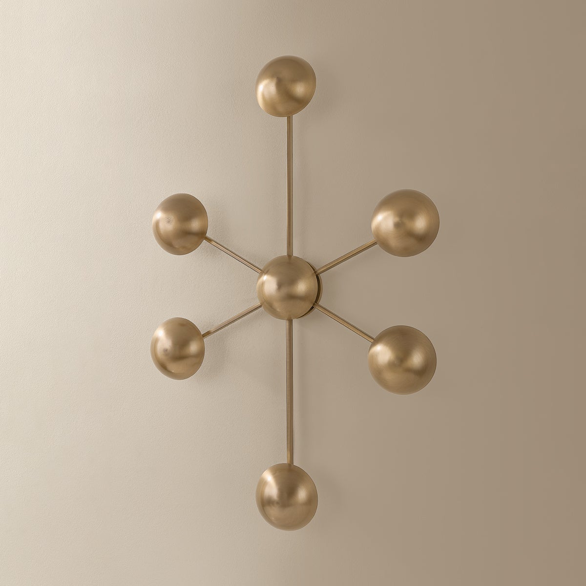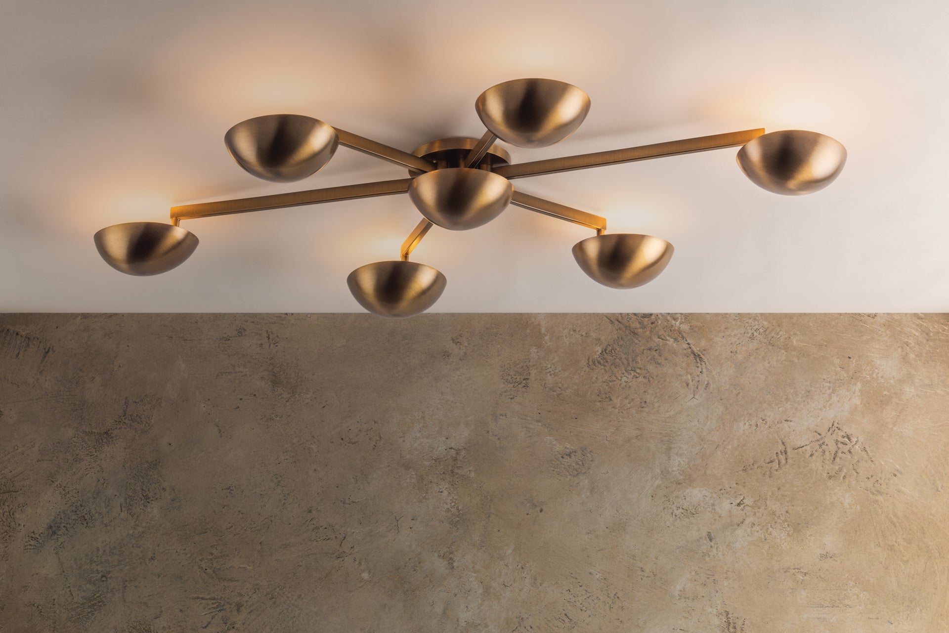 Conceived as a wall-mounted light sculpture, the Giovanni sconce features six dome heads radiating like spokes from a central hub. Fitted with LED, each dome projects a wash of indirect light onto the wall, illuminating the striking graphic form and creating a soft ambient effect. Finished in Patina Brass, Giovanni blends modernity with an air of permanence.