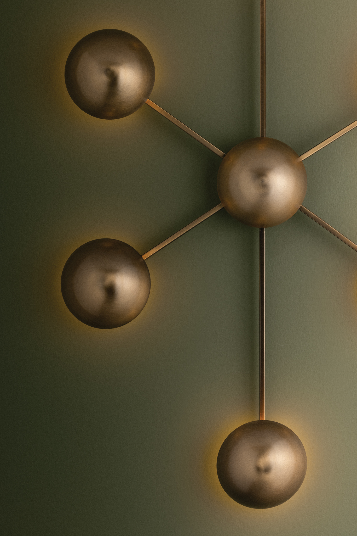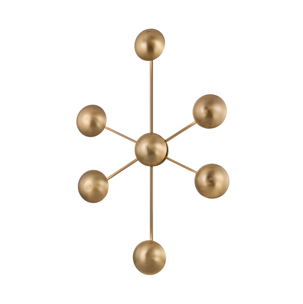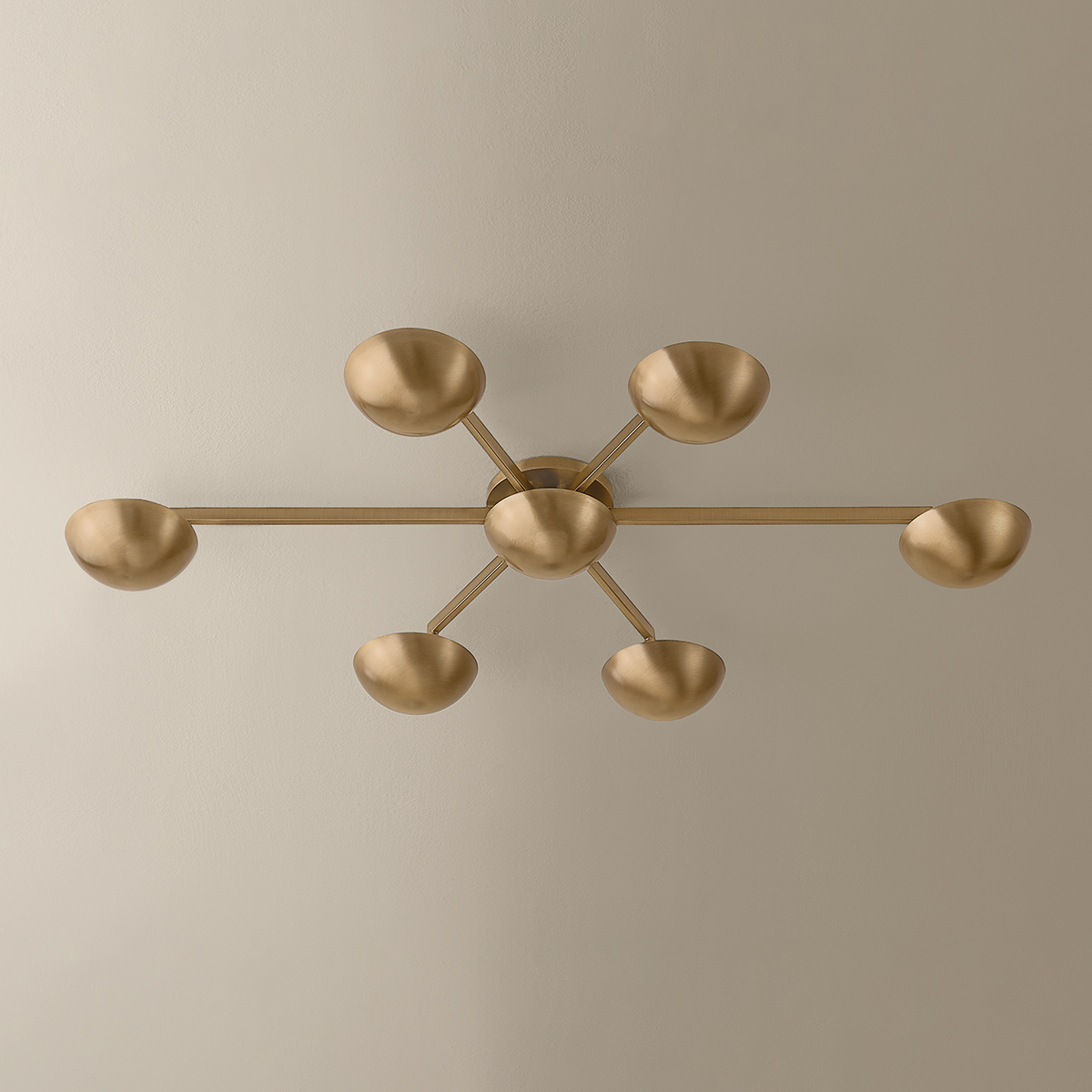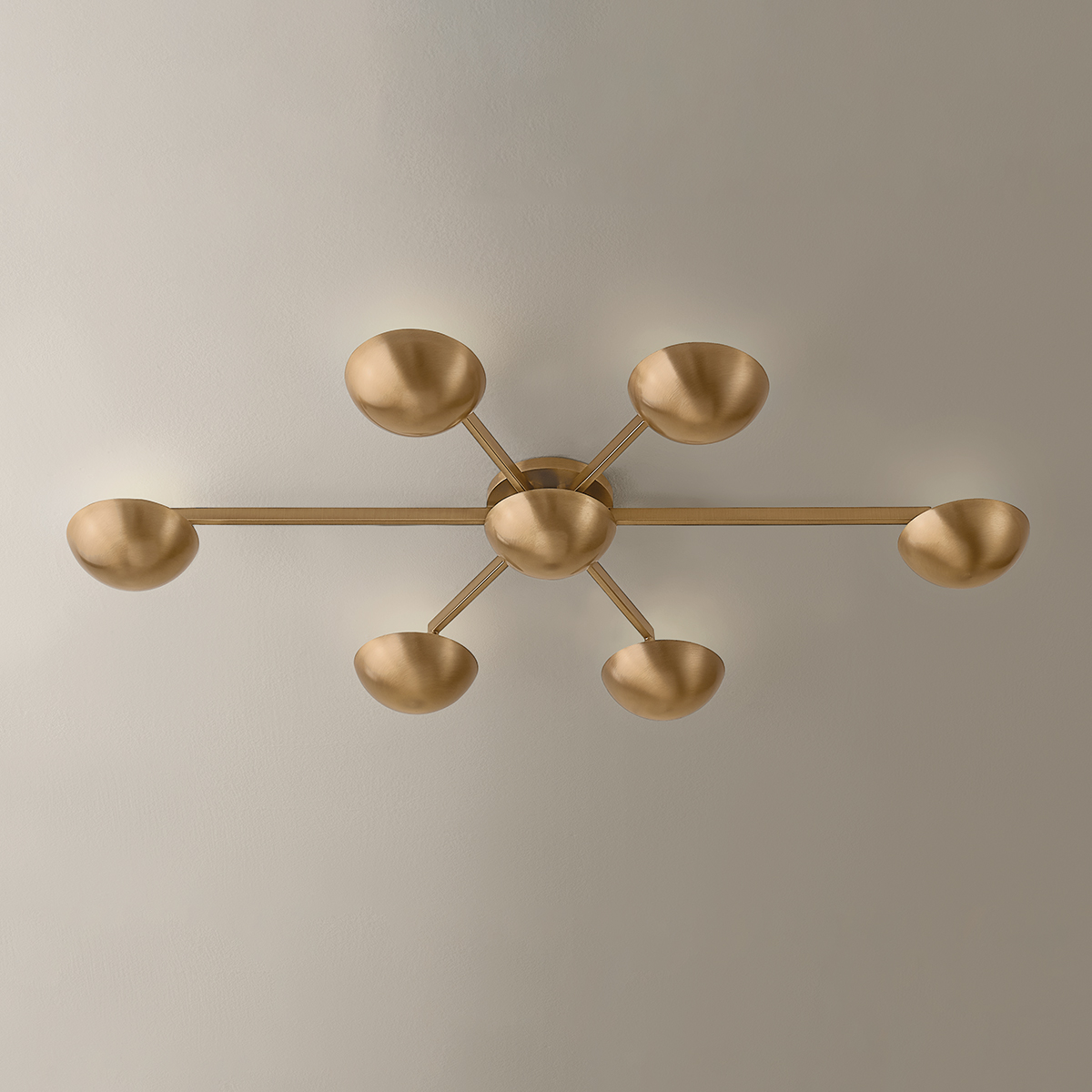 Conceived as a wall-mounted light sculpture, the Giovanni sconce features six dome heads radiating like spokes from a central hub. Fitted with LED, each dome projects a wash of indirect light onto the wall, illuminating the striking graphic form and creating a soft ambient effect. Finished in Patina Brass, Giovanni blends modernity with an air of permanence.