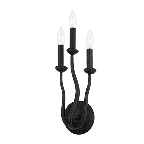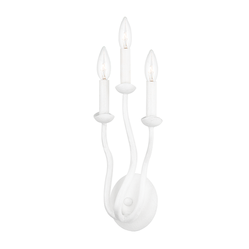 Whimsy rules with Reign. The sconce's squiggly arms and the candle's slightly askew cups give the fixture an overall sense of movement and create purposefully playful shadows on the wall. Bright light pours from the clear bulbs of the one or three-light sconce. Available in a Black Iron or textured White Gesso finish.
