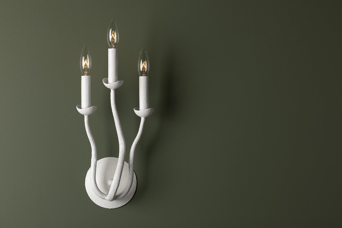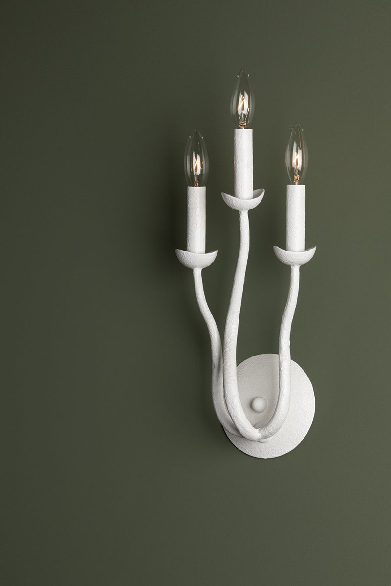 Whimsy rules with Reign. The sconce's squiggly arms and the candle's slightly askew cups give the fixture an overall sense of movement and create purposefully playful shadows on the wall. Bright light pours from the clear bulbs of the one or three-light sconce. Available in a Black Iron or textured White Gesso finish.