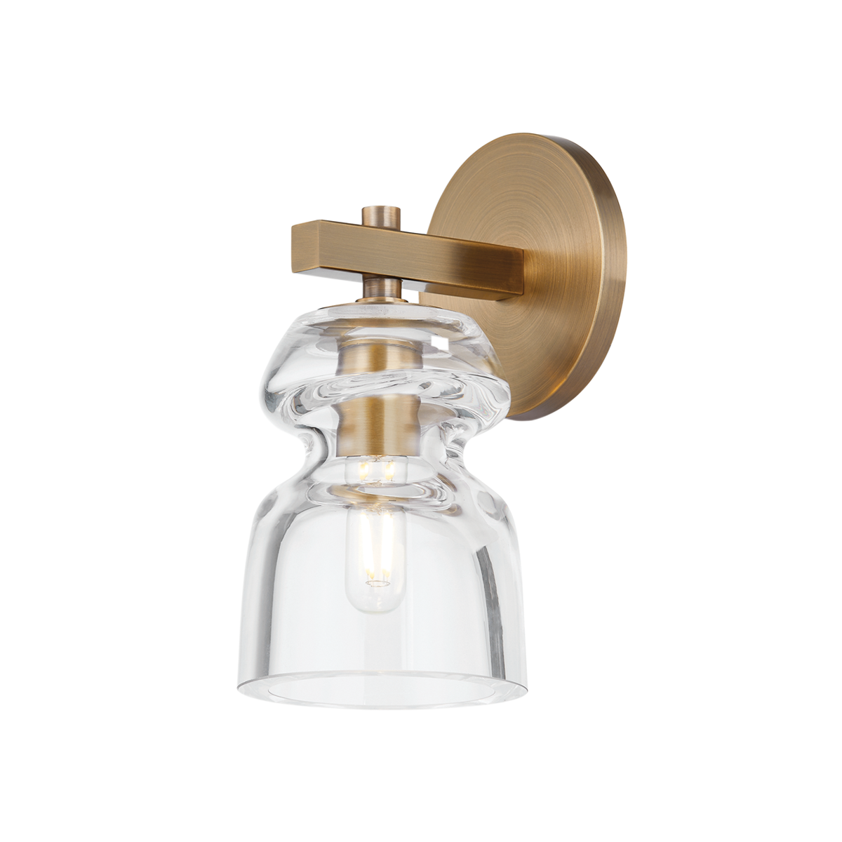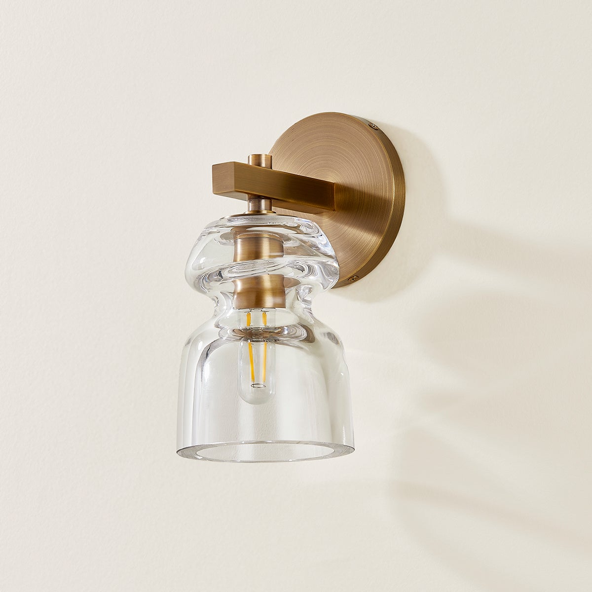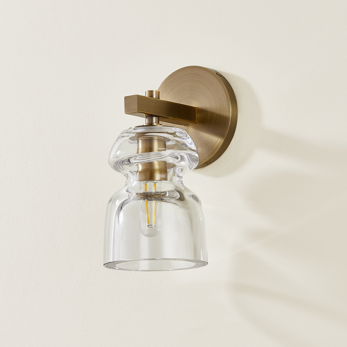 Minimal yet refined, Trey proportion with understated, yet significant metalwork and a thick glass shade. Crafted from Clear Glass, the shade tapers in the middle, creating an asymmetrical hourglass shape. Supporting this votive-like shade is a sleek circular backplate and rectangular metal post, which are available in a Polished Nickel or Patina Brass finish.