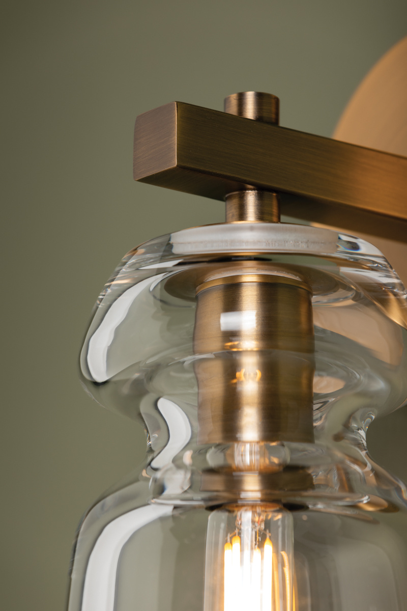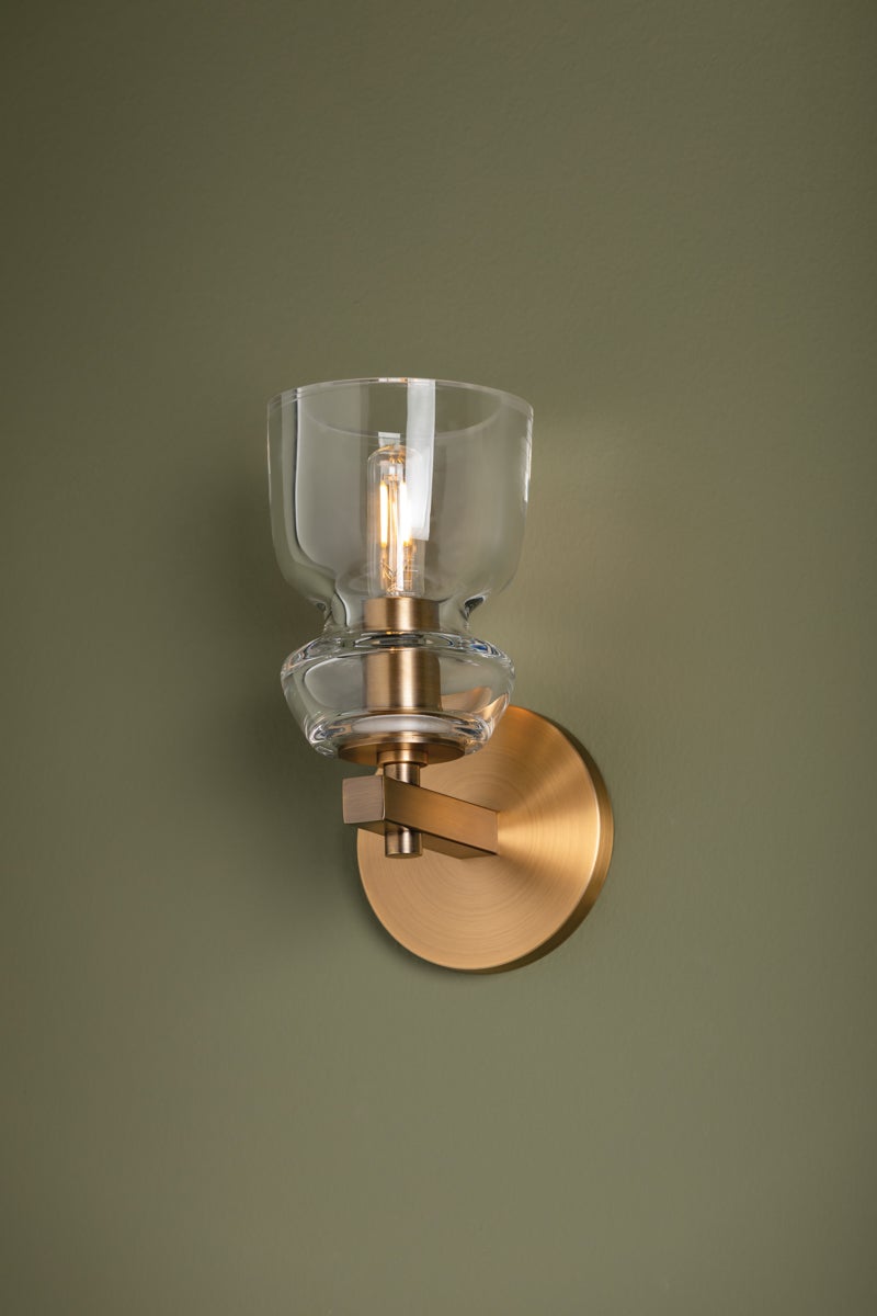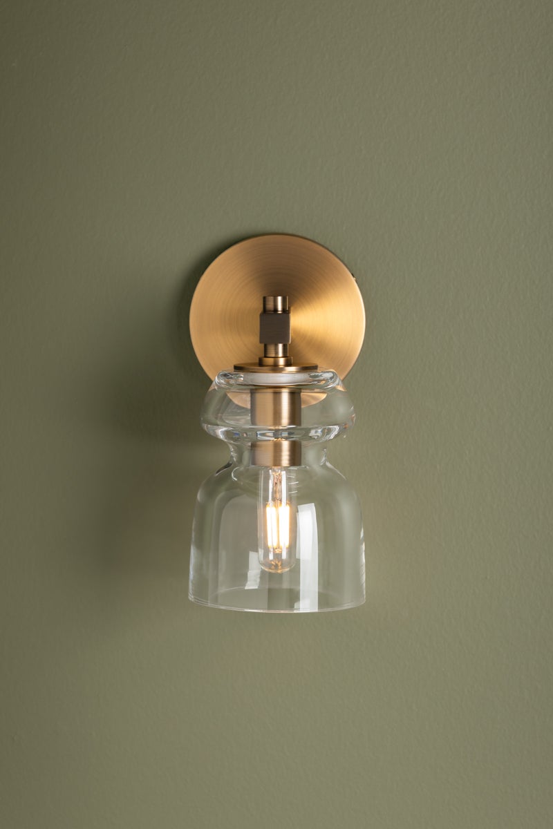 Minimal yet refined, Trey proportion with understated, yet significant metalwork and a thick glass shade. Crafted from Clear Glass, the shade tapers in the middle, creating an asymmetrical hourglass shape. Supporting this votive-like shade is a sleek circular backplate and rectangular metal post, which are available in a Polished Nickel or Patina Brass finish.
