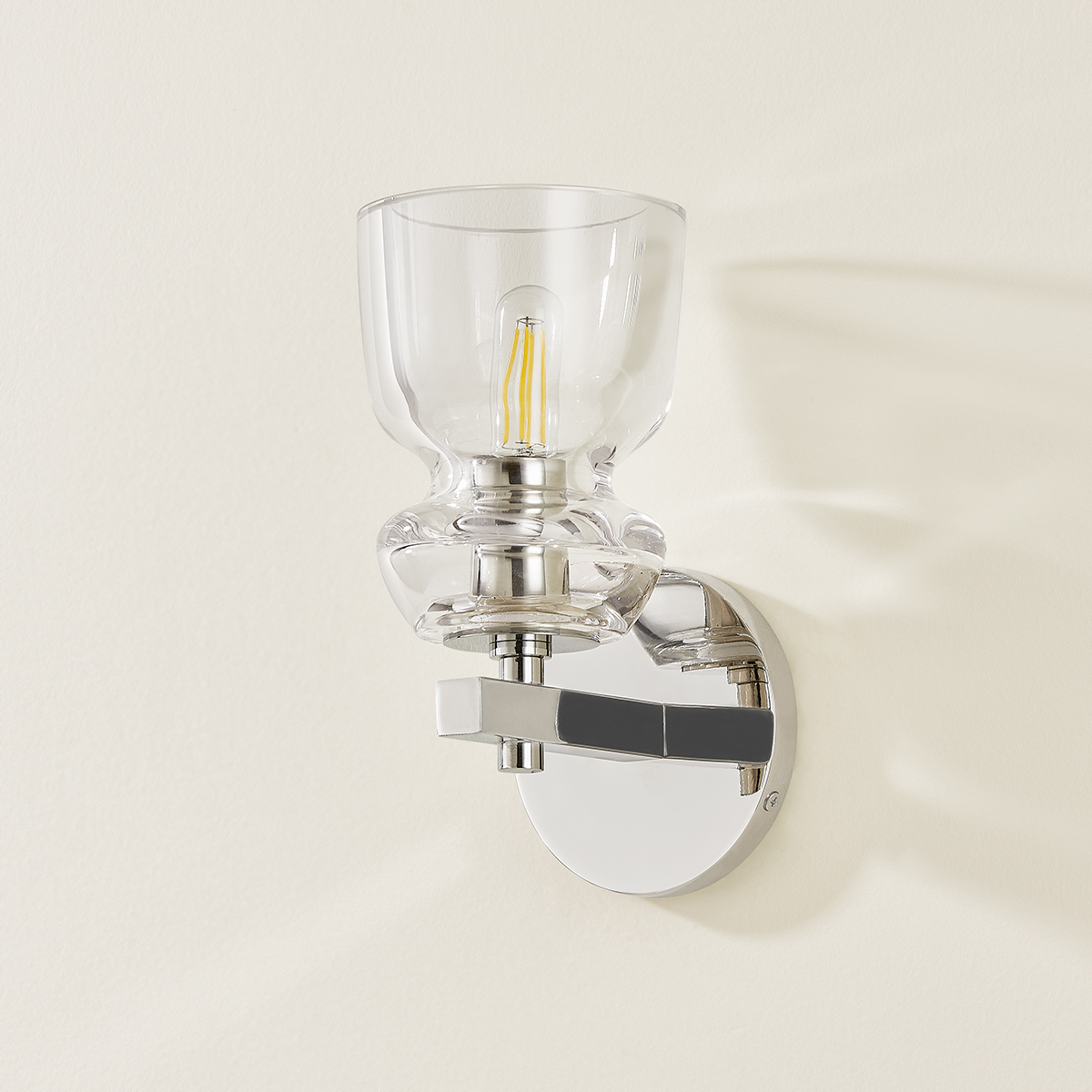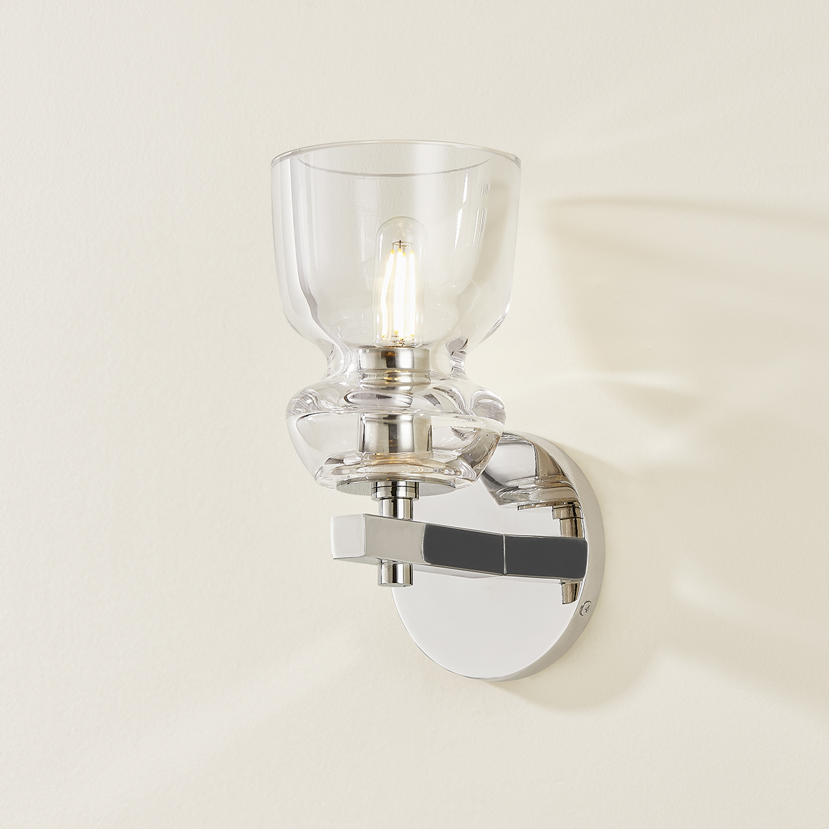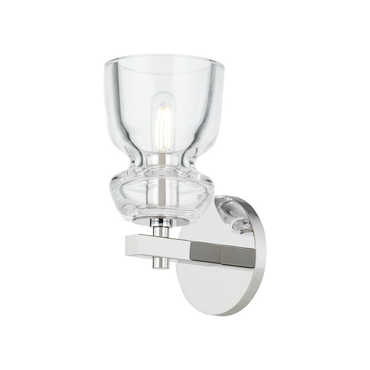 Minimal yet refined, Trey proportion with understated, yet significant metalwork and a thick glass shade. Crafted from Clear Glass, the shade tapers in the middle, creating an asymmetrical hourglass shape. Supporting this votive-like shade is a sleek circular backplate and rectangular metal post, which are available in a Polished Nickel or Patina Brass finish.
