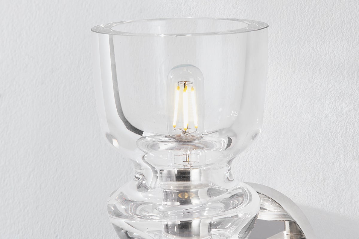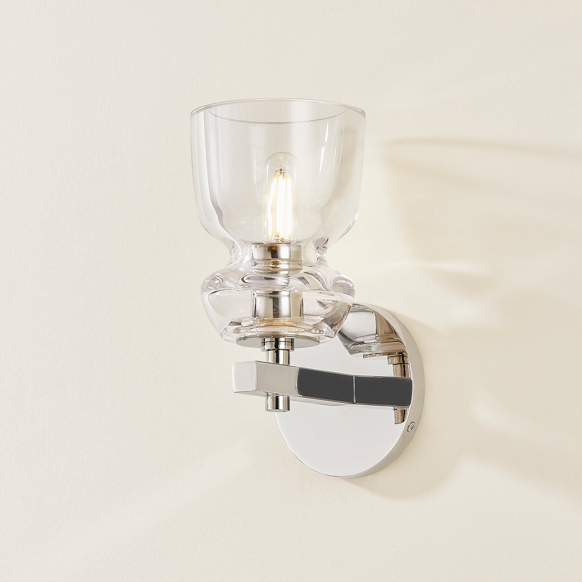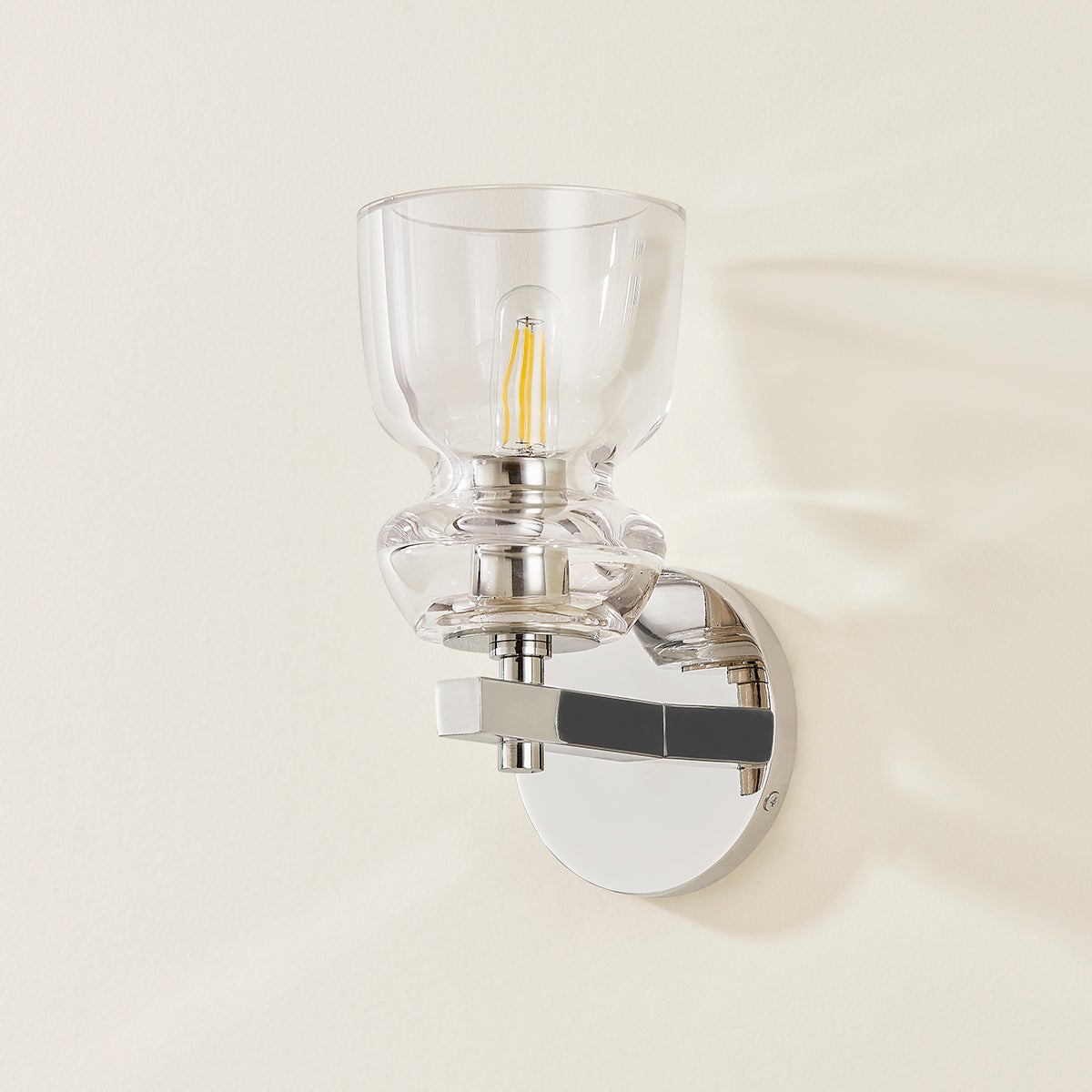 Minimal yet refined, Trey proportion with understated, yet significant metalwork and a thick glass shade. Crafted from Clear Glass, the shade tapers in the middle, creating an asymmetrical hourglass shape. Supporting this votive-like shade is a sleek circular backplate and rectangular metal post, which are available in a Polished Nickel or Patina Brass finish.