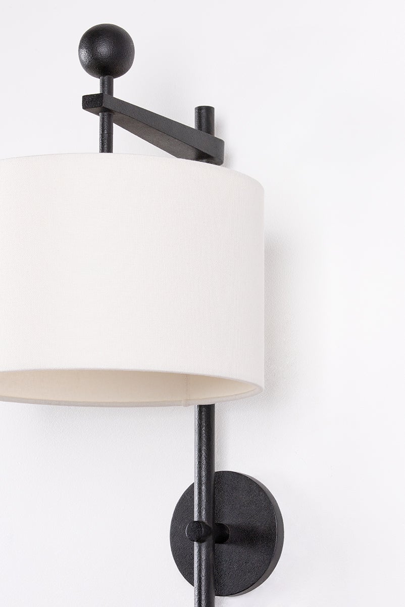 Tisbury is intentionally scaled to light up larger rooms or corridors with its oversized proportions. Heritage details, and a Forged Iron finish give this impressive wall sconce an authentic vintage feel. A large off-white linen shade provides a fresh point of contrast that completes this modern fixture.