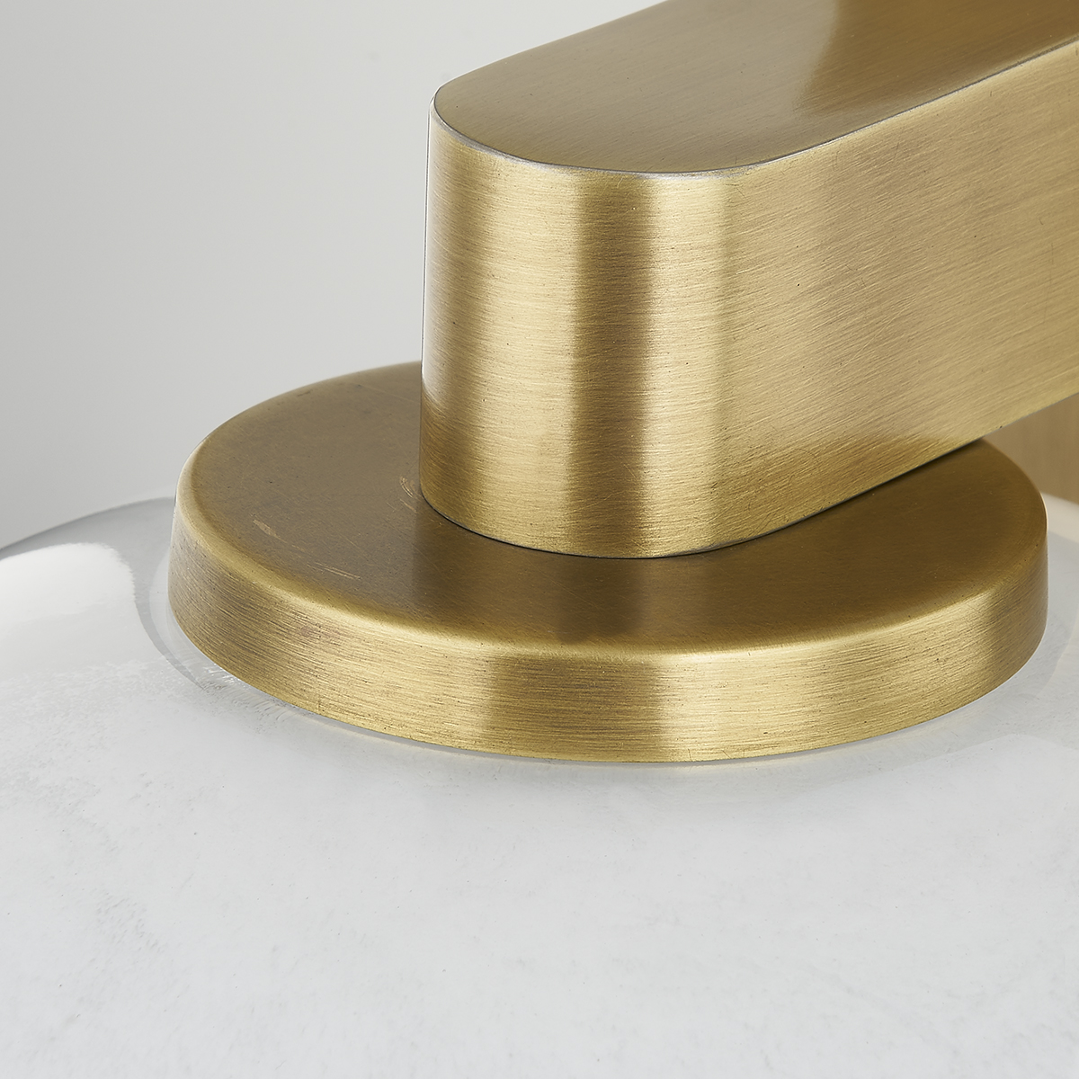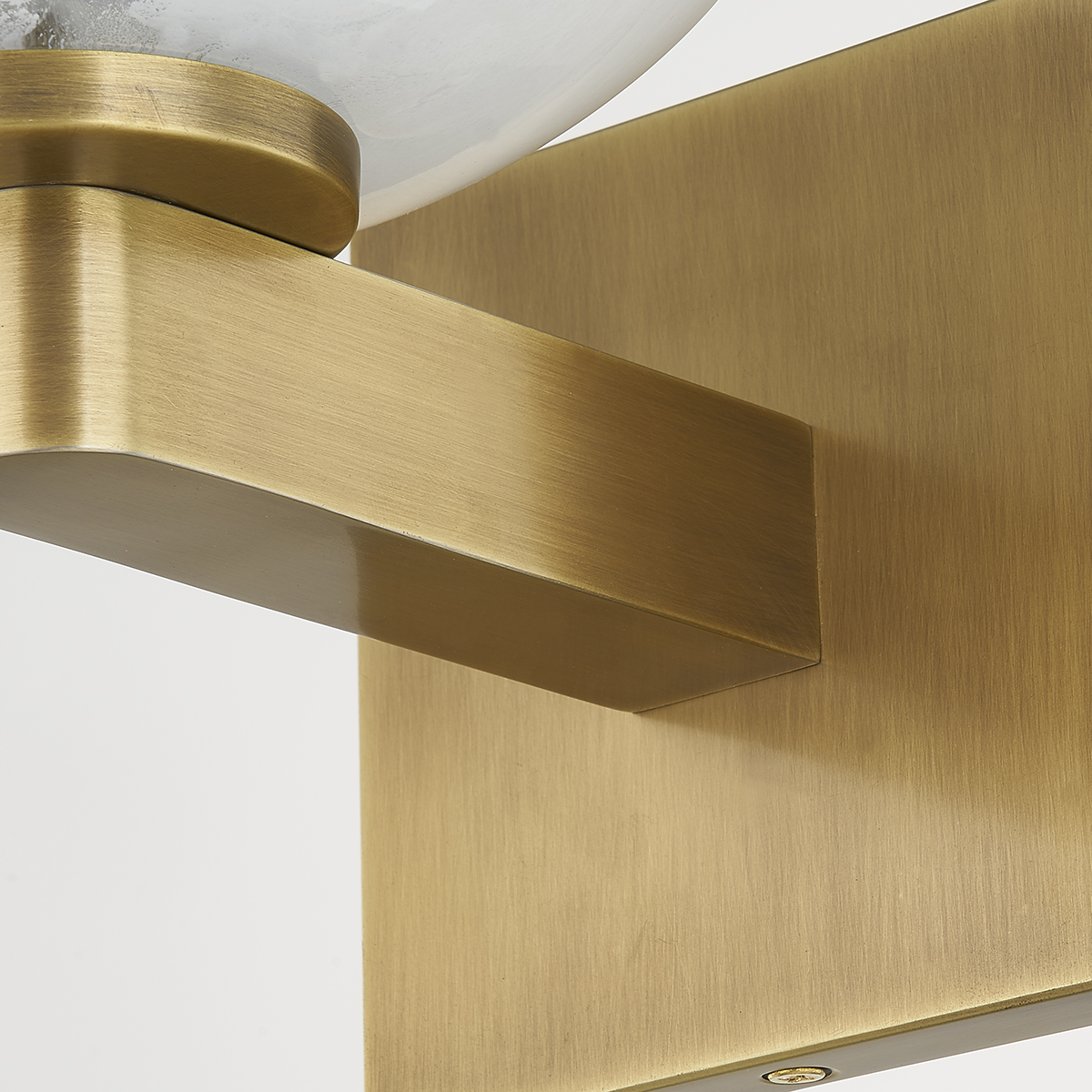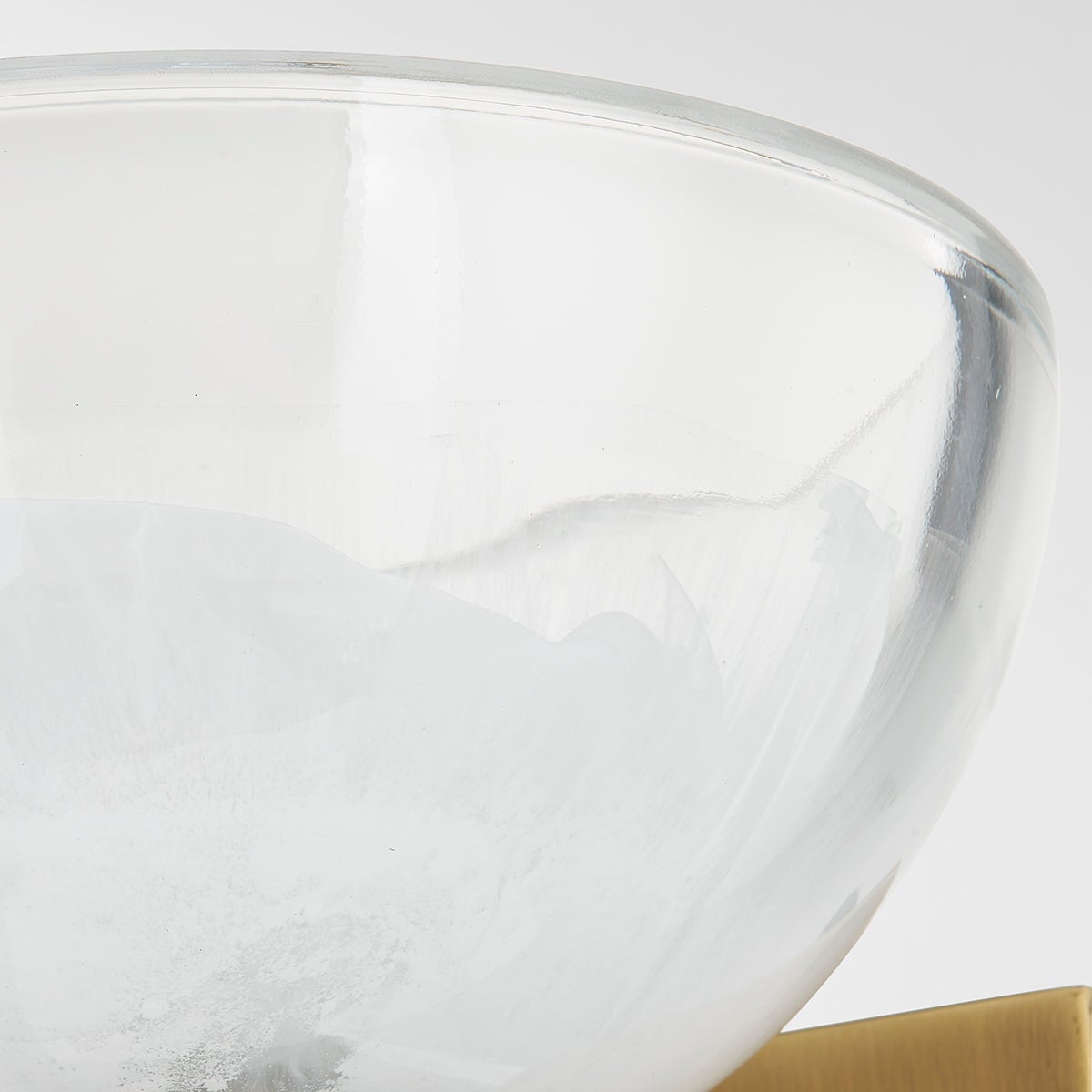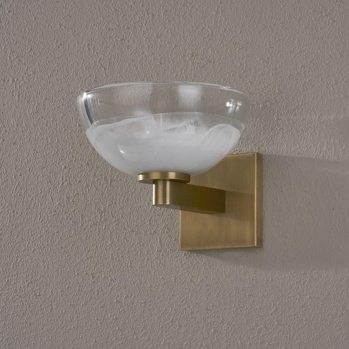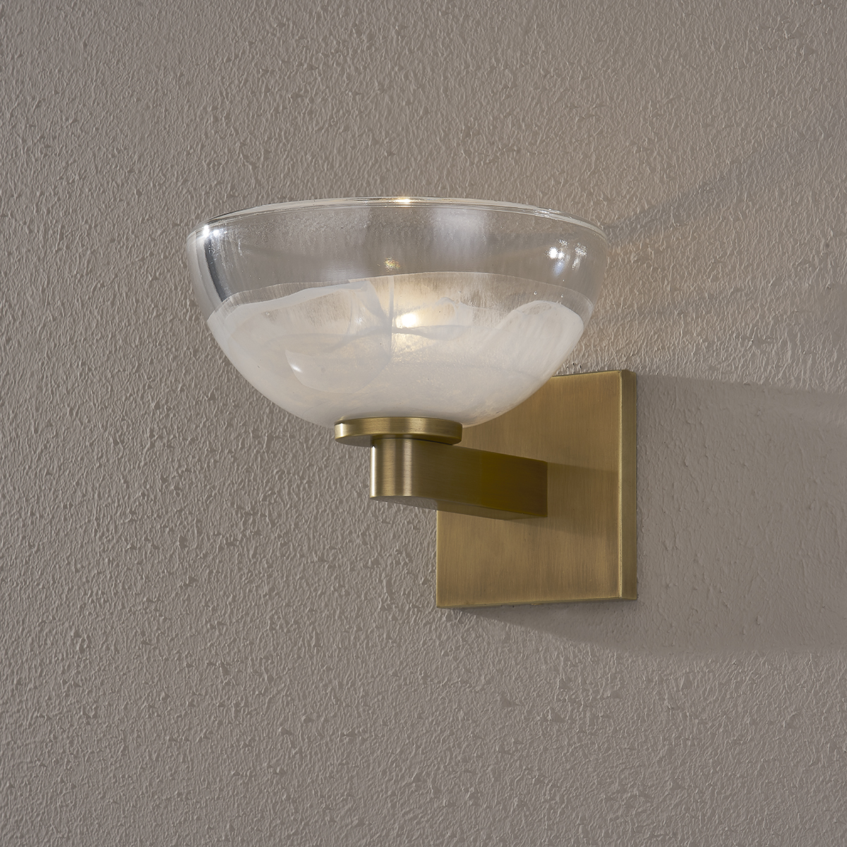 Valen's glass dome shade has a gorgeous two-tone effect. Light brings out the texture and detail of the glass and highlights its simplistic beauty. A Patina Brass arm and square backplate add to the modern look. This wall sconce can be mounted to provide uplight or downlight.