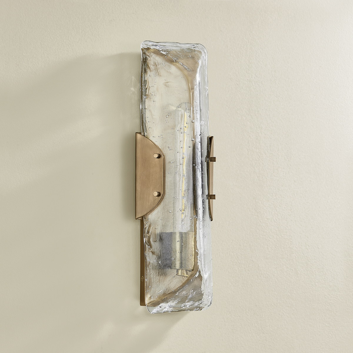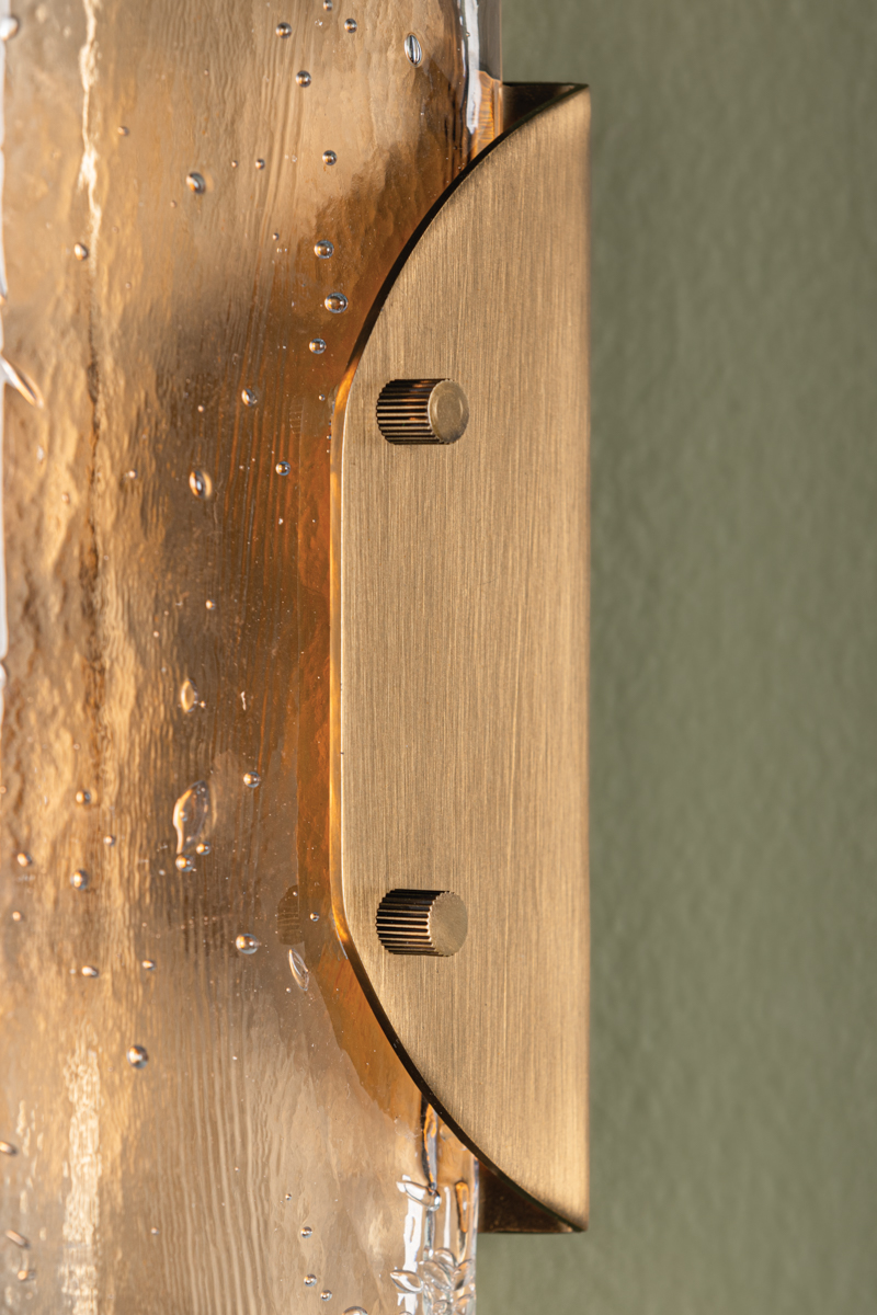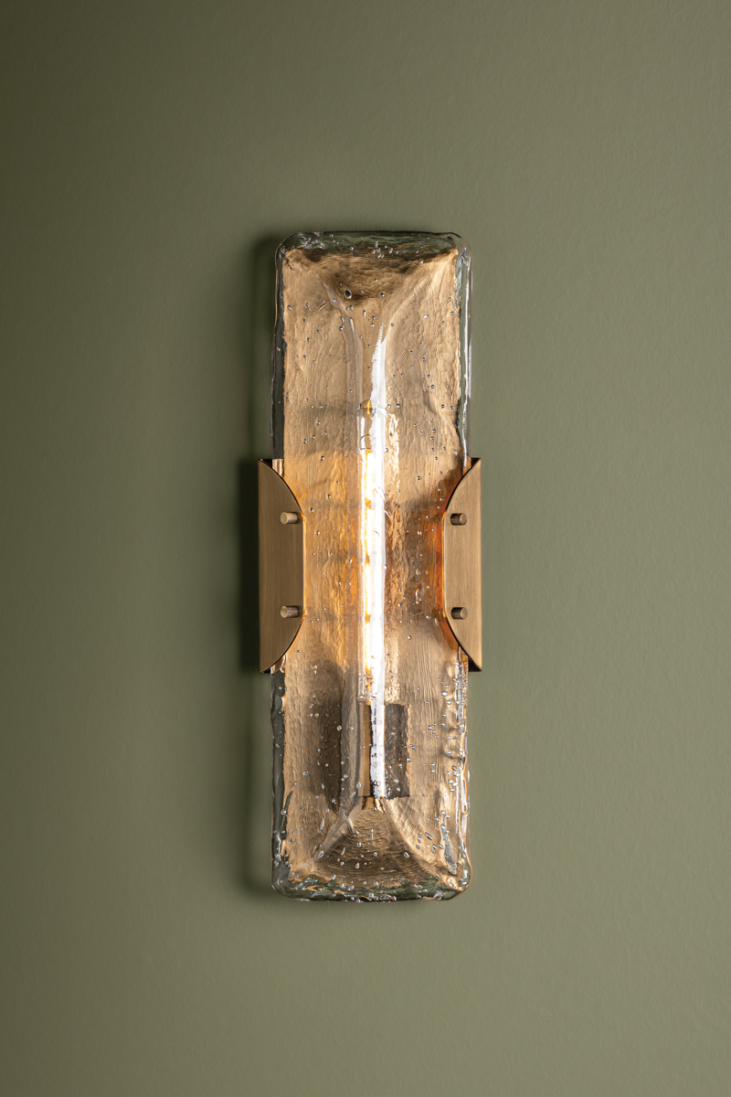 An architectural design with an ice-like sheet of glass, Nordic creates an immediate pop of interest in a space. When illuminated the delicate bubbles in the thick, cast glass sparkle. Supported by a Patina Brass framework, the minimal silhouette emits a luminous glow.