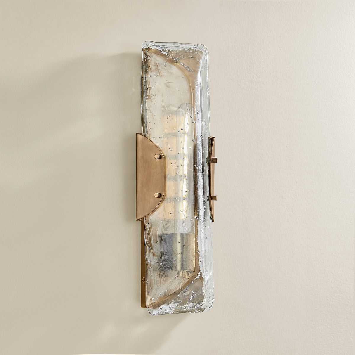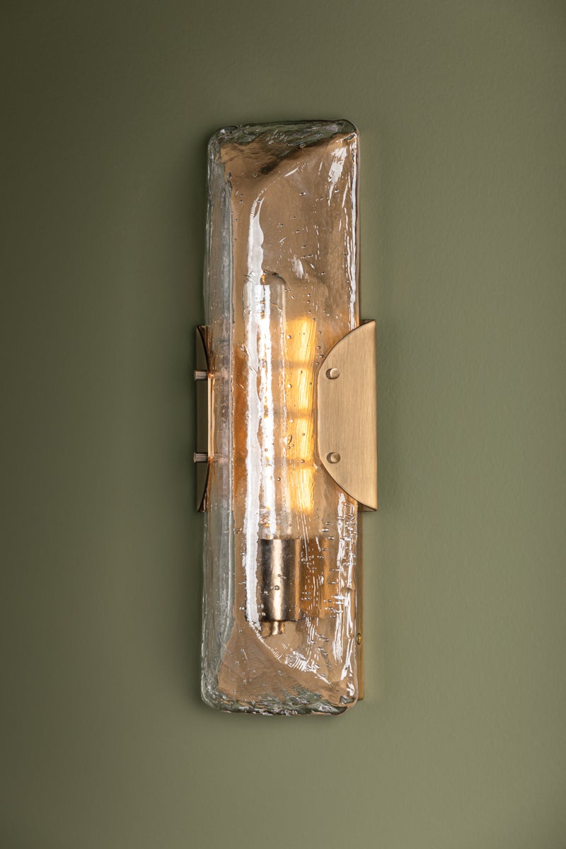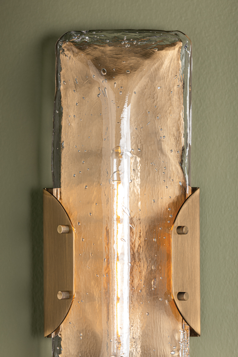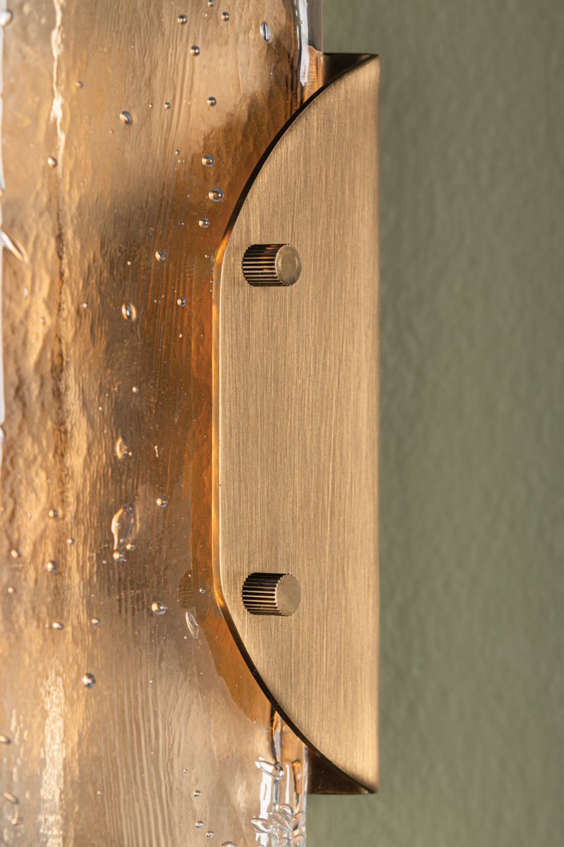 An architectural design with an ice-like sheet of glass, Nordic creates an immediate pop of interest in a space. When illuminated the delicate bubbles in the thick, cast glass sparkle. Supported by a Patina Brass framework, the minimal silhouette emits a luminous glow.