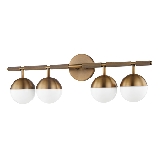 Taking inspiration from modern jewelry, Enson features architecturally suspended Opal Shiny Glass globes that lend a sophisticated feel to the piece. The silhouette is clean and modernist, but upon closer inspection, one notices the textural, knurled details. Available as a 3 or 4-light wall fixture, Enson is finished in warm, reflective Patina Brass or dark Bronze.