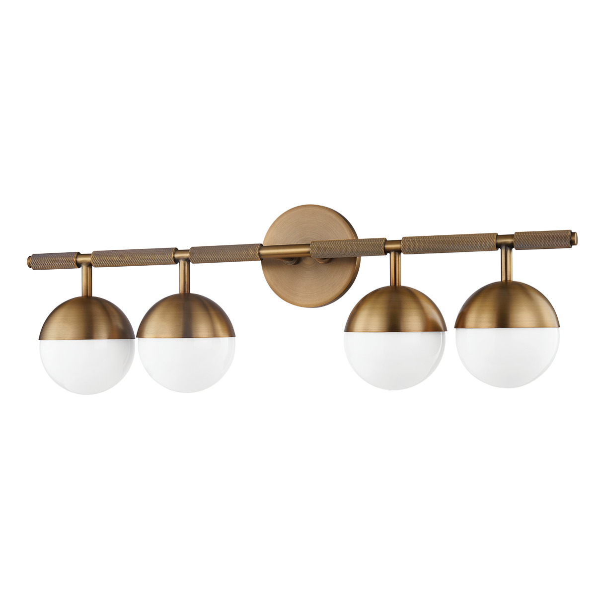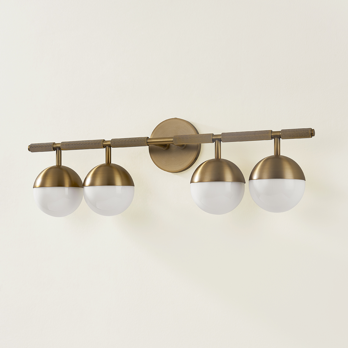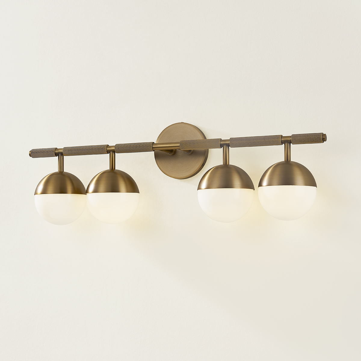 Taking inspiration from modern jewelry, Enson features architecturally suspended Opal Shiny Glass globes that lend a sophisticated feel to the piece. The silhouette is clean and modernist, but upon closer inspection, one notices the textural, knurled details. Available as a 3 or 4-light wall fixture, Enson is finished in warm, reflective Patina Brass or dark Bronze.