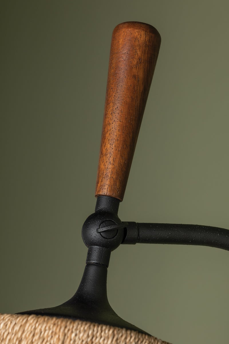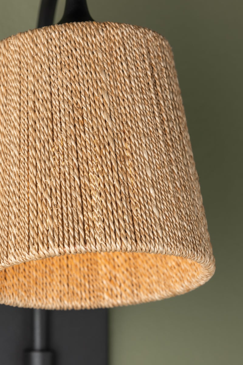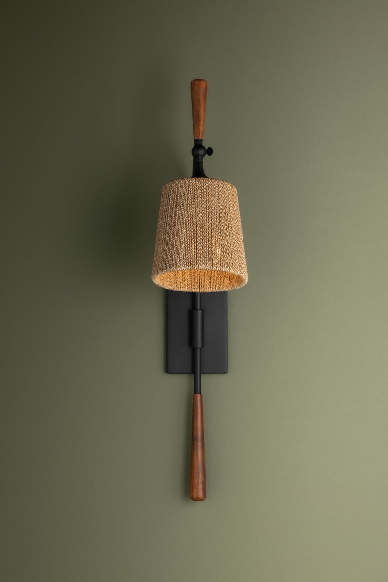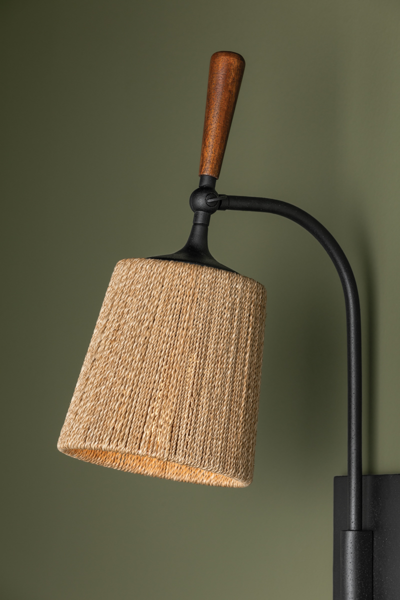 Natural and transitional design sensibilities meld in this mid-century modern-inspired sconce. Resembling a basket, the wrapped abaca cord shade balances the Soft Black frame with its light and airy appearance. The elongated arm is accented by acacia wood finials that enhance the warm, inviting presence of Harlyn.