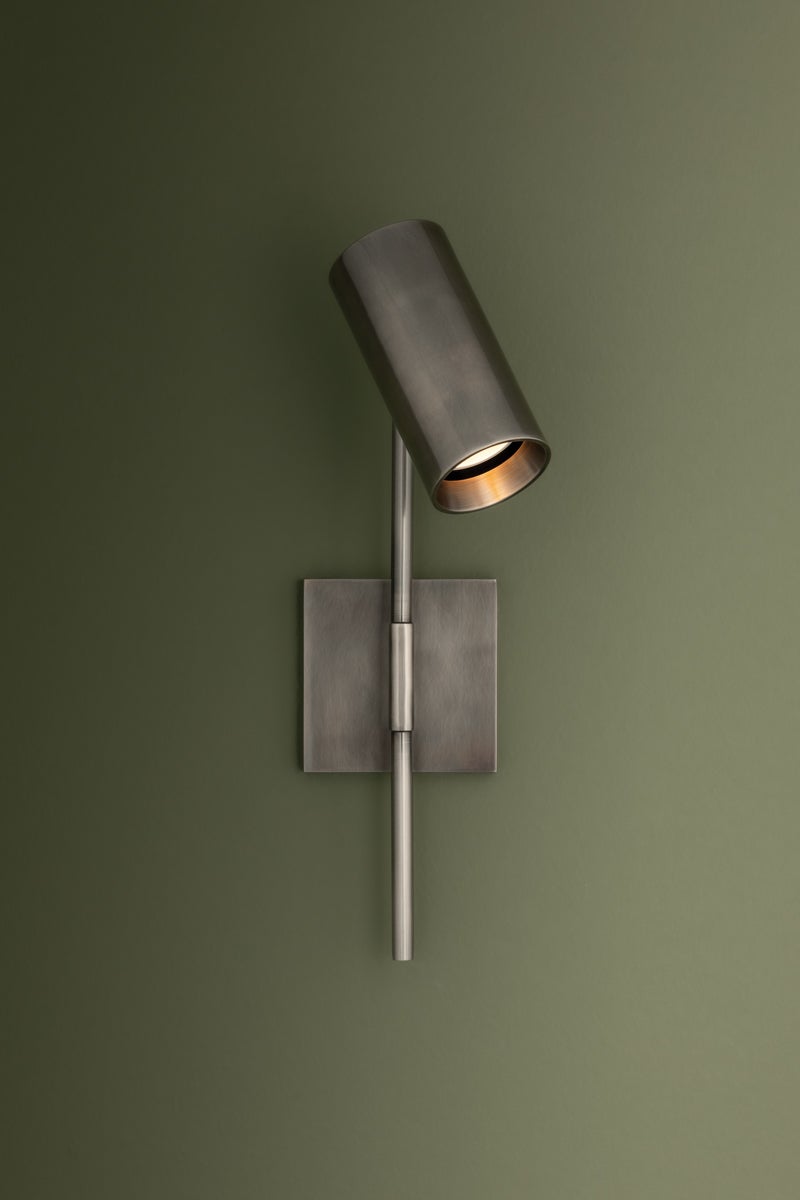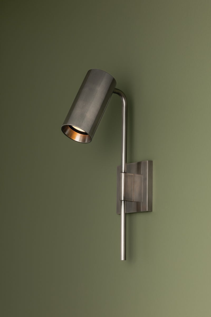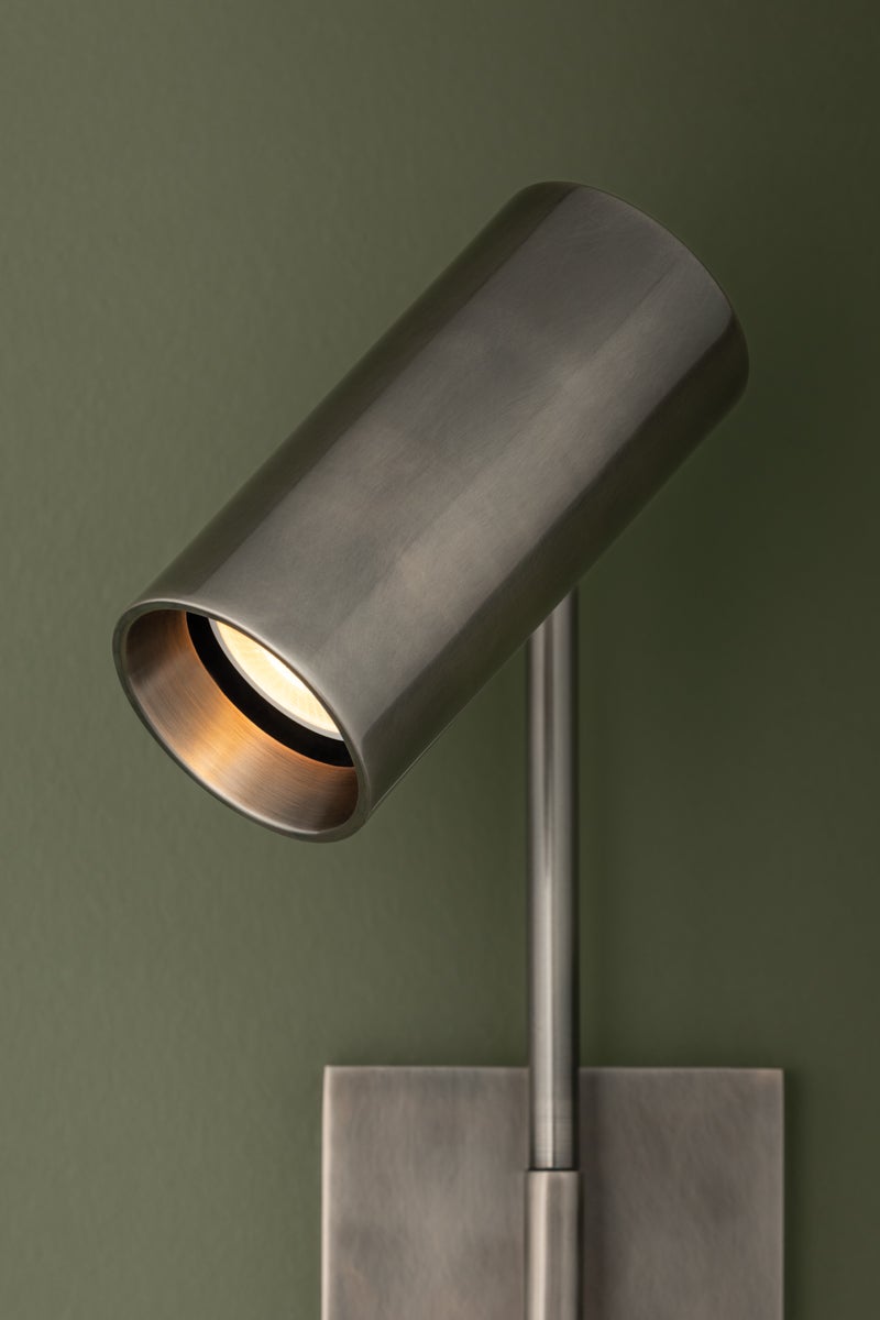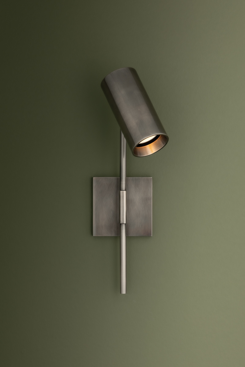 Gage's industrial-inspired design creates a sleek spotlight in contemporary interiors. Its minimalist, elongated arm supports a pivoting head, providing flexibility to adjust the light as needed. Available in a Patina Brass or Vintage Pewter finish, this frills-free sconce casts powerful illumination over a desk, table, or bedside.