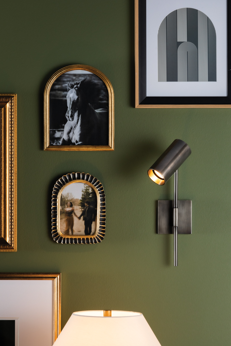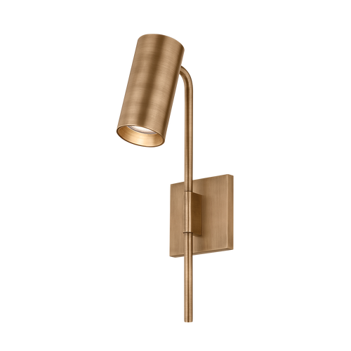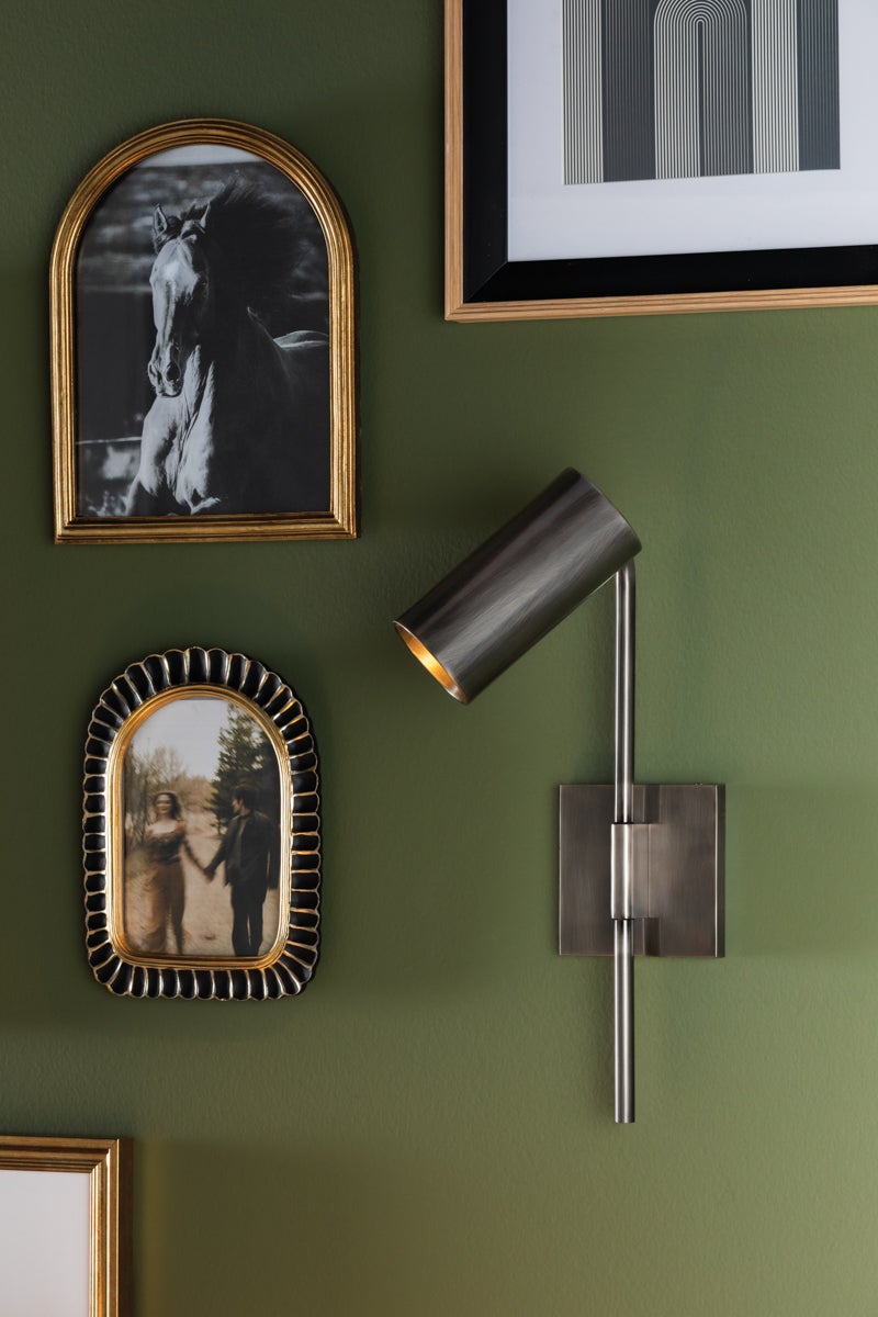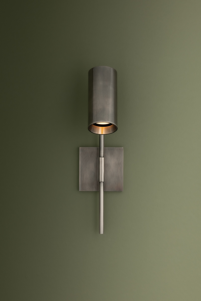 Gage's industrial-inspired design creates a sleek spotlight in contemporary interiors. Its minimalist, elongated arm supports a pivoting head, providing flexibility to adjust the light as needed. Available in a Patina Brass or Vintage Pewter finish, this frills-free sconce casts powerful illumination over a desk, table, or bedside.