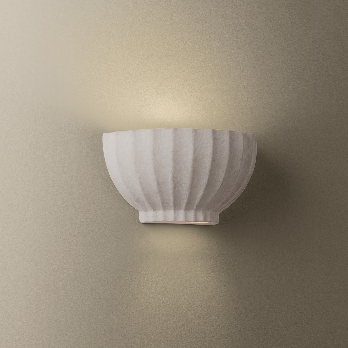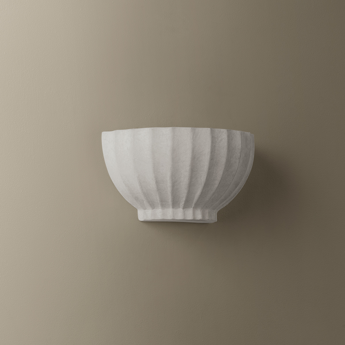 The classical design language of the Efron sconce is modernized through an earthy ceramic texture. Nodding to classical European architectural details, this petite wall light’s half-bowl shade features vertical flutes reminiscent of columns. Mounted flush to the wall, Efron casts light both up and down, creating a soothing, inviting ambiance wherever it is placed. Available in a Soft White or Ceramic Ivory finish.