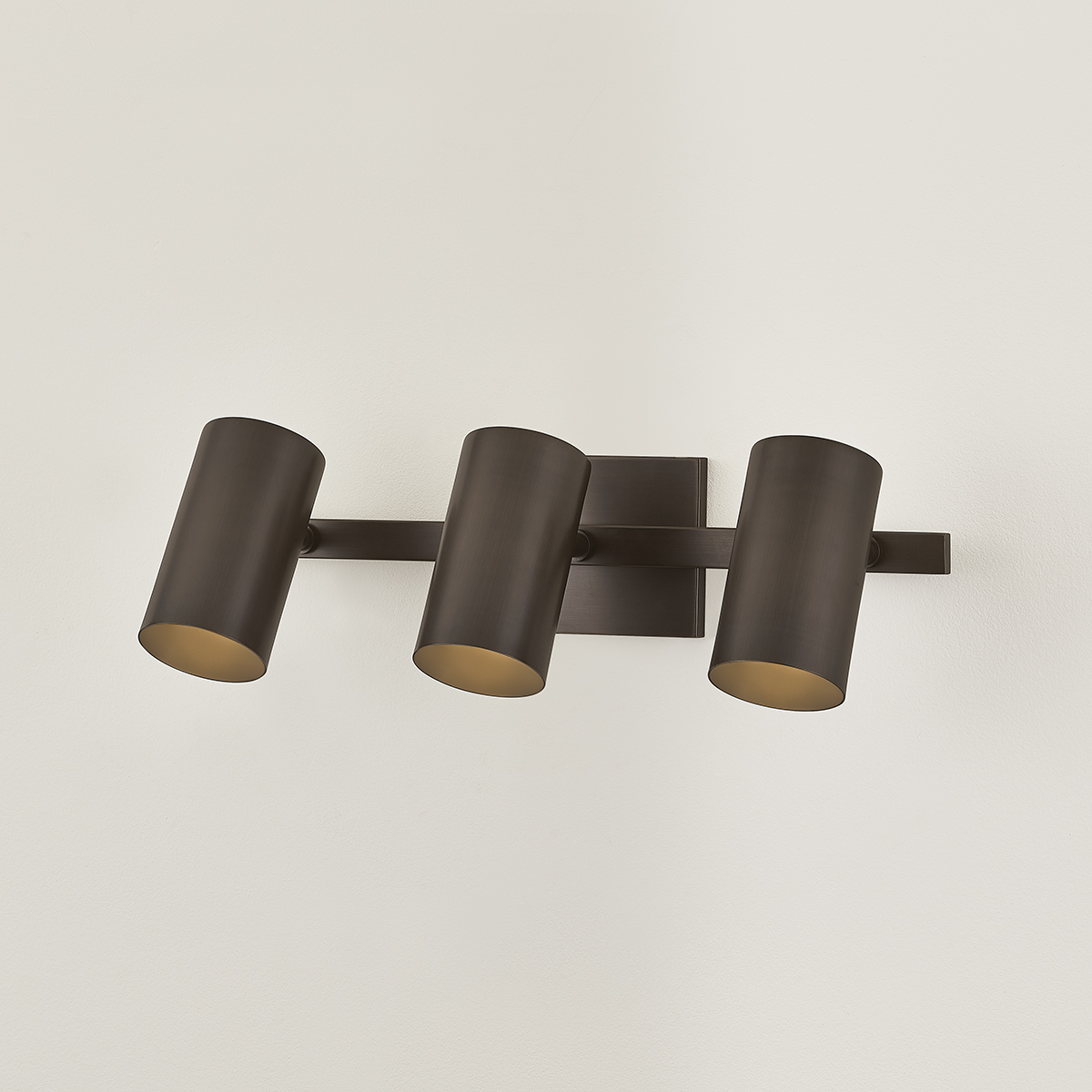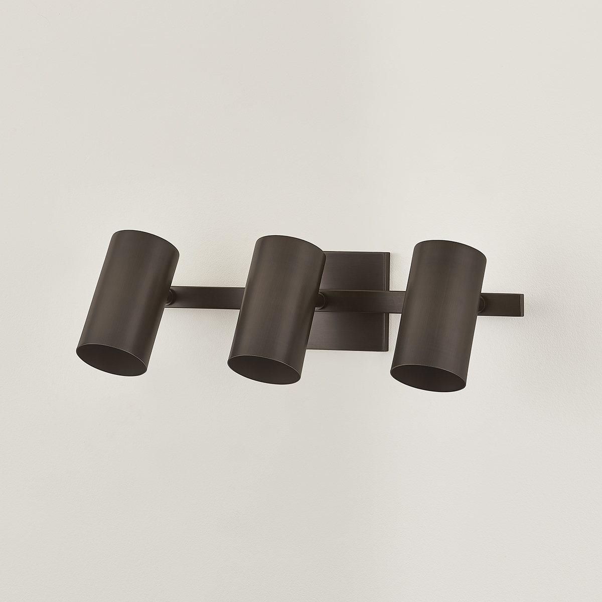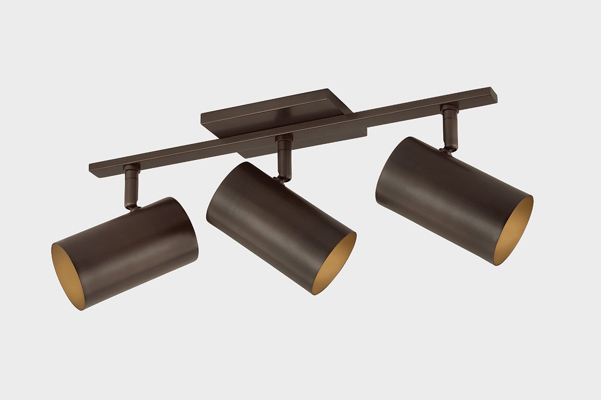 A sleek track light with a modern edge, Rueben is designed for a modern bathroom. Befitting mid-century style homes, the industrial-inspired silhouette incorporates right angles and conical shades. Articulating heads allow for precise directional positioning as needed. Rueben comes with 2 or 3 lights and a choice between Patina Brass and Bronze finishes.