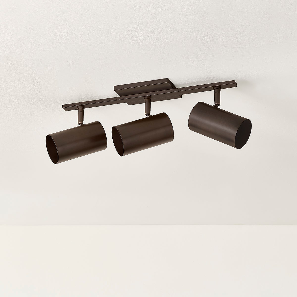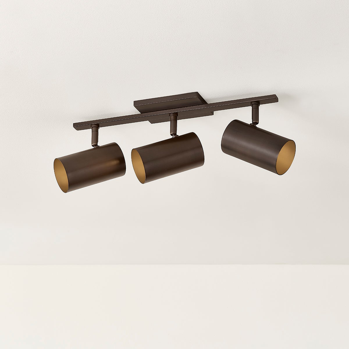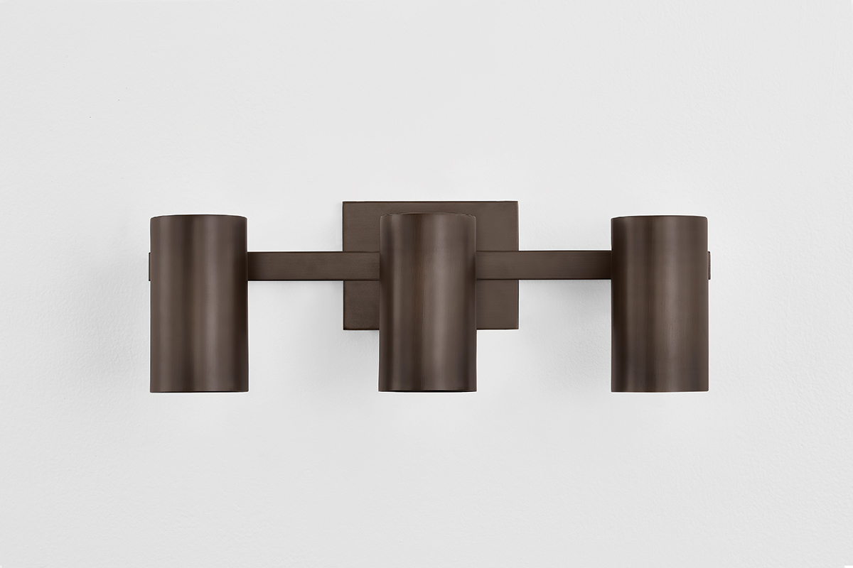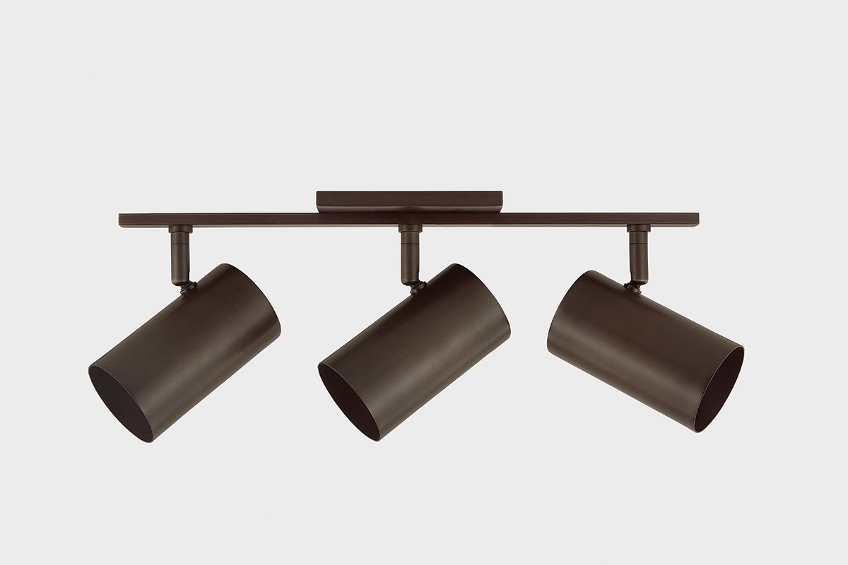 A sleek track light with a modern edge, Rueben is designed for a modern bathroom. Befitting mid-century style homes, the industrial-inspired silhouette incorporates right angles and conical shades. Articulating heads allow for precise directional positioning as needed. Rueben comes with 2 or 3 lights and a choice between Patina Brass and Bronze finishes.