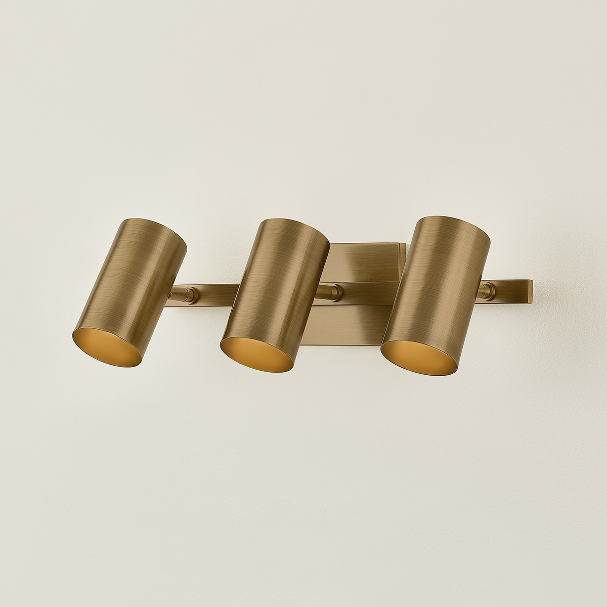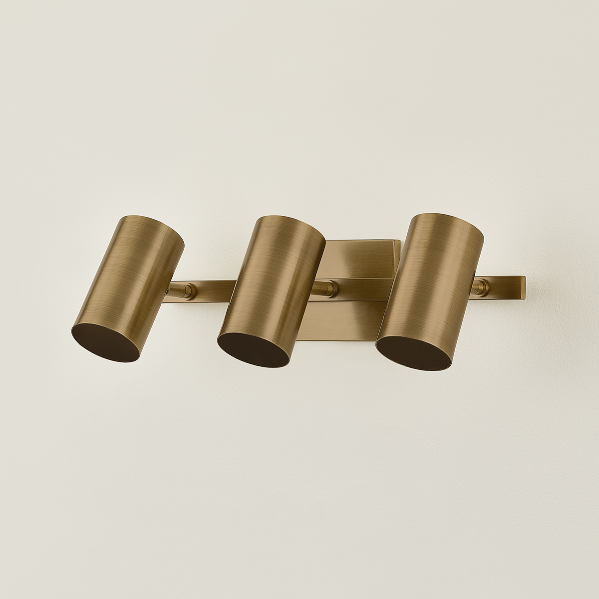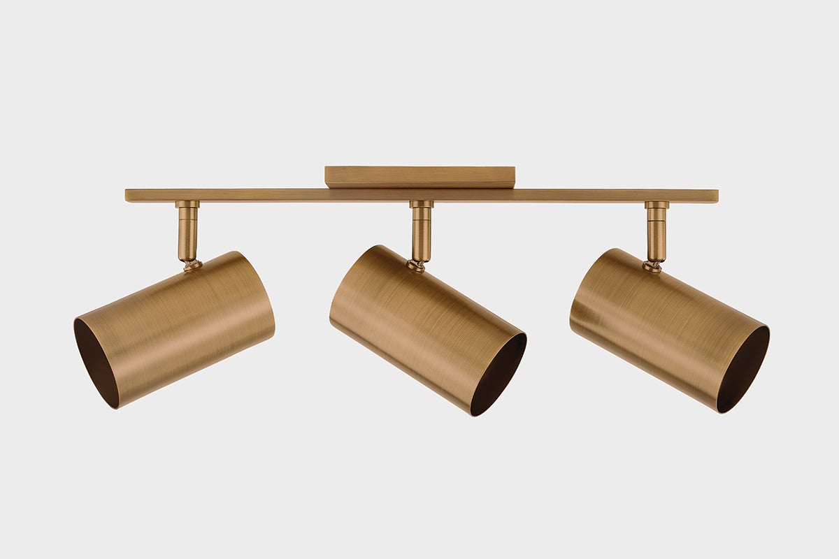 A sleek track light with a modern edge, Rueben is designed for a modern bathroom. Befitting mid-century style homes, the industrial-inspired silhouette incorporates right angles and conical shades. Articulating heads allow for precise directional positioning as needed. Rueben comes with 2 or 3 lights and a choice between Patina Brass and Bronze finishes.