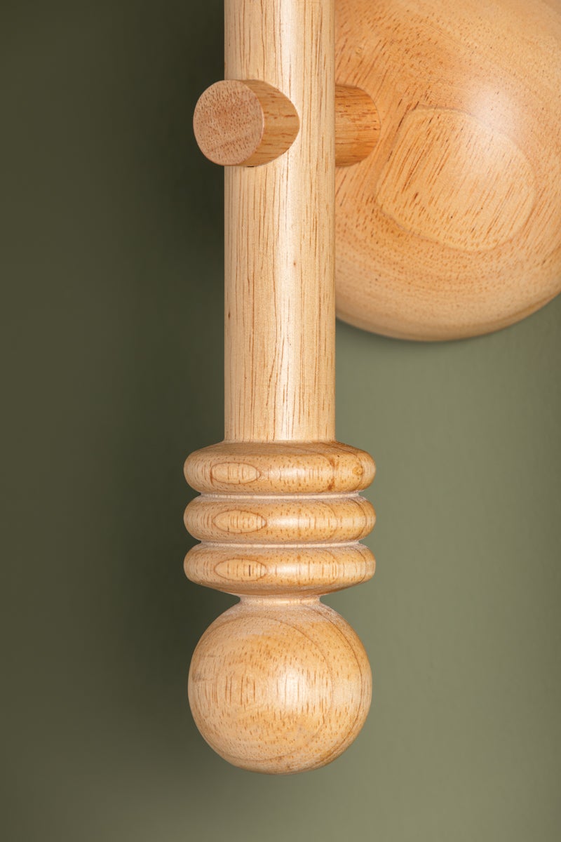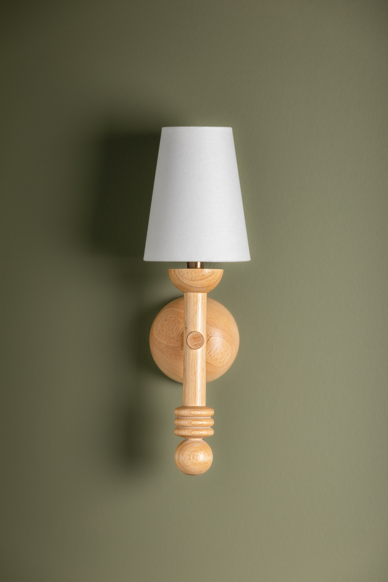 Inspired by folk art, this statement sconce has been carved from turned wood. The interplay of geometric forms creates a pop of interest while the petite proportions lend Iver versatility in various spaces. An off-white linen shade complements the overall natural, playful design ethos.