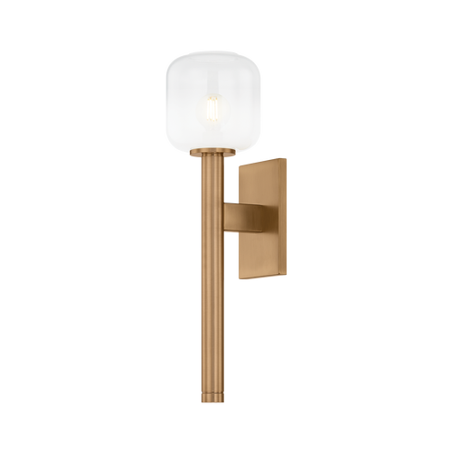 Industrial meets botanical in the torch-shaped Axton. The distinctive silhouette of this 1-light sconce relies on clean lines to give it a mechanical feel. A cloudy Sfumato glass shade adds a soft note to balance the hard edges. Available in a Vintage Pewter or Patina Brass finish, Axton resonates with modern and transitional styles.