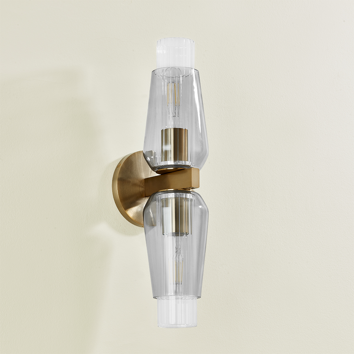 Playing with texture and form, Rex features a striking layered glass silhouette with a clear fluted interior and a smoke exterior. The darker glass creates an artful and soft diffusion of light while harmonizing with the rich hues of the Patina Brass finish on the metalwork. Rex is available as either a 1 or 2-light sconce.