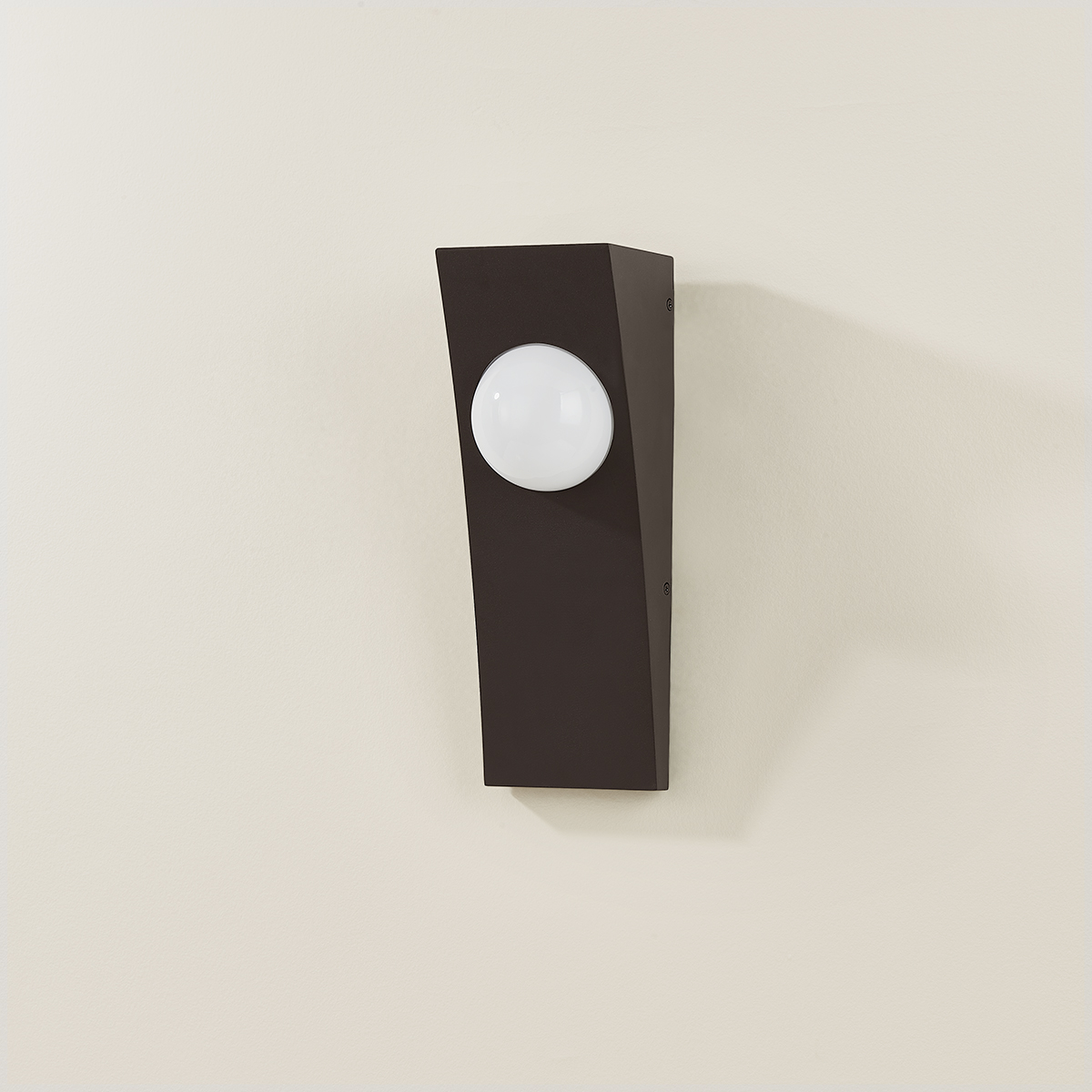 Nested within a minimal rectangular frame, the glowing orb of Victor creates a celestial impression. The mixed materiality of Opal Glass set against the Textured Bronze finish of the frame is clean and dramatic, while the concave curve of the frame adds dimension. Available in two sizes, this simple, sleek fixture can be used to illuminate any exterior space.