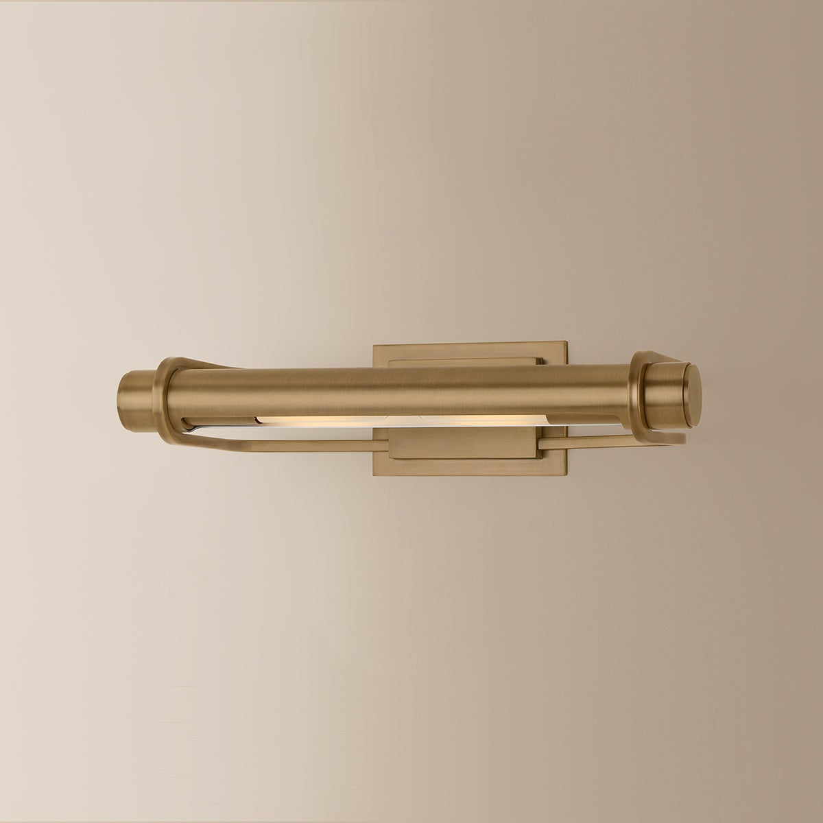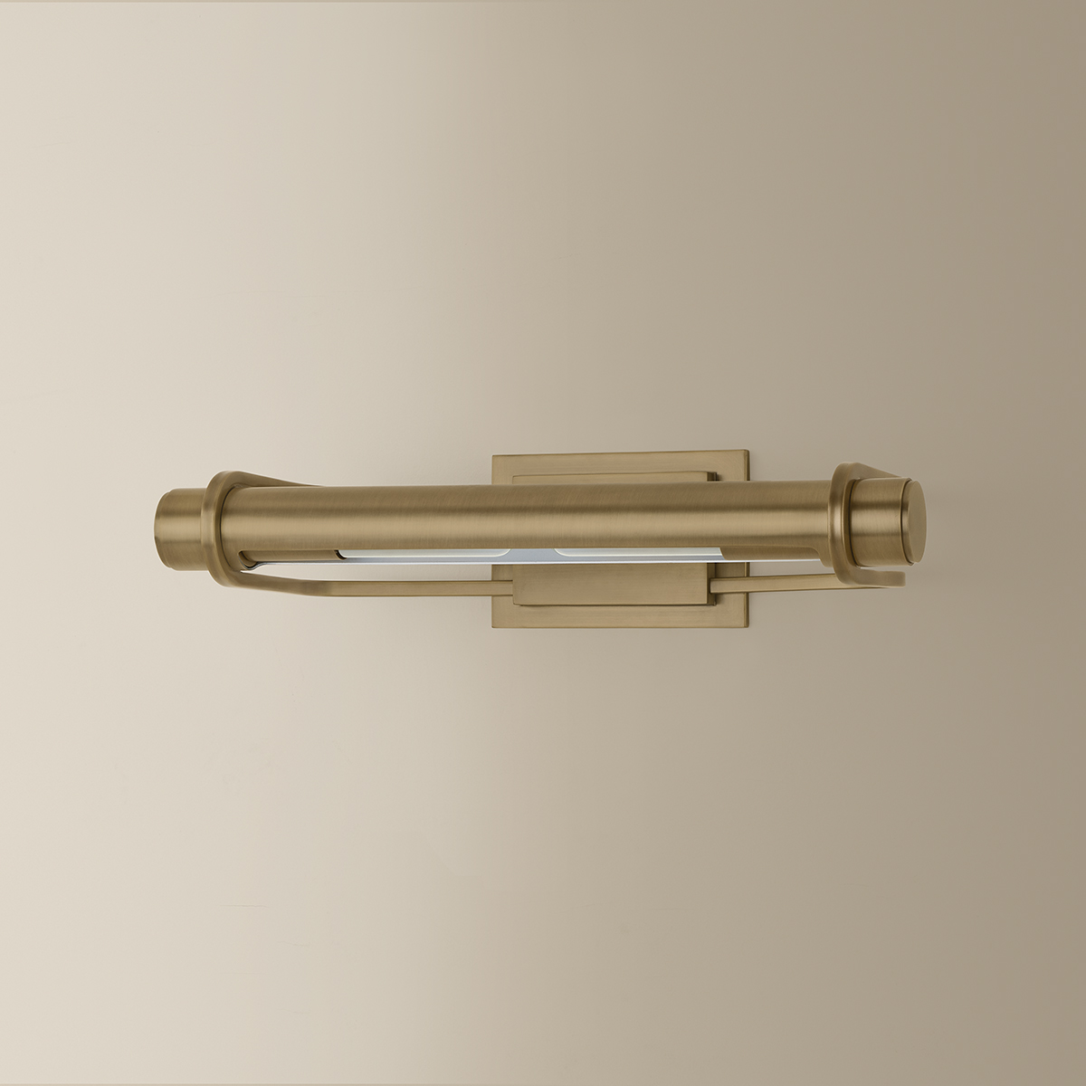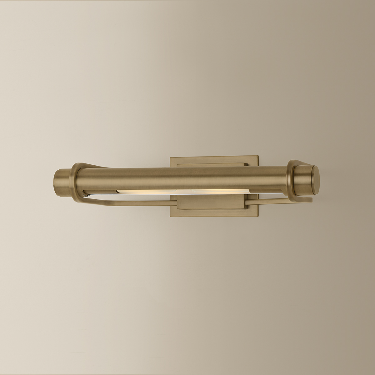 The Caspian family draws inspiration from soft hardware forms, translating sweeping metal lines into a tailored picture light. A continuous arm encases the tubular shade, balancing function with form. Finished in Patina Brass and available in two sizes, it casts a focused beam across artwork or architectural details.