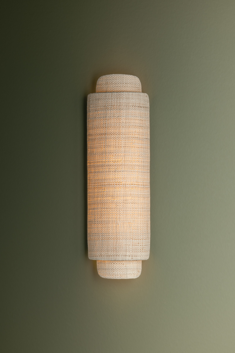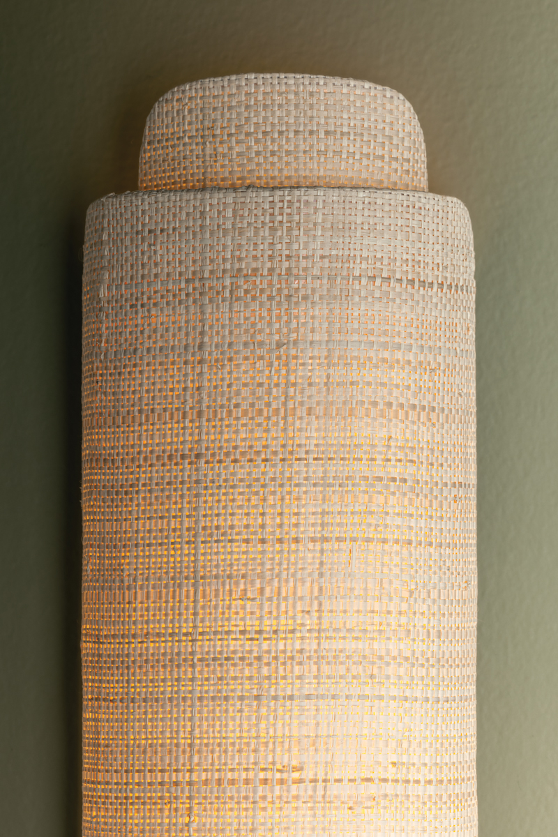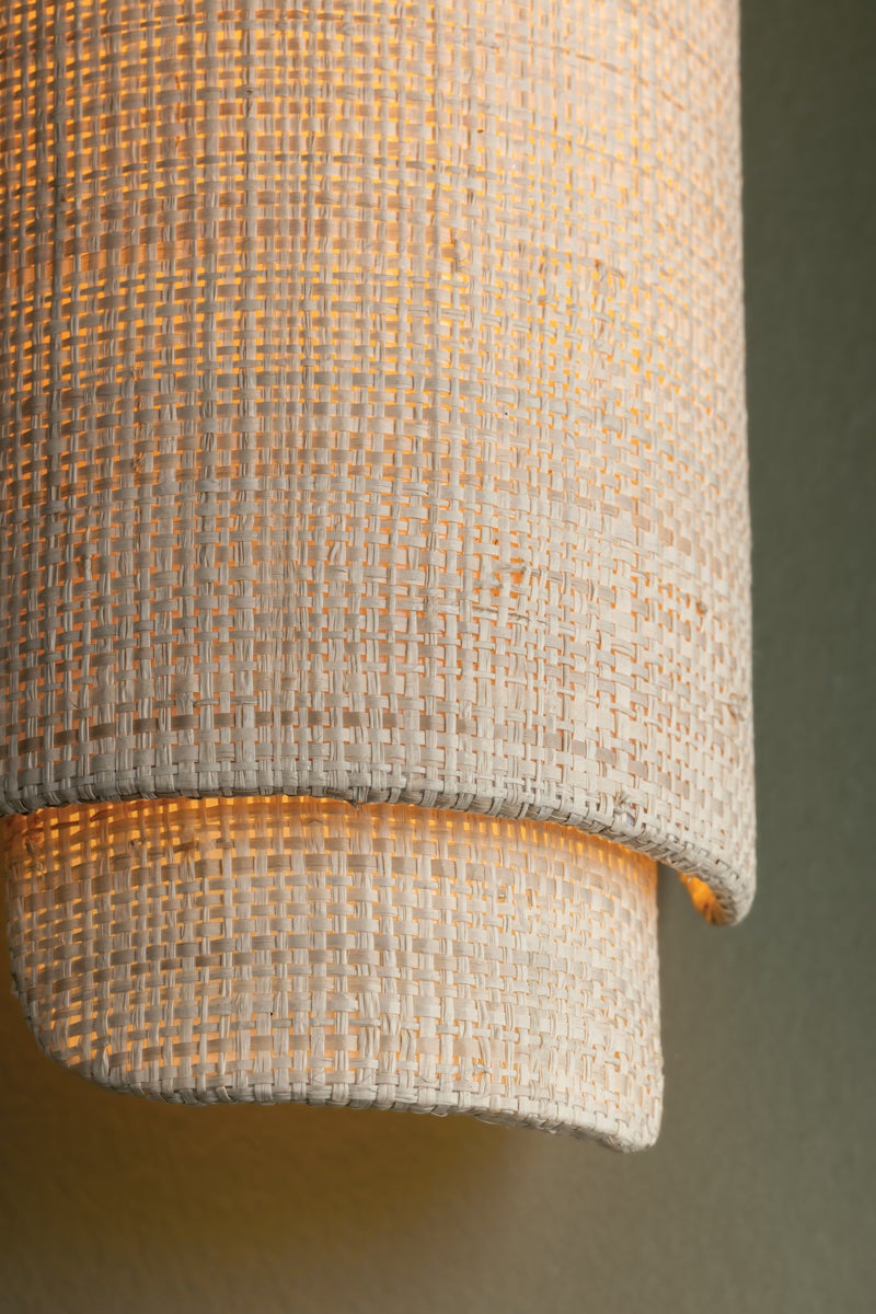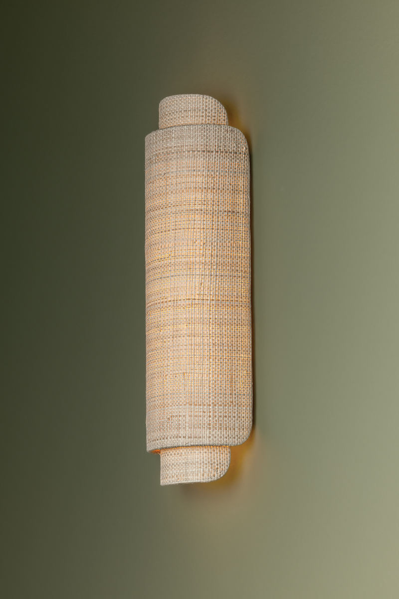 Crafted from natural Saguran Weave, the Seldon sconce adds a dose of textural interest to any space. Its minimalist design features two overlapping folded shades with softly curled, leaf-like edges. Seldon emits a warm, diffused light through its translucent shades and out from both ends.