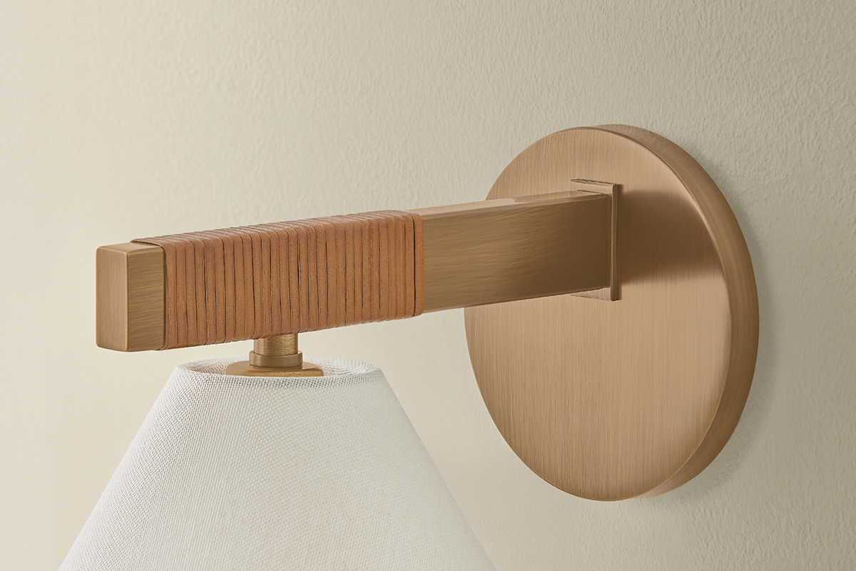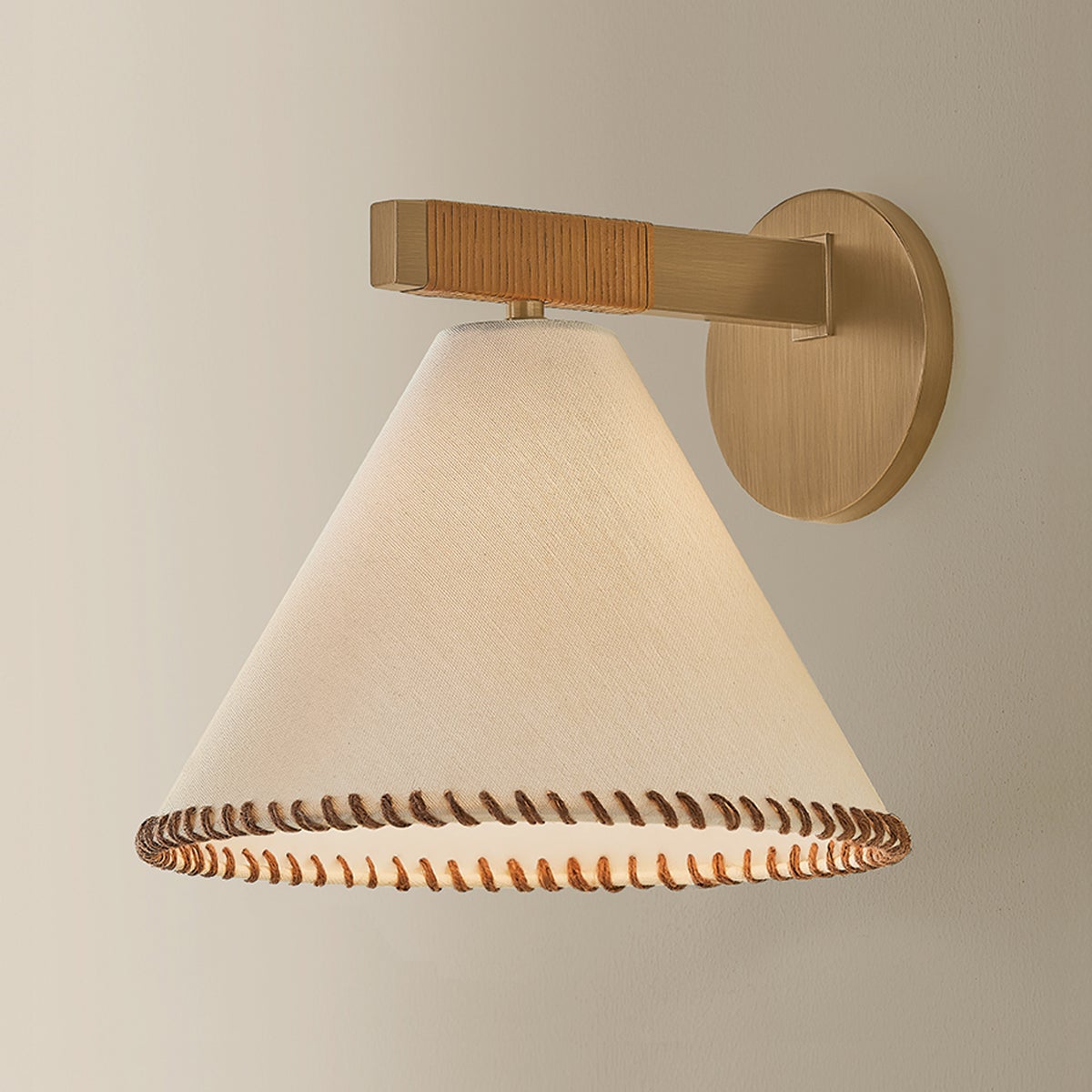 The architectural design language of the Stoney family is softened by its unique material qualities. Large conical white linen shades are edged with contrasting whip-stitching, echoing the natural jute wrap details along the Patina Brass frames. Available as a 1-light sconce, 1-light pendant, 5-light chandelier, and 1-light floor lamp, Stoney is an ode to craftsmanship.