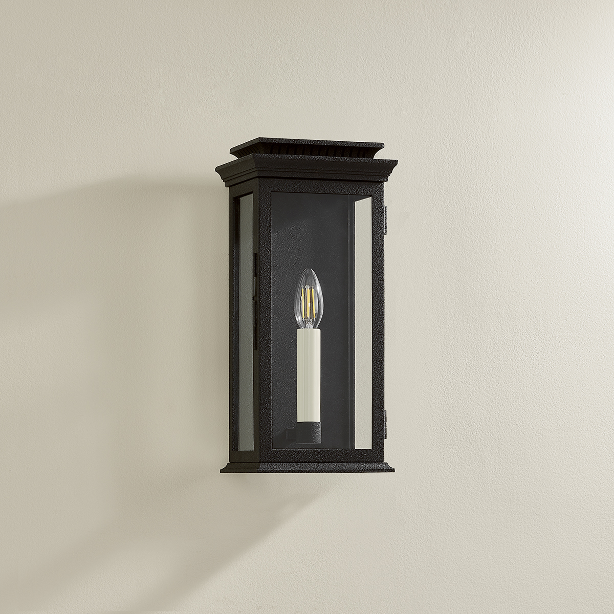 Drawing inspiration from a vintage lantern, Louie features a simple box shape with elevated details. Off-white candlesticks glow from within the frame, which is defined by three glass panels and a black backplate. The decorative chimney perched atop adds character to this transitional wall light. Louie is available in two sizes in a Forged Iron finish.