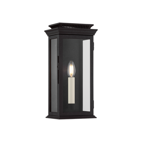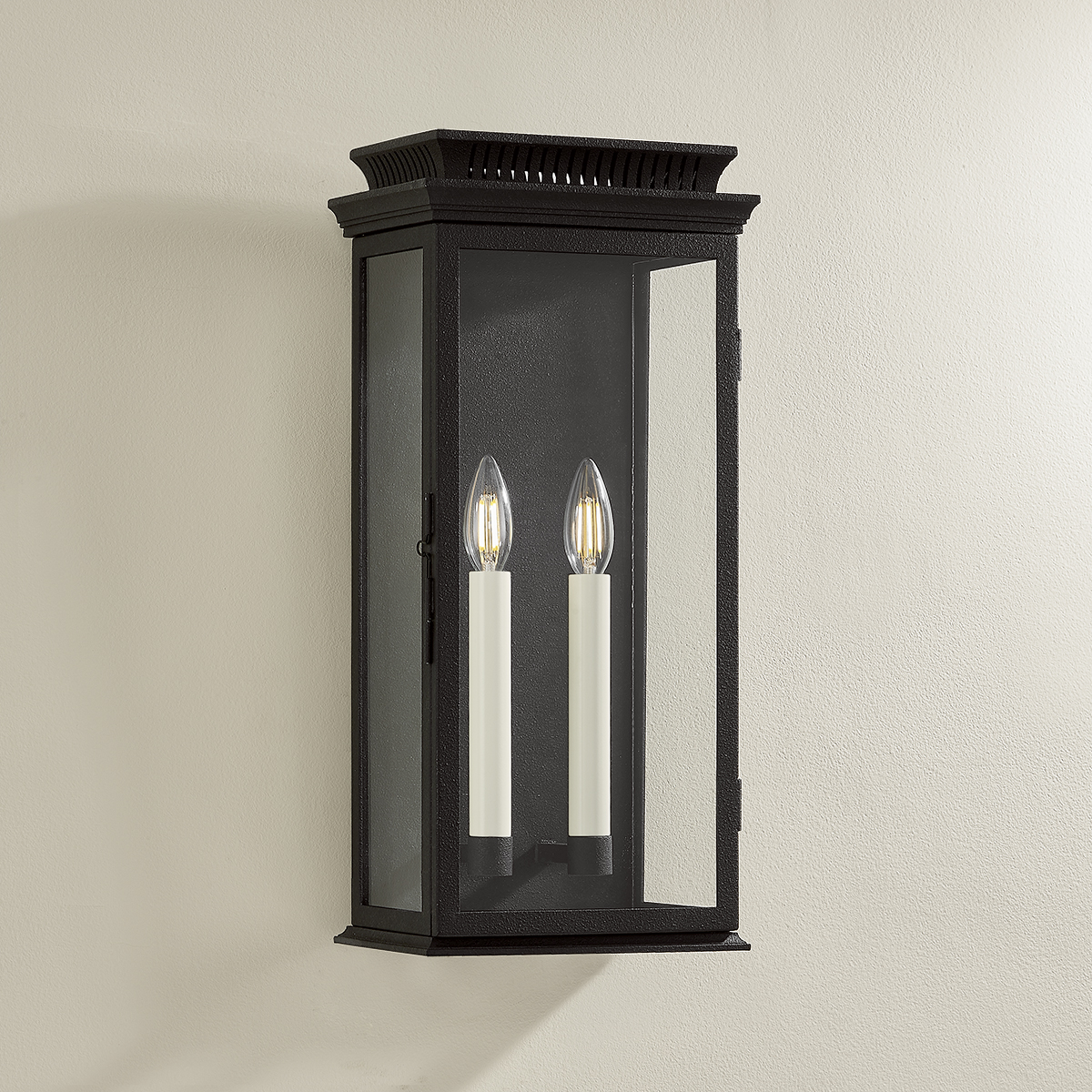 Drawing inspiration from a vintage lantern, Louie features a simple box shape with elevated details. Off-white candlesticks glow from within the frame, which is defined by three glass panels and a black backplate. The decorative chimney perched atop adds character to this transitional wall light. Louie is available in two sizes in a Forged Iron finish.