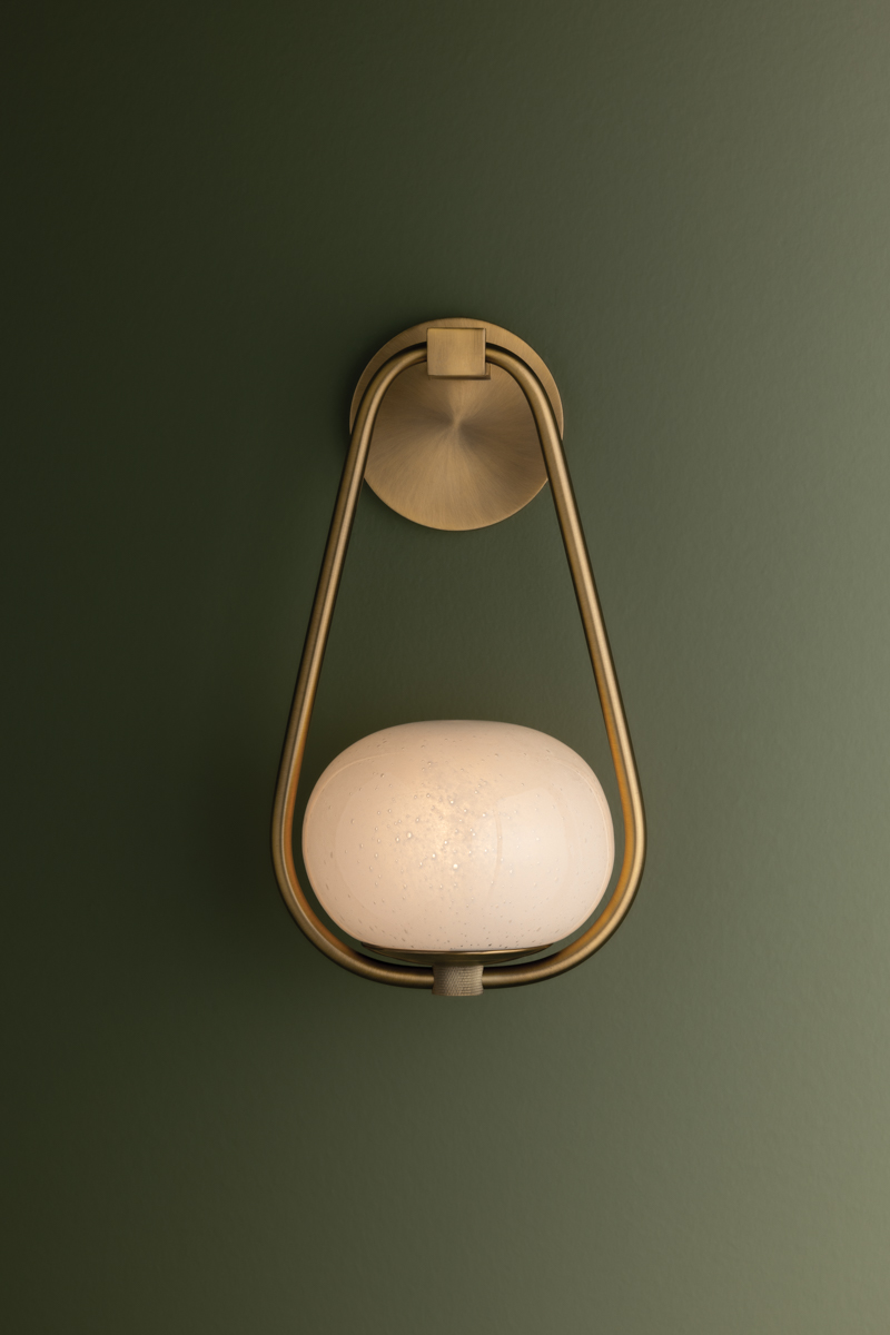 The jewelry-inspired Decker cradles a seedy cloud glass shade like a pearl in an earring. Looped over the arm, a large racetrack link creates the illusion of balance. The slightly compressed form of the shade adds an artistic, organic note, while the Patina Brass finish leaves a softly vintage impression.