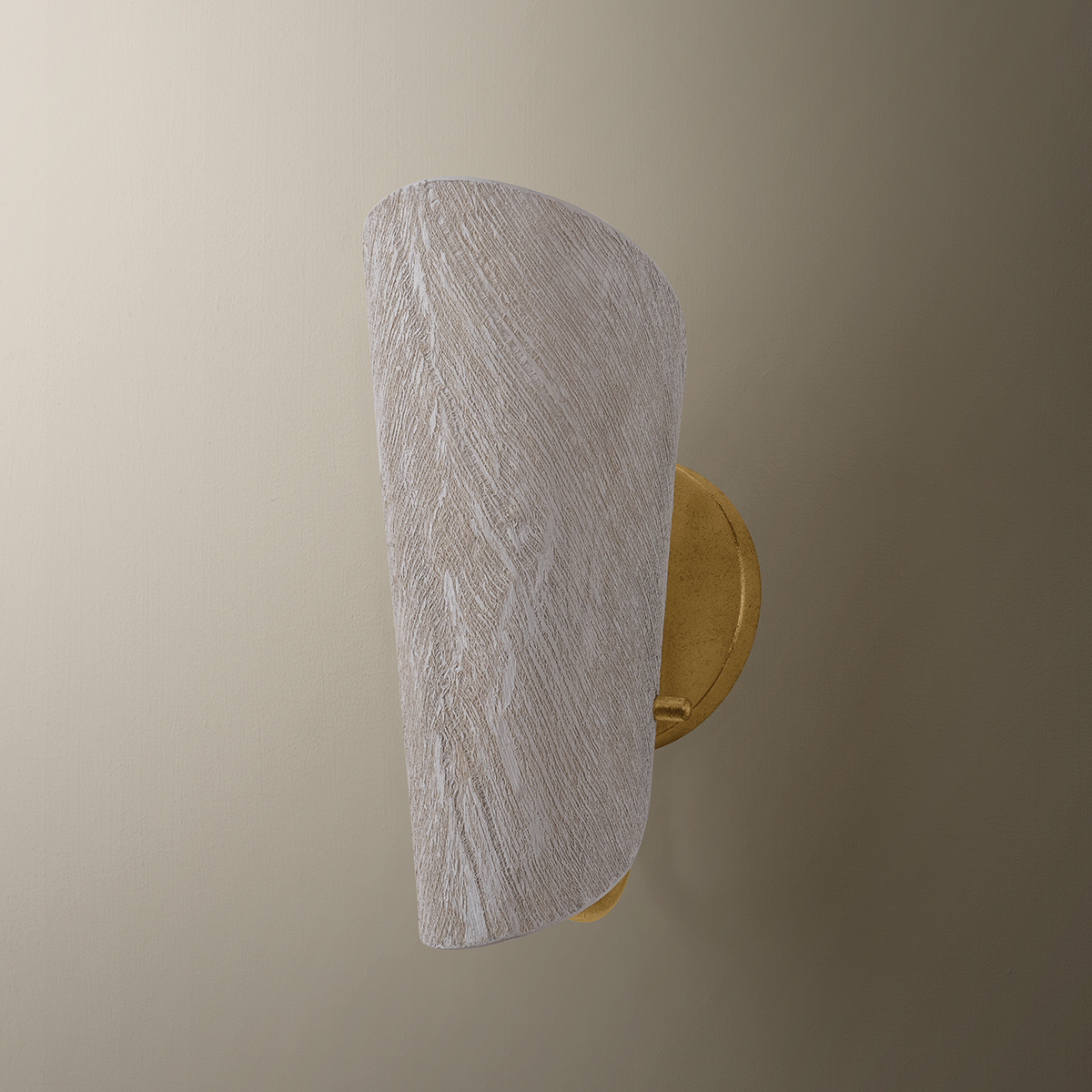 The mobile-inspired Ken family channels kinetic energy with natural materials and curved silhouettes. Each laminated coconut fiber shade wraps around a light source, highlighting the organic texture of the airy, sculptural forms. A Vintage Gold Leaf frame introduces a note of polish. Available as a 1-light sconce and a 6-light chandelier.